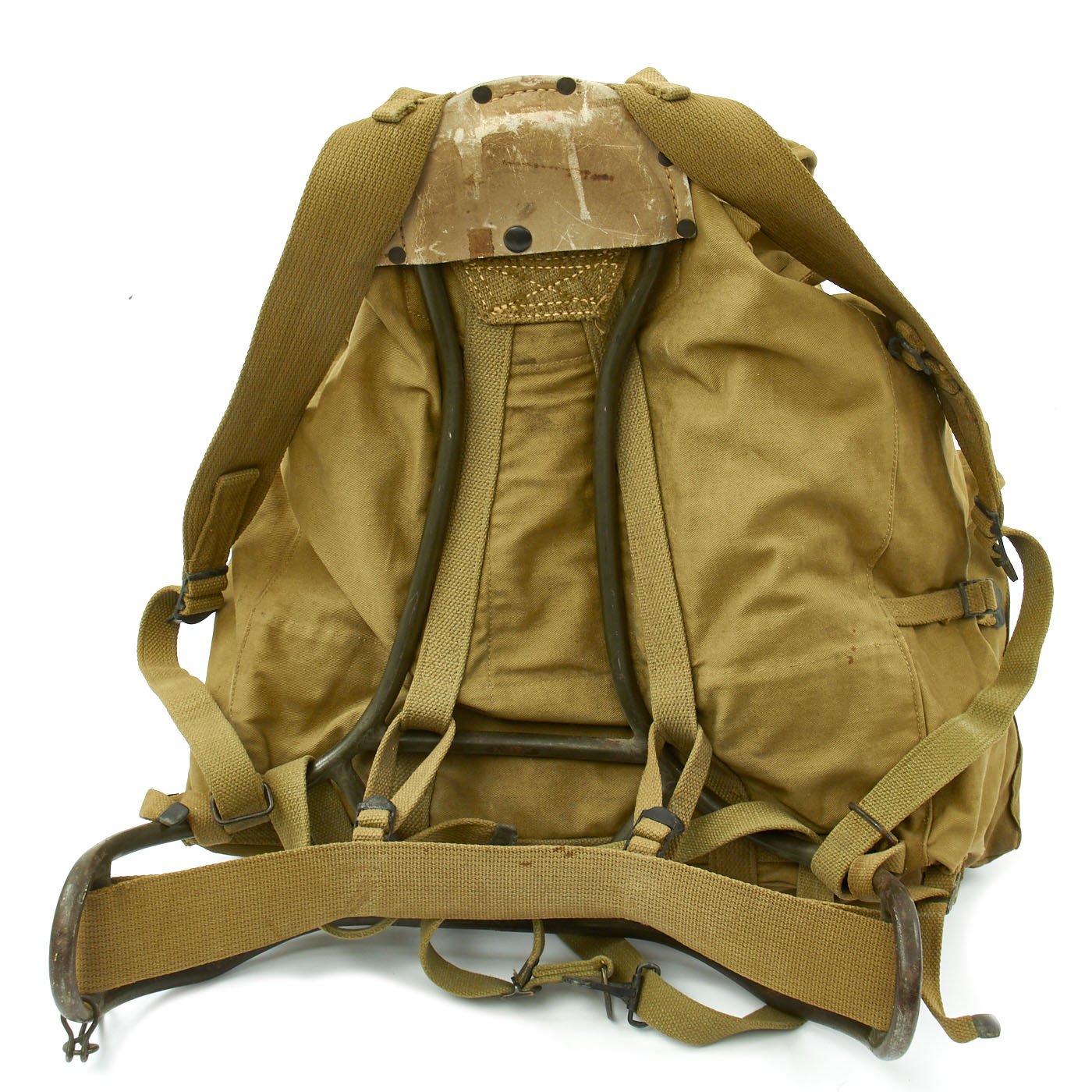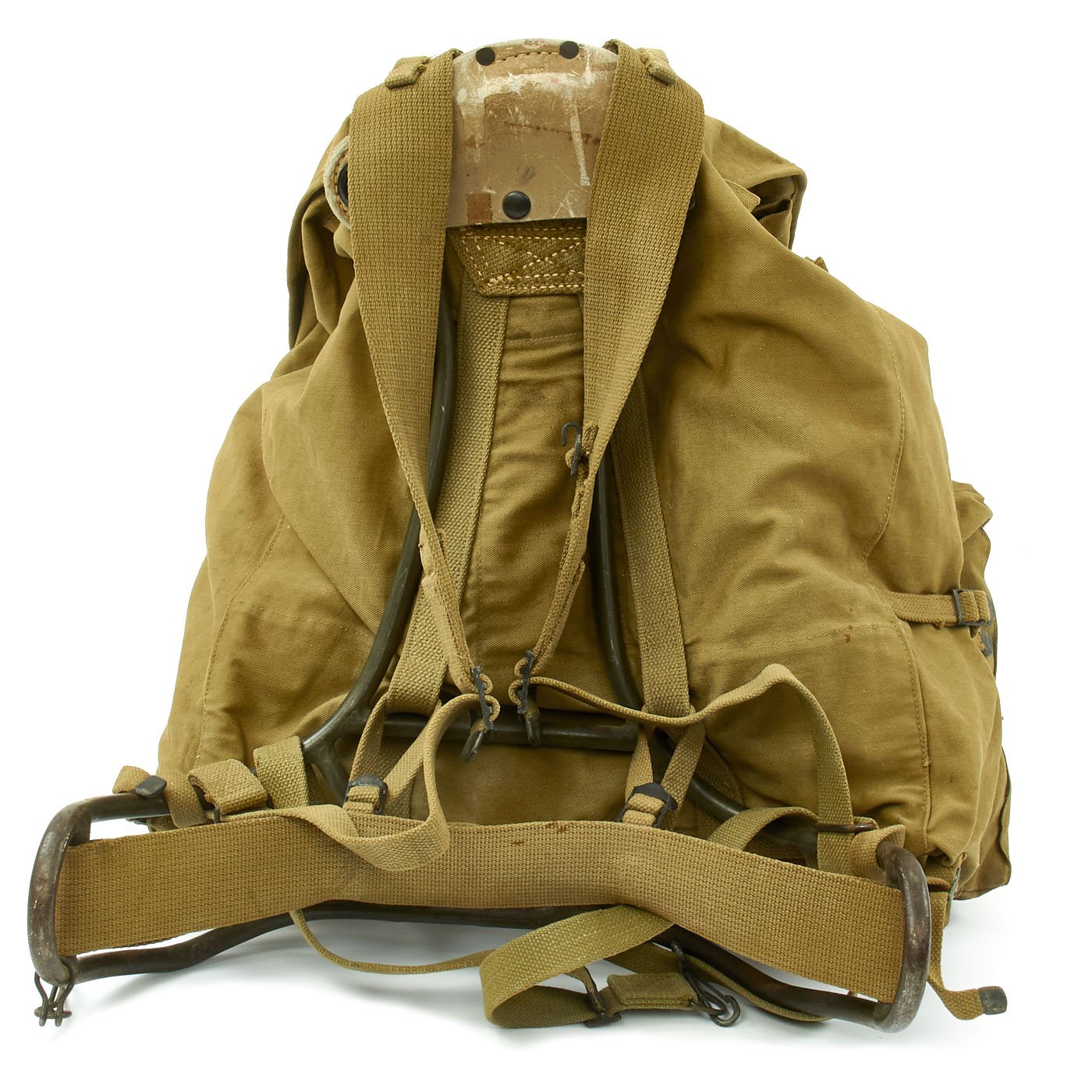 Original Item: Only One Available. This is a very good condition U.S. Army M1942 Mountain Backpack - Rucksack with a metal frame, officially designated specification J.Q.D. 88B by the Jeffersonville Quartermaster Depot. This was one of several designs developed by the J.Q.D. in order to provide a better pack solution for mountain troops. The standard combat rigging haversacks were unfortunately insufficient for carrying the amount of gear needed when there were no vehicles to carry supplies. As such they designed these metal frame packs to solve the issue.