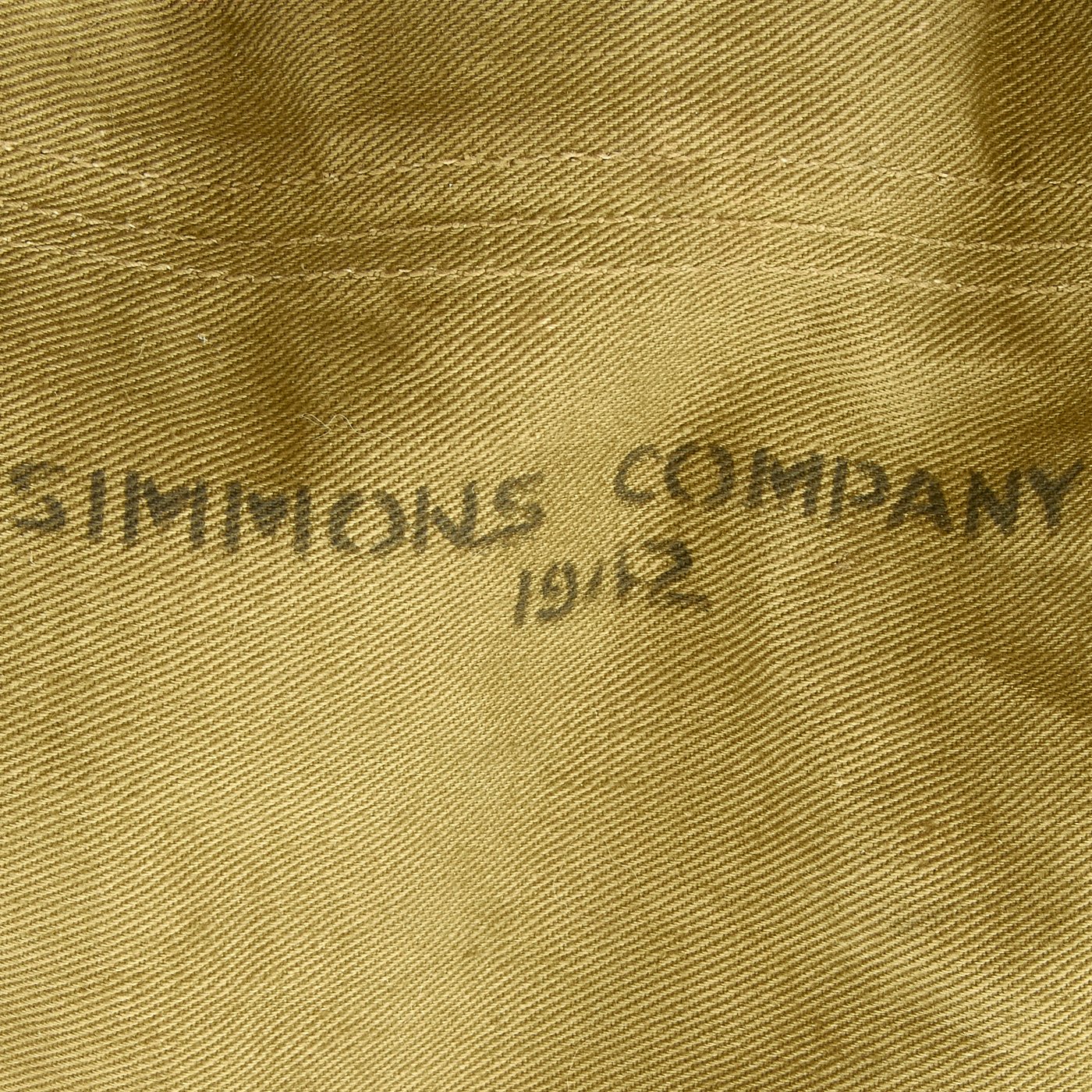 The J.Q.D. 88B was the third version of this design, and one of the most widely produced. The metal frame itself measures about 17 1/2" wide x 21" tall x 6" deep, so once fully loaded this was a large pack indeed. This pack was manufactured by SIMMONS COMPANY in 1942, as marked on the inside of the top flap. Per records, the 88B was the only version produced by this company, and they only produced it during 1942. Other companies continued production into 1943, some with the updated J.Q.D. 88F specification, and by 1944 production had ceased.
