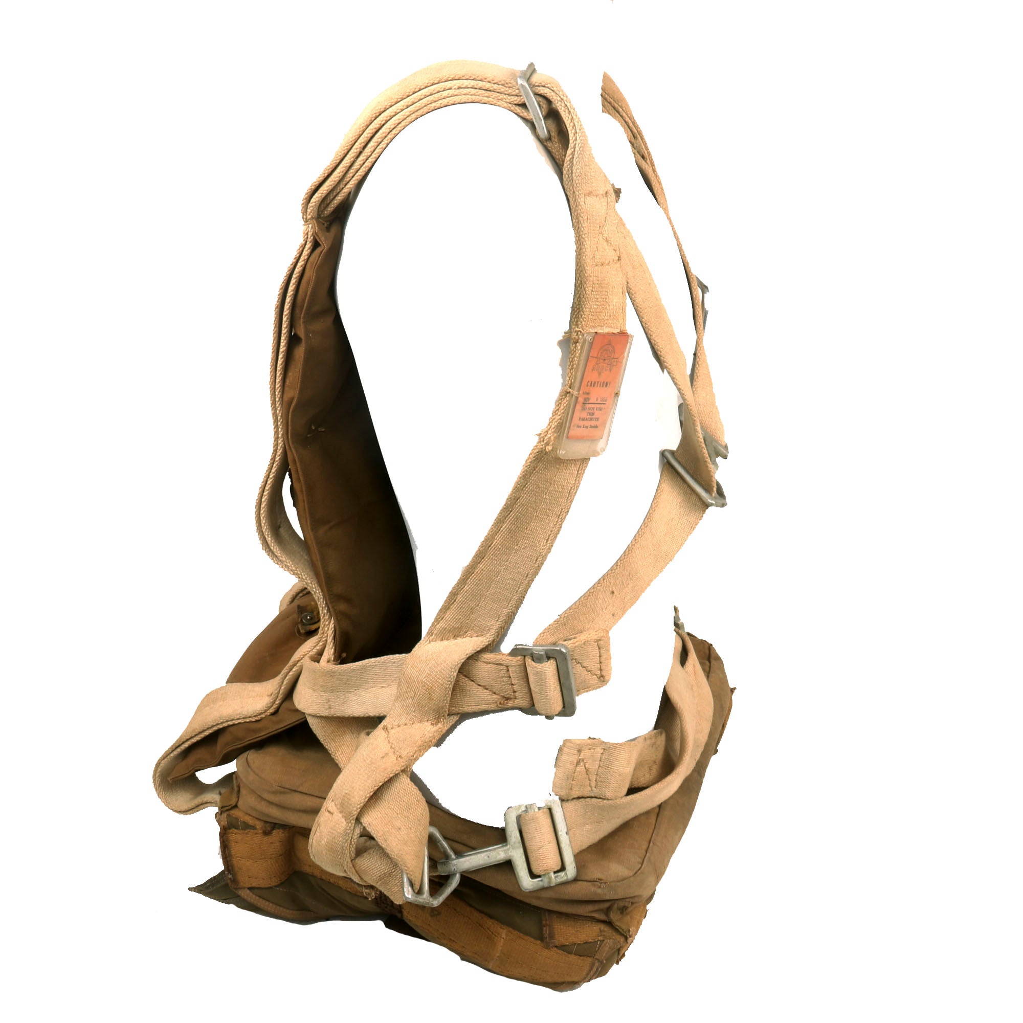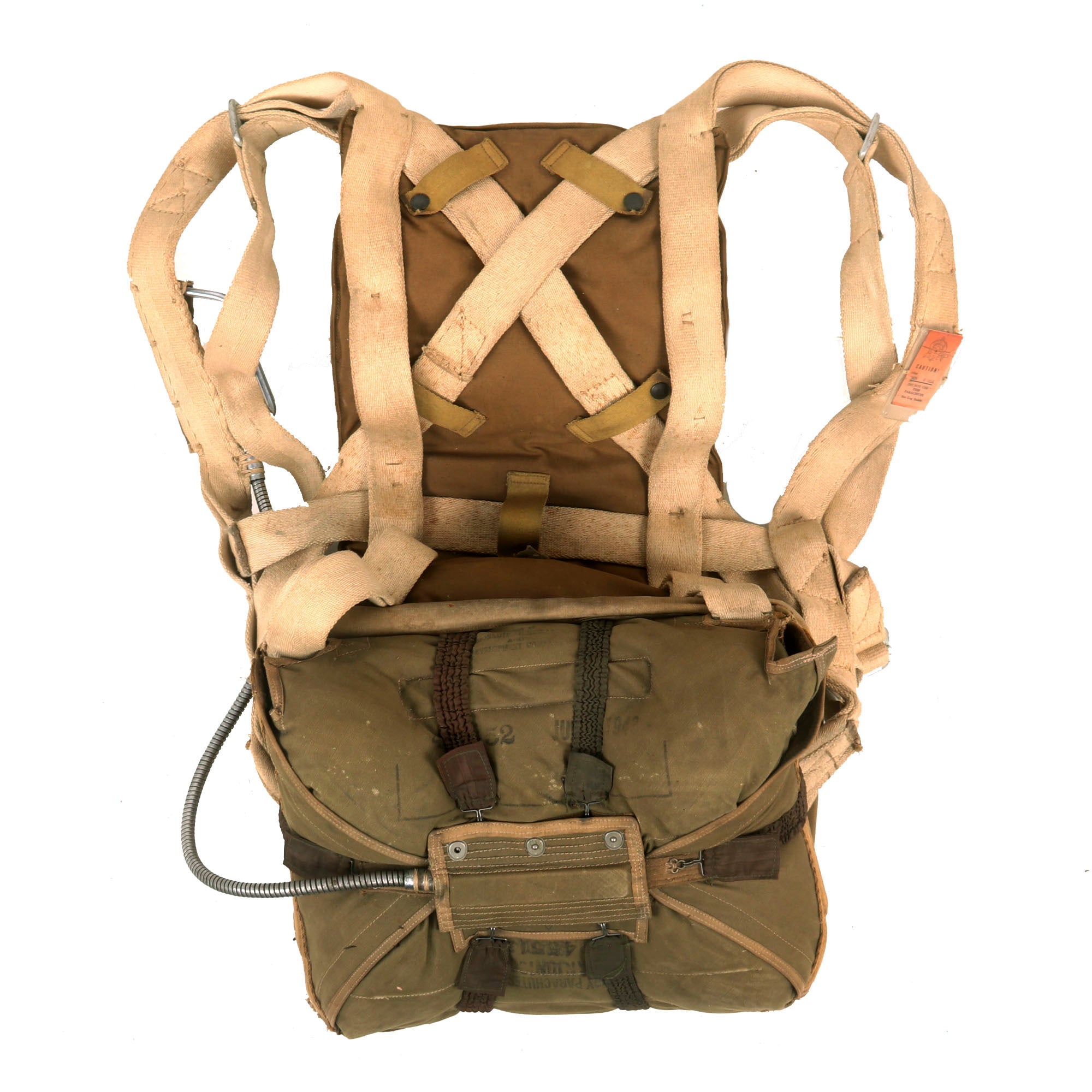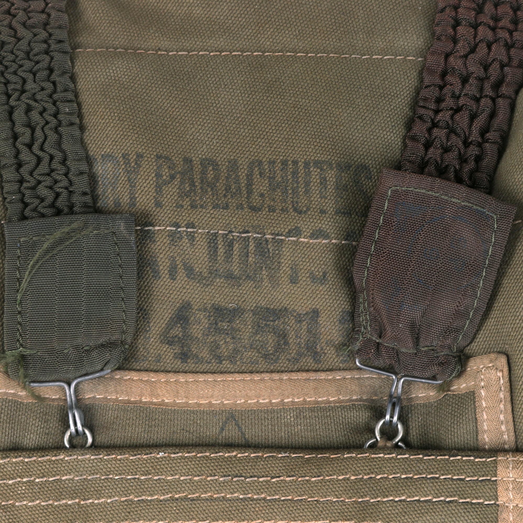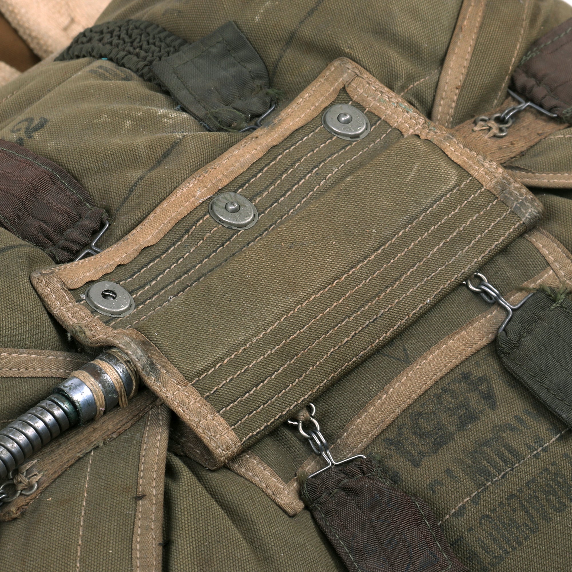 The bag, back rigging, “seat” and canopy bag are all in beautiful condition, with indications of being used, giving it that highly sought after “service worn” look. All buckles and snaps present are still in working condition, as well as the thick white harness/rigging and all the stitching. The canopy is still tightly packed inside the bag, something rarely seen.