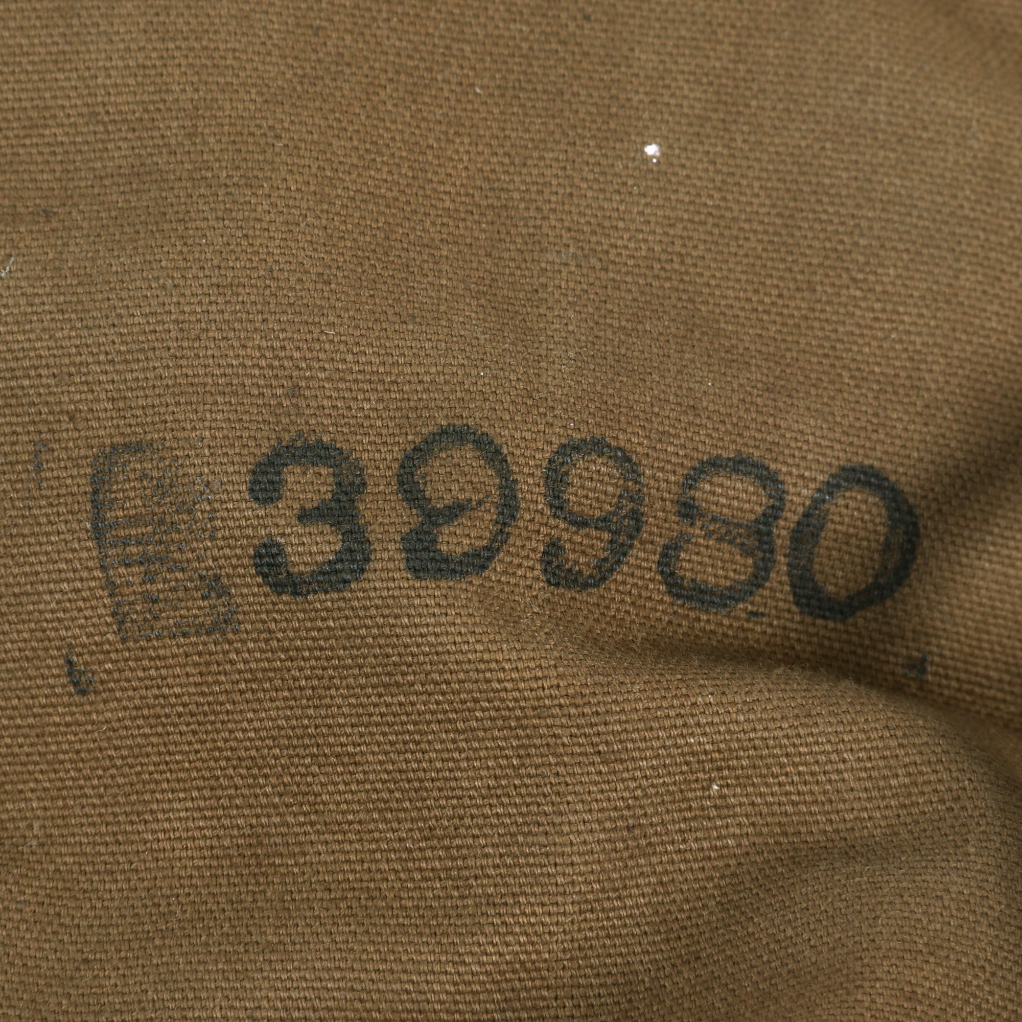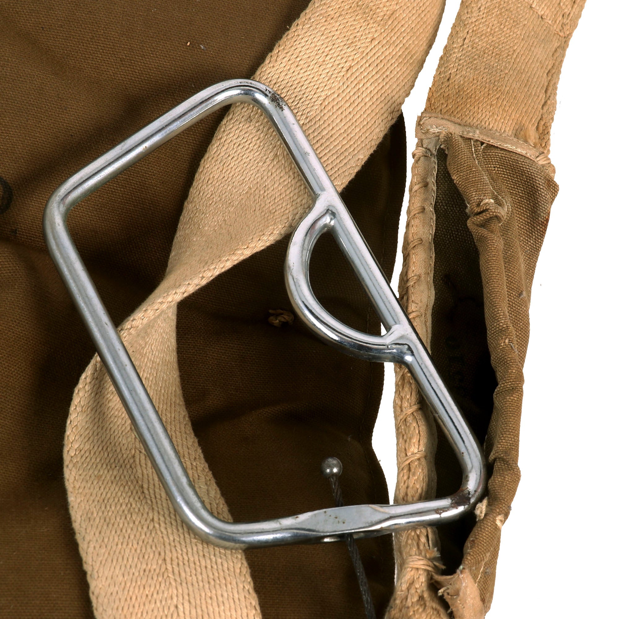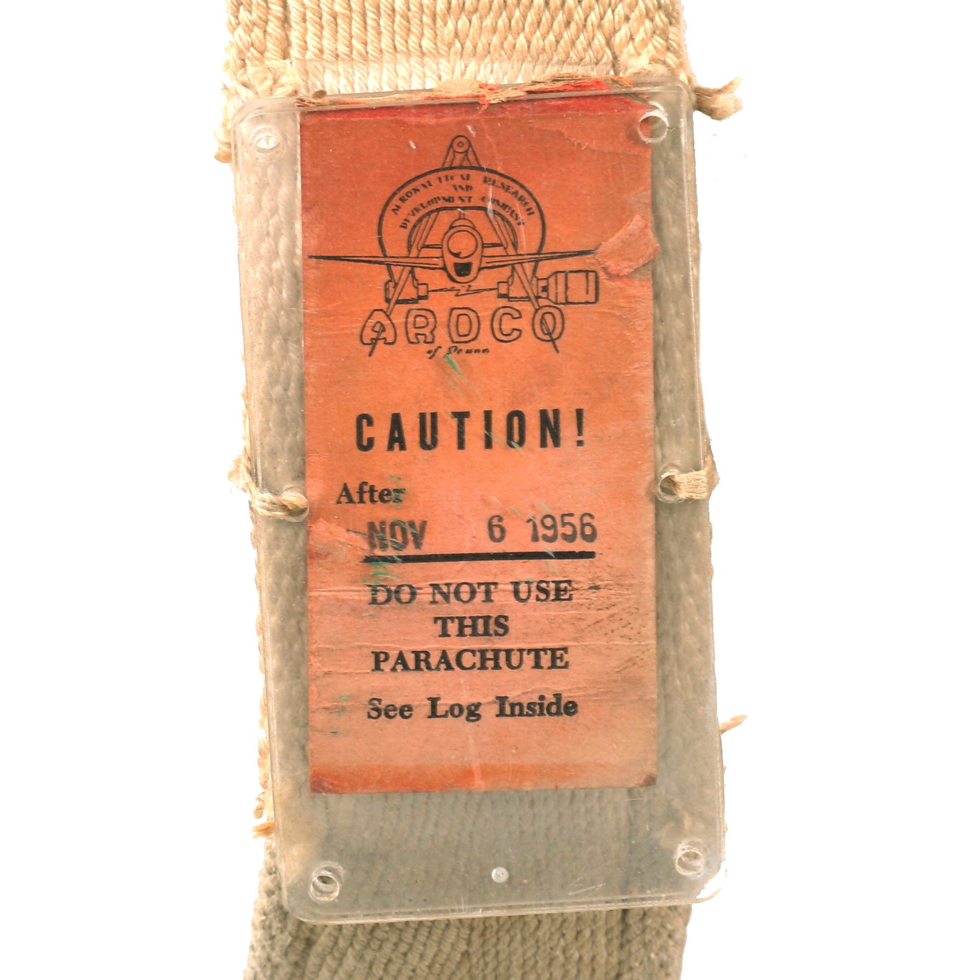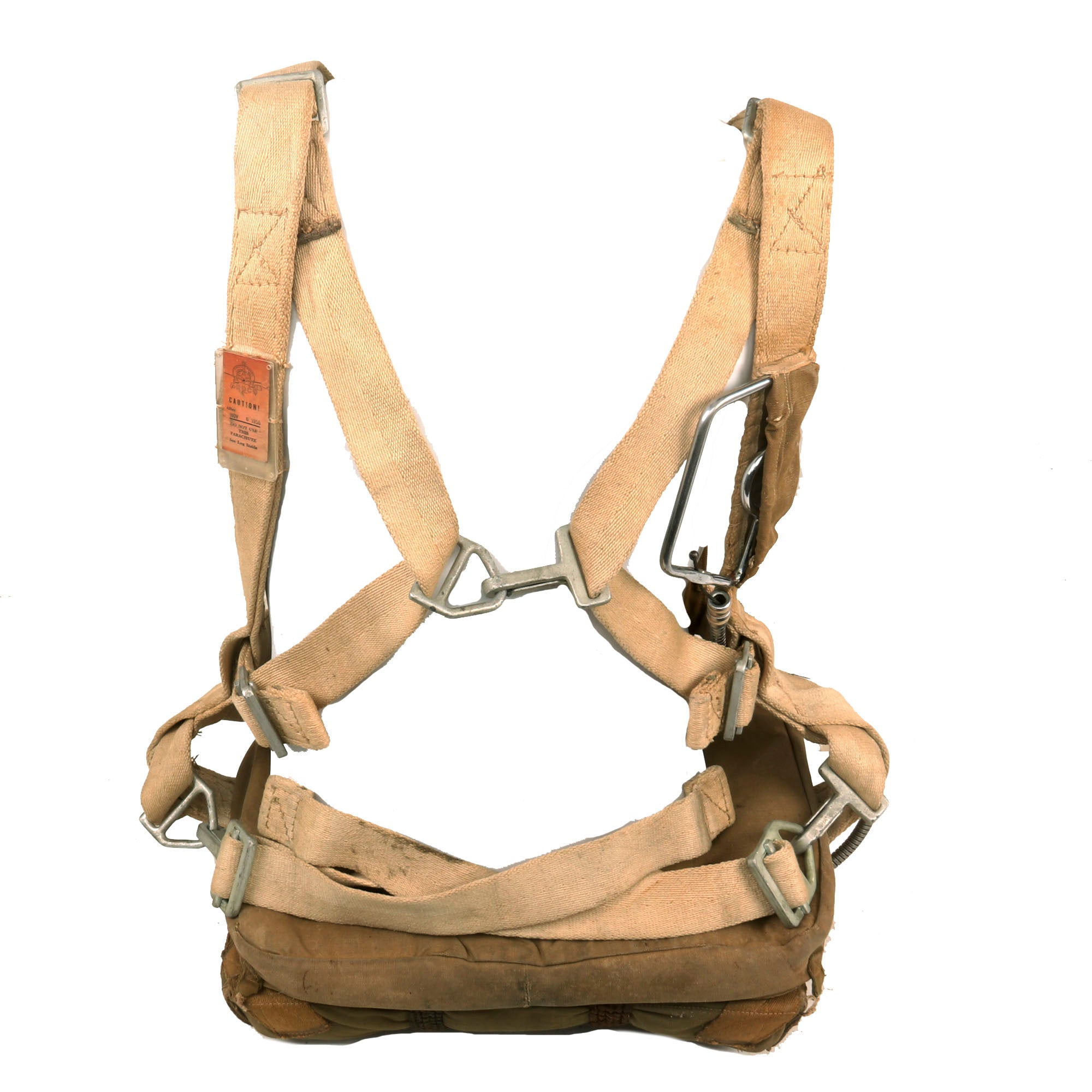 The bag, back rigging, “seat” and canopy bag are all in beautiful condition, with indications of being used, giving it that highly sought after “service worn” look. All buckles and snaps present are still in working condition, as well as the thick white harness/rigging and all the stitching. The canopy is still tightly packed inside the bag, something rarely seen.