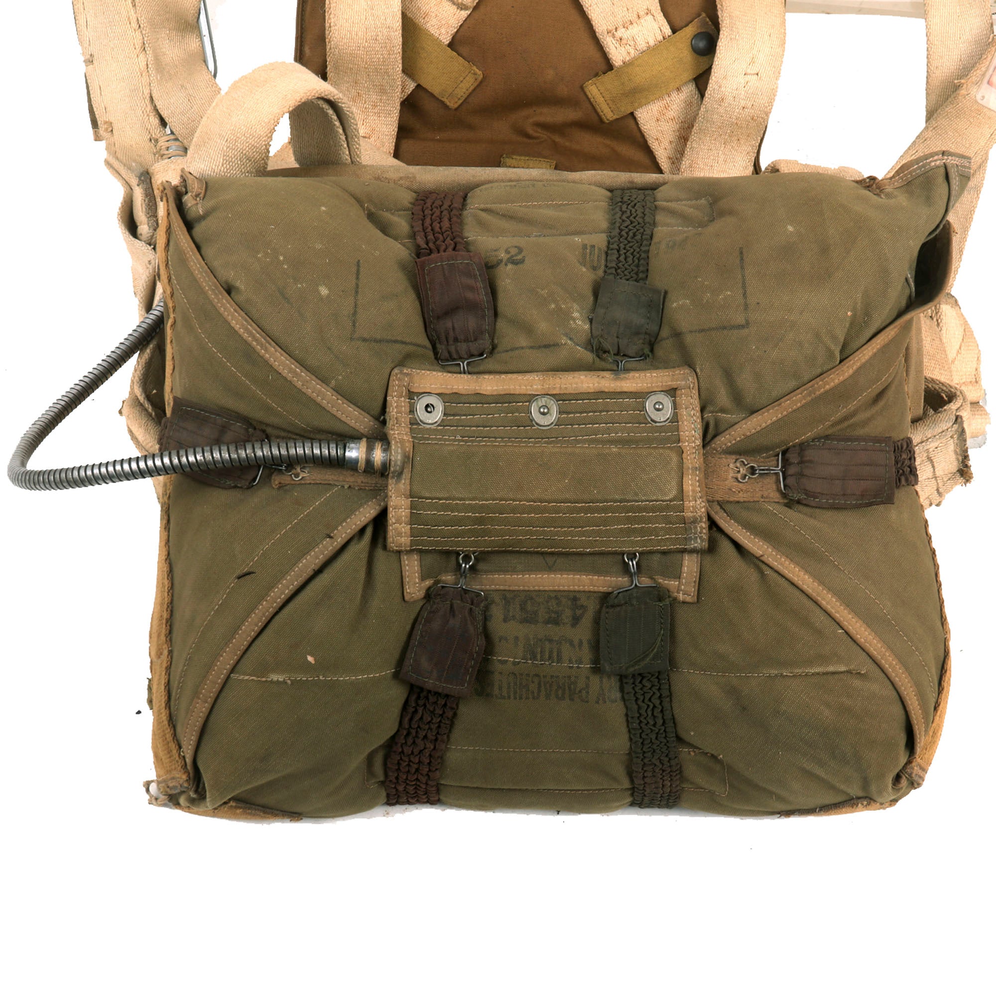 Original Item: Only One Available. This is a very nice, service worn USAAF WW2 era type seat parachute model type AN-6510. The seat parachute was ideally suited for fighter pilots, but not for aircrew who required freedom to move, such as on large bomber aircraft. The improved designs of the newest chest and back type parachutes quickly rendered the seat type obsolete. As soon as the Quick Attachable Chest (QAC) and back types became available, the old seat types would be exchanged and returned to stock. Consequently, when production of seat parachutes ceased in late 1943, the surplus stocks lasted to the end of the war. By July 1943, AAF stocks boasted an excess stock of 104,478 seat parachutes assemblies.