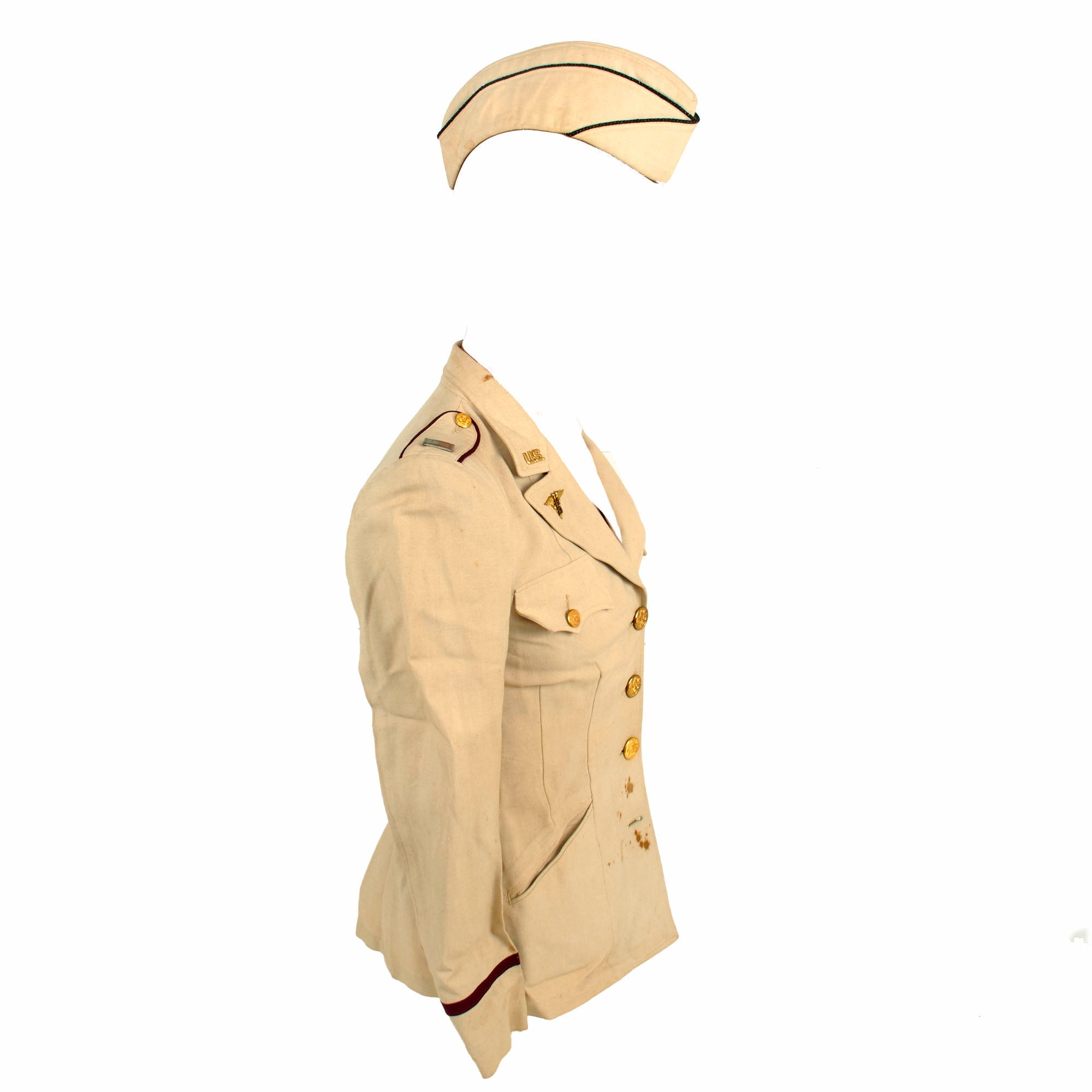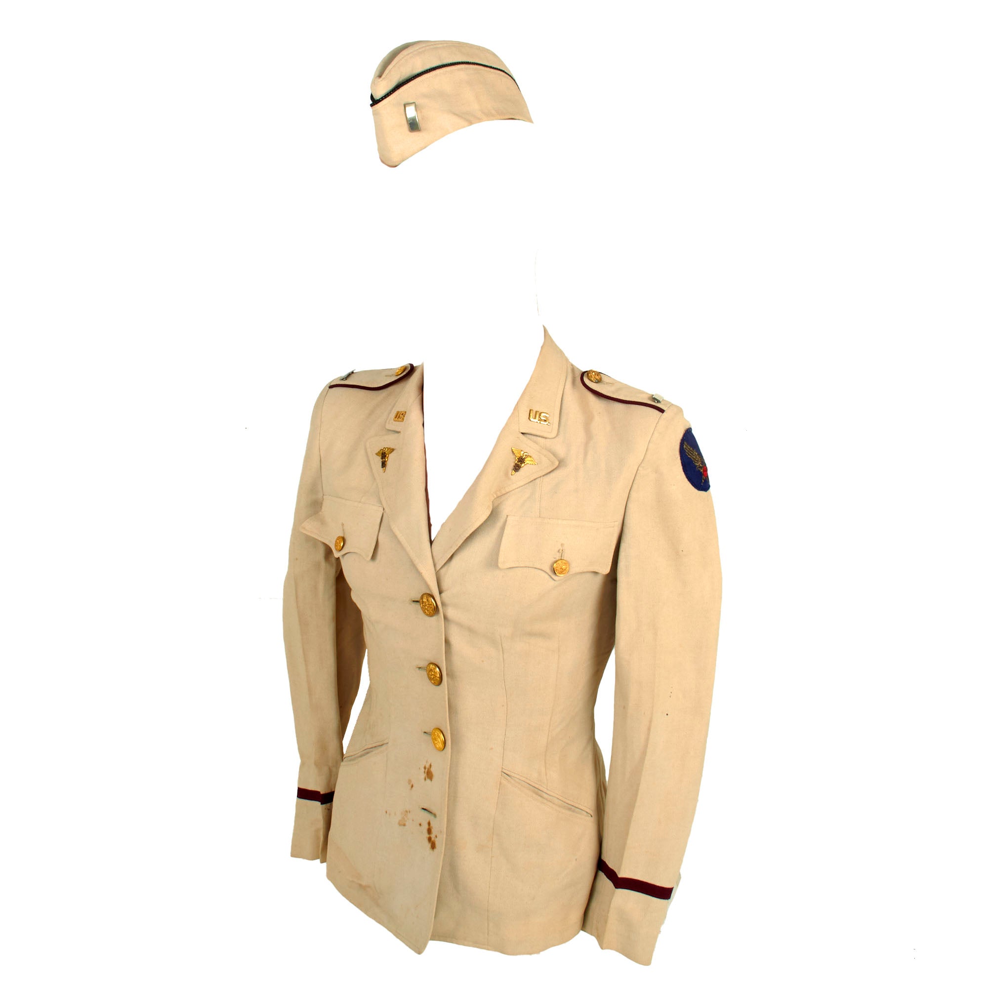 - Army Nurse Corps Lieutenant’s uniform jacket with Army Air Forces patch on the left sleeve, with US & Hospital Dietician collar insignia.