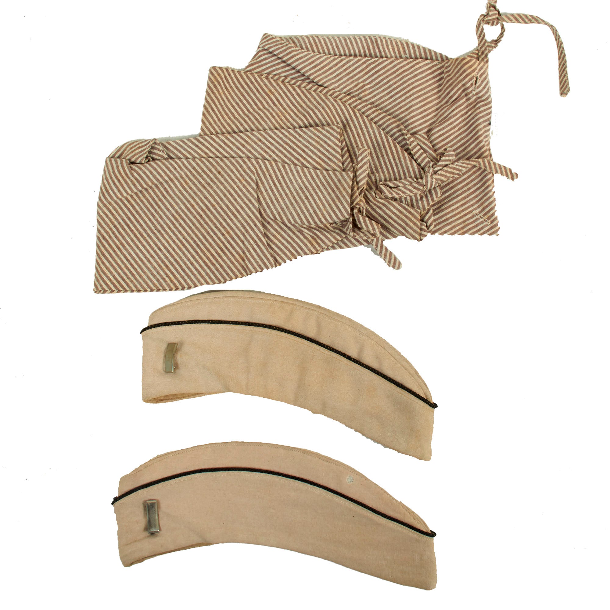 - Three pinstripe uniform pieces, possibly shawls or headwraps, all stamped with Galblum’s laundry number, G-5649.