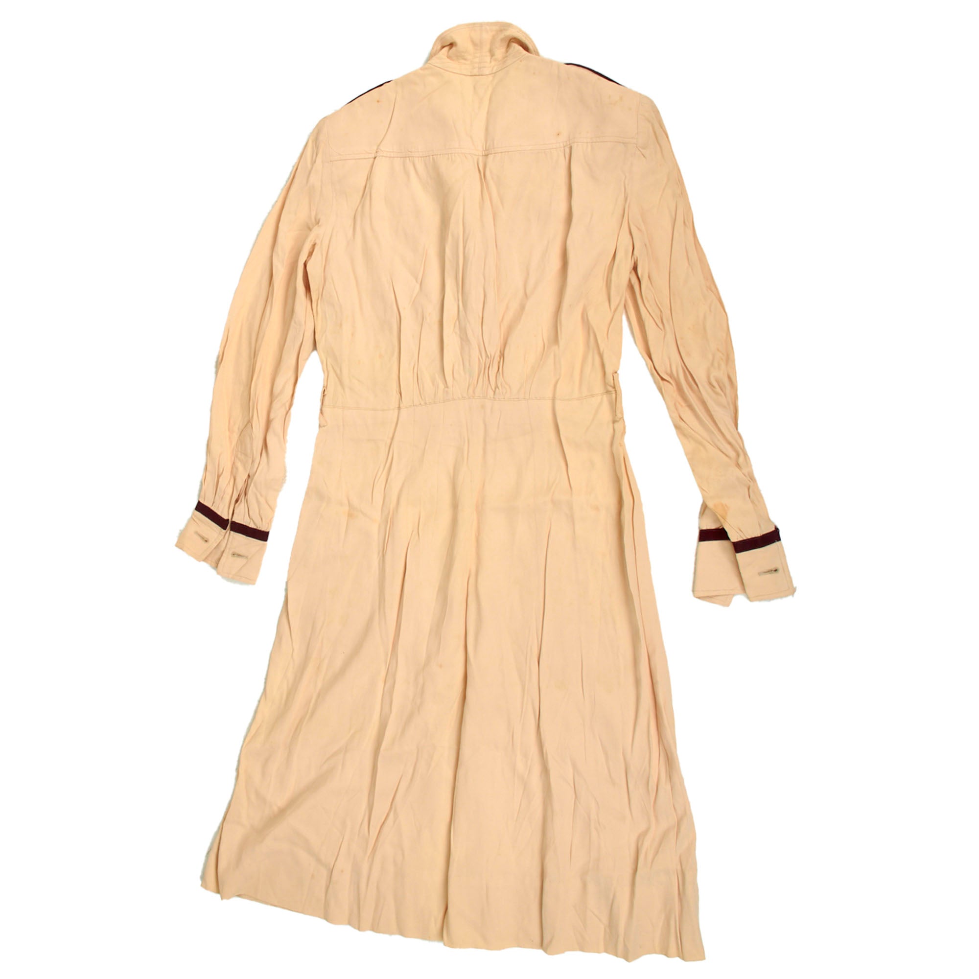 - Nurse’s gown with G-5649 stamped inside. Dark red piping on shoulder boards and cuffs. Some staining but good shape overall.