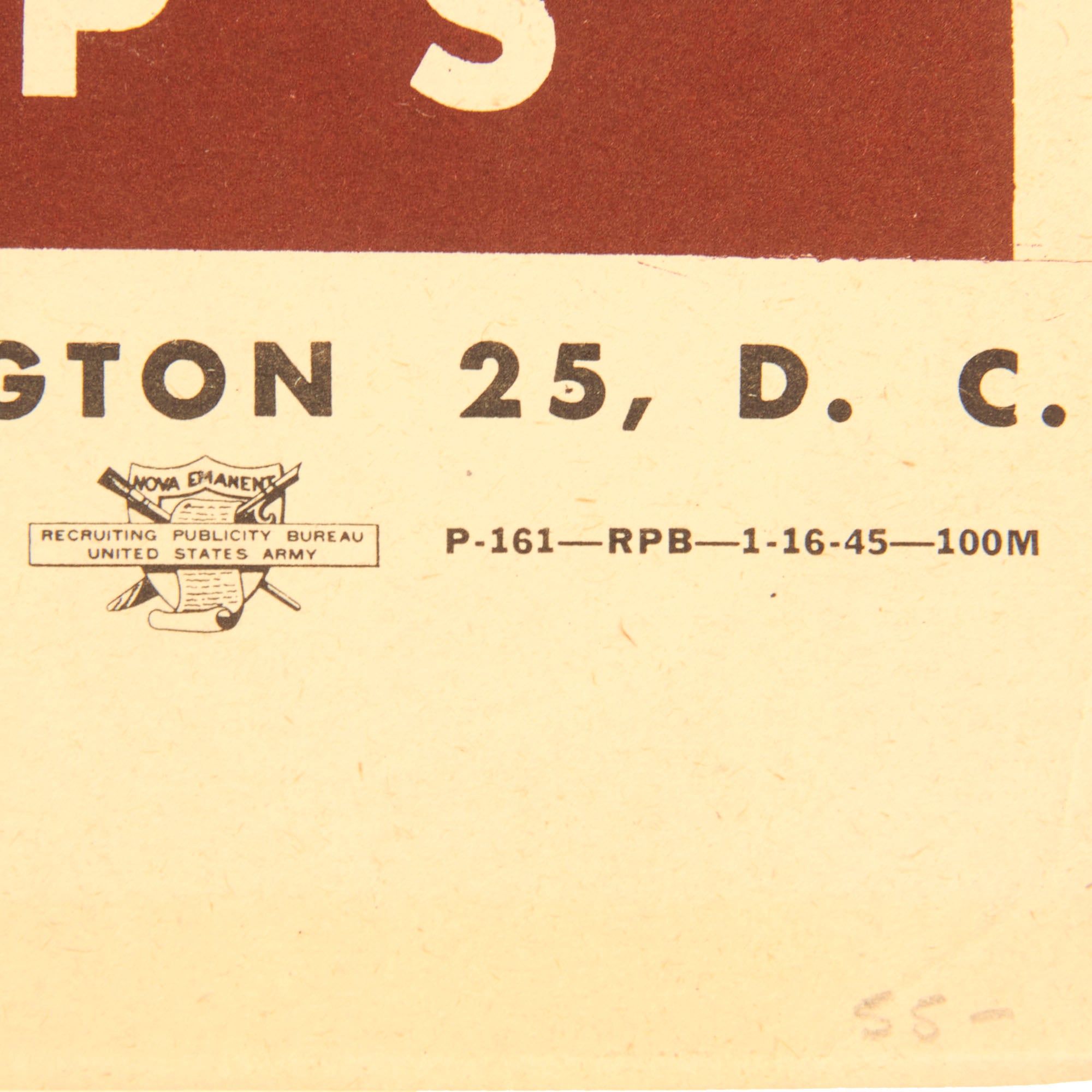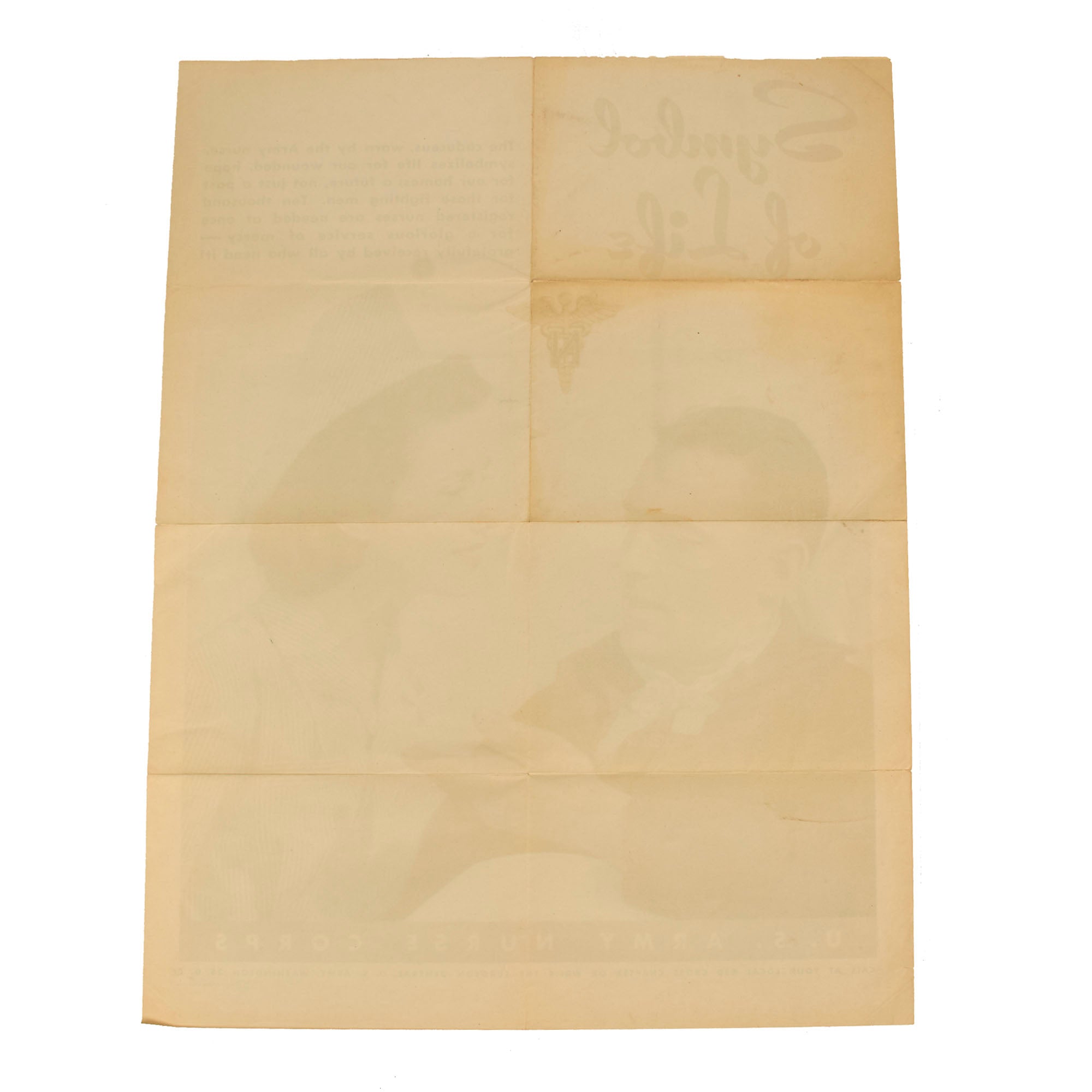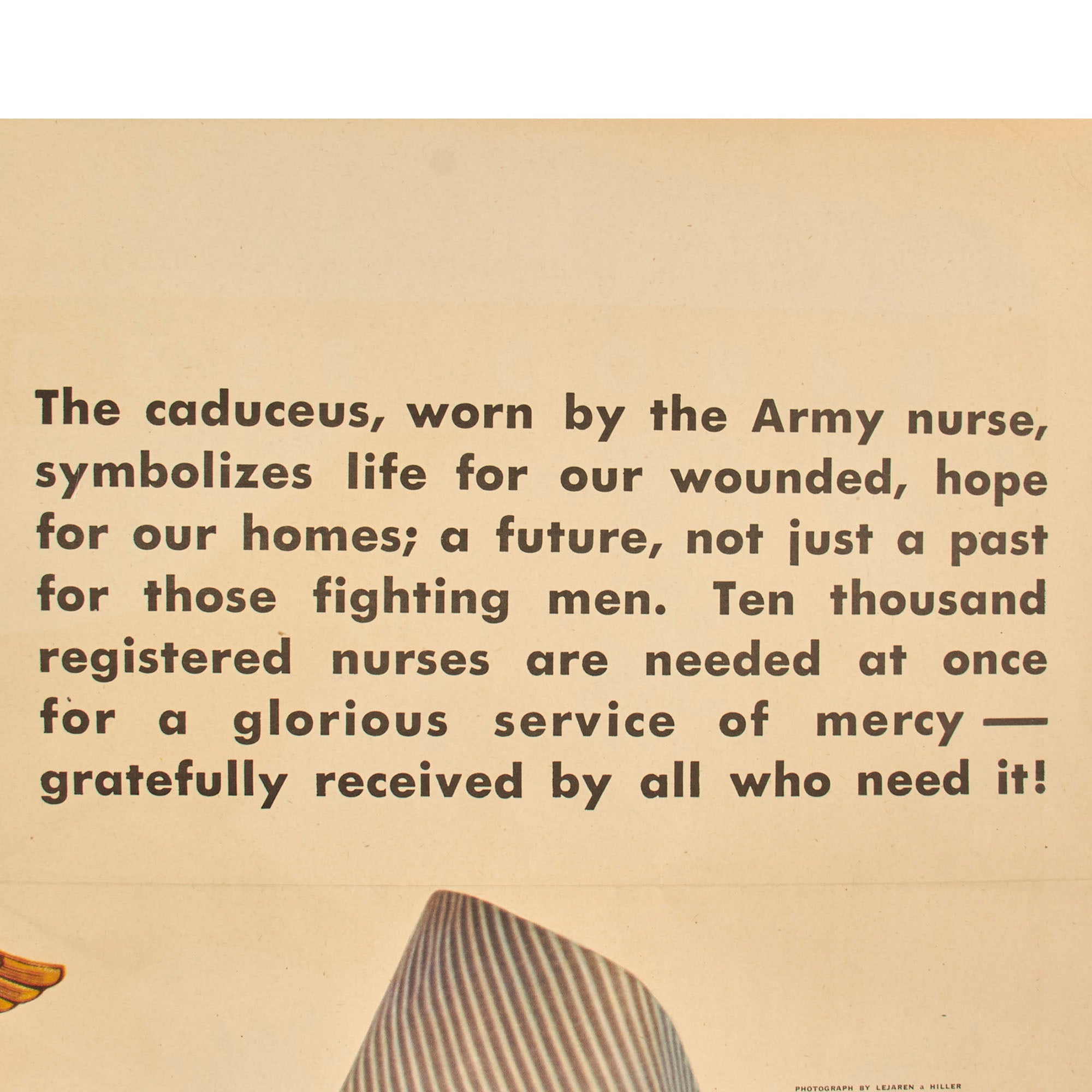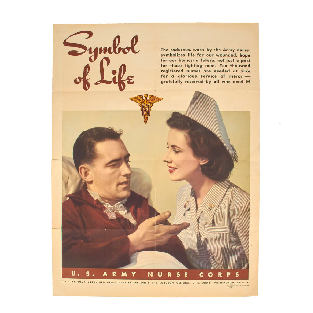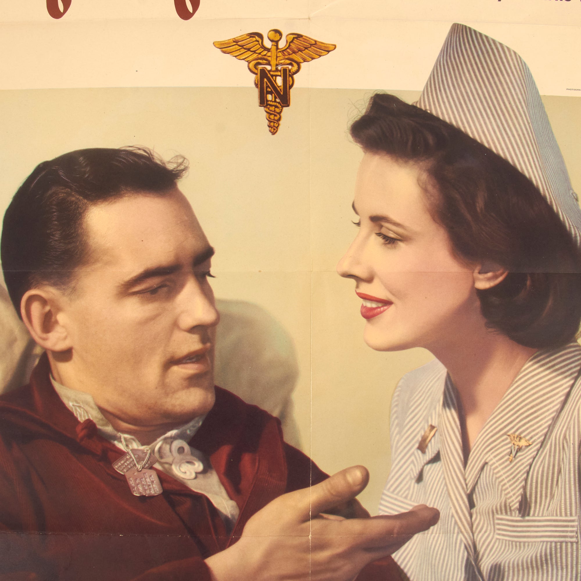 Original Item: Only One Available. Produced during World War Two this is a United States Army Nurse Corps enlistment poster that features a photo of a man in bed wearing gray pajamas with a mandarin collar and white frog closures, a maroon corduroy robe and dogtags. He has his right hand raised slightly and is in conversation with a nurse who happily listens to him. She wears a gray and white striped seersucker uniform with a matching nursing cap. The artist was Lejaren A Hiller and the bottom edge of the poster reads;
