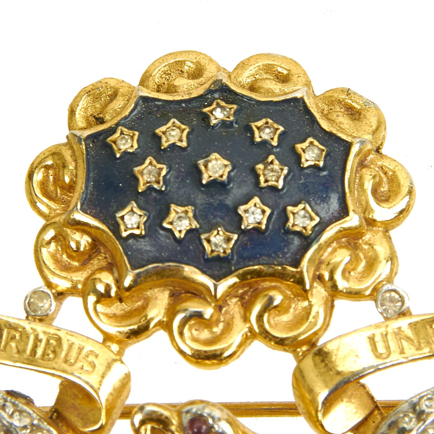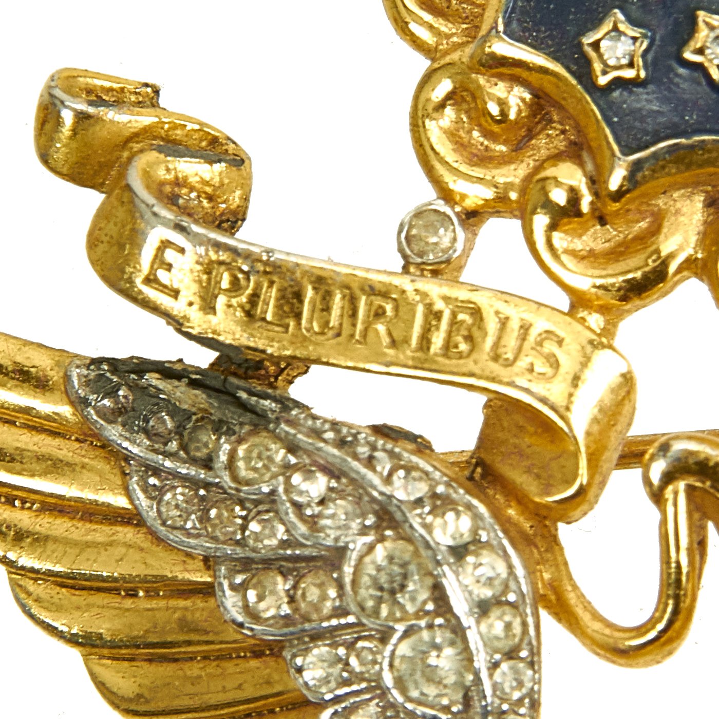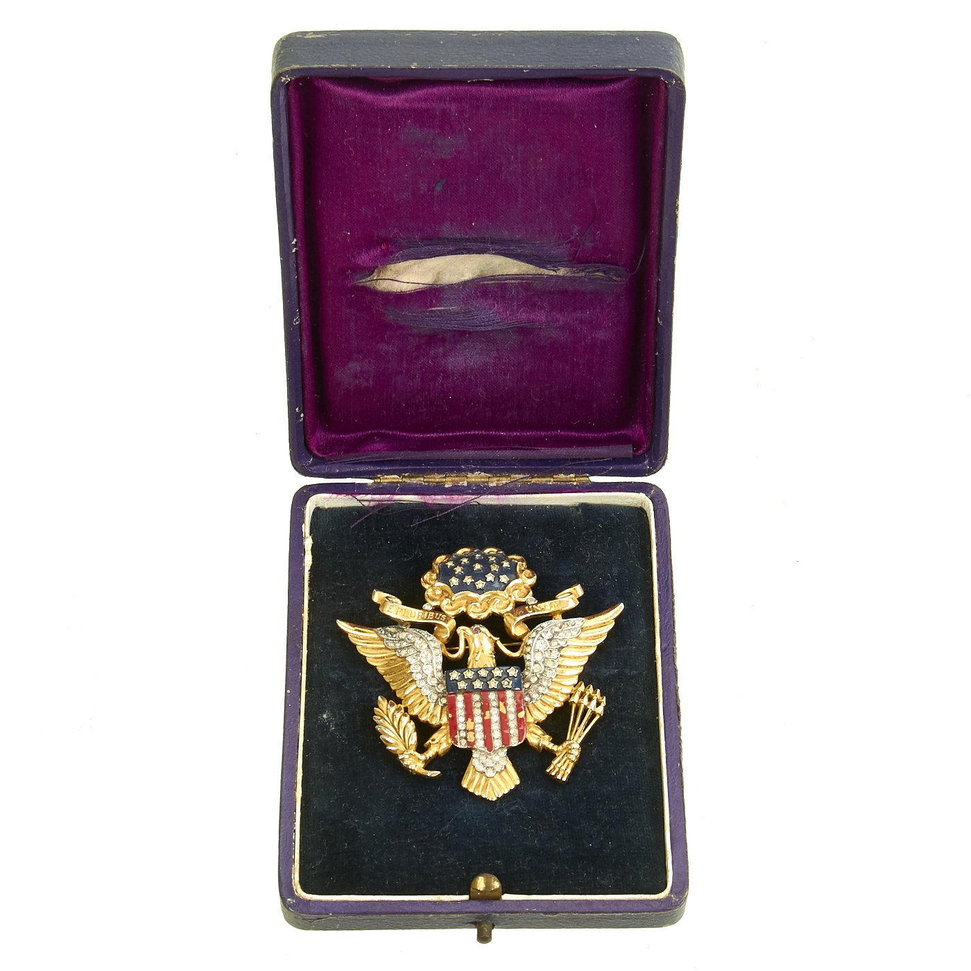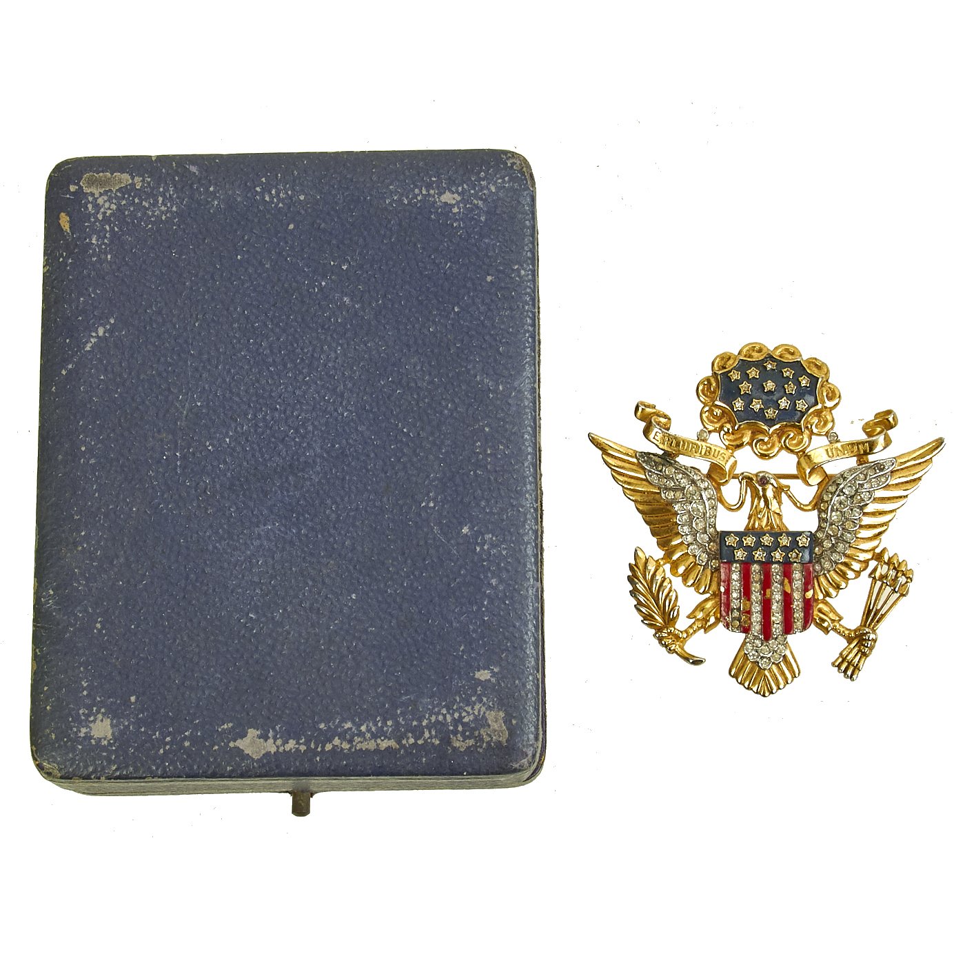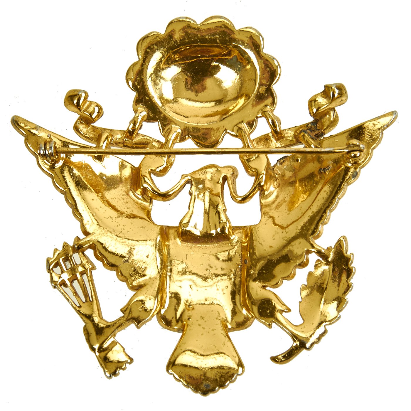 Original Item: Only One Available. This U.S. Army Officer Eagle insignia brooch by Trifari dates from 1945 or earlier, and is made from gilded metal and glass. It measures 2.5" H x 2.75" wide, is maker marked on the reverse and is offered in very good condition. It comes with a case, but we have no idea if its the original case or not as it is not marked or dated.
