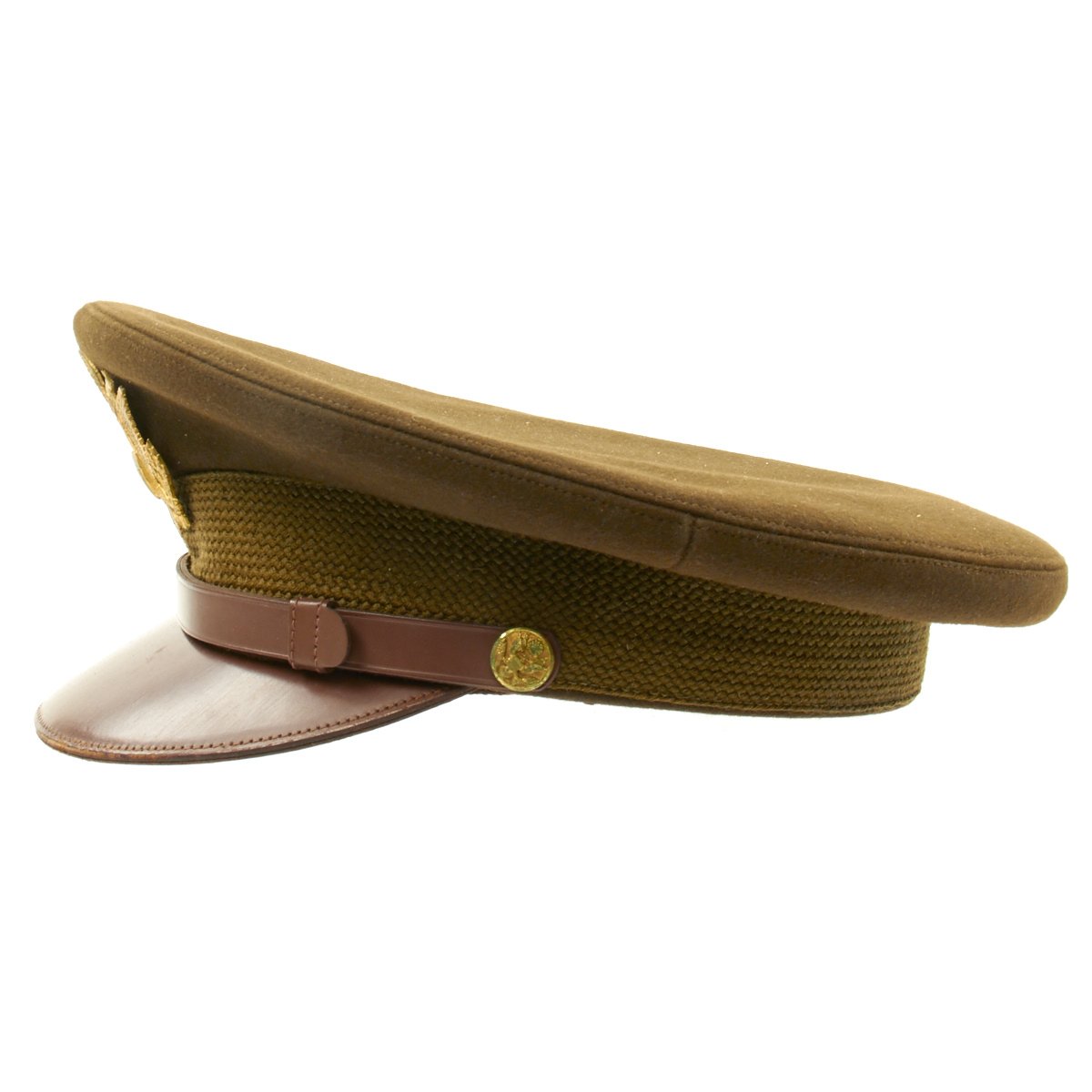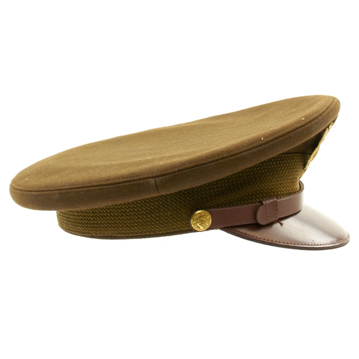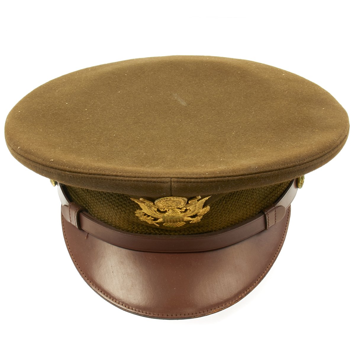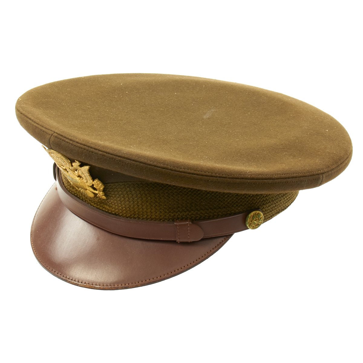 Original Item: Only One Available. This visor cap, in OD Green issue color, is offered in excellent condition. The sweatband is embossed with the retailer name NEWMAN"S JOPLIN, MISSOURI. The underside of the crown bears SUPERFINE KNOX NEW YORK logo. This peaked cap features a gold tone WWII Army Overseas insignia over a leather visor. Size is approximately a US 7.
