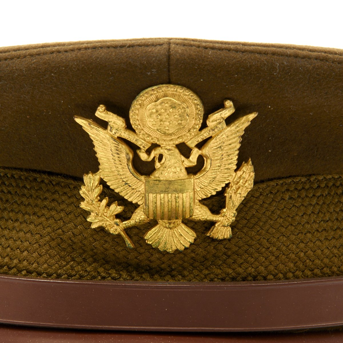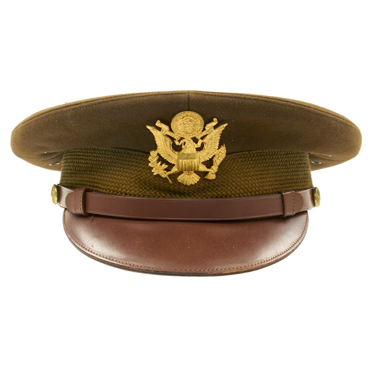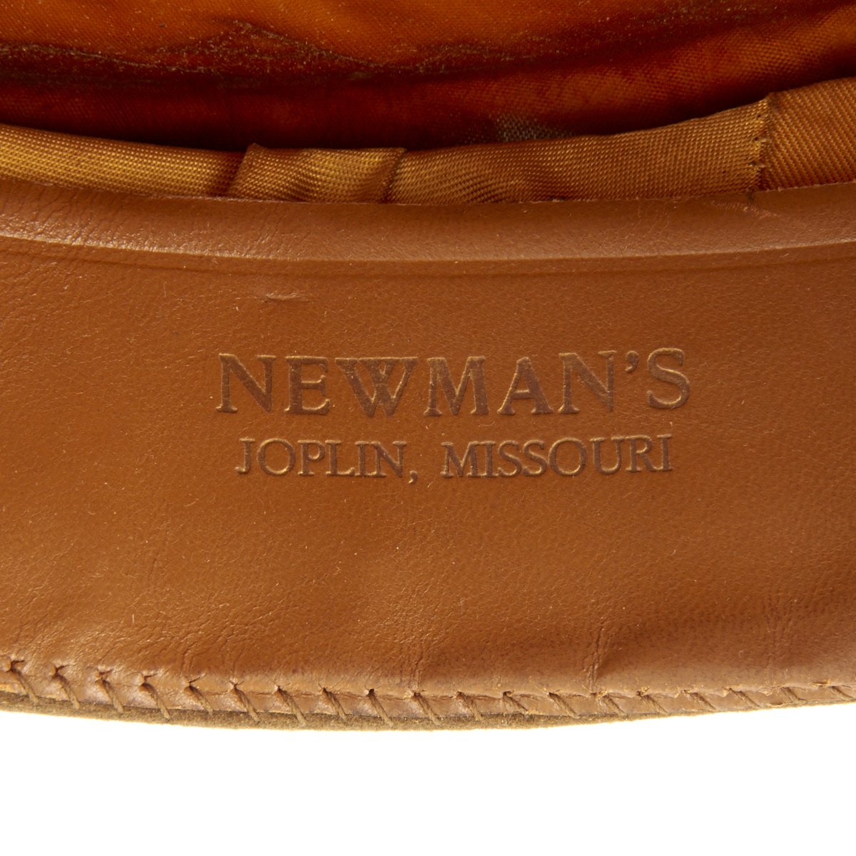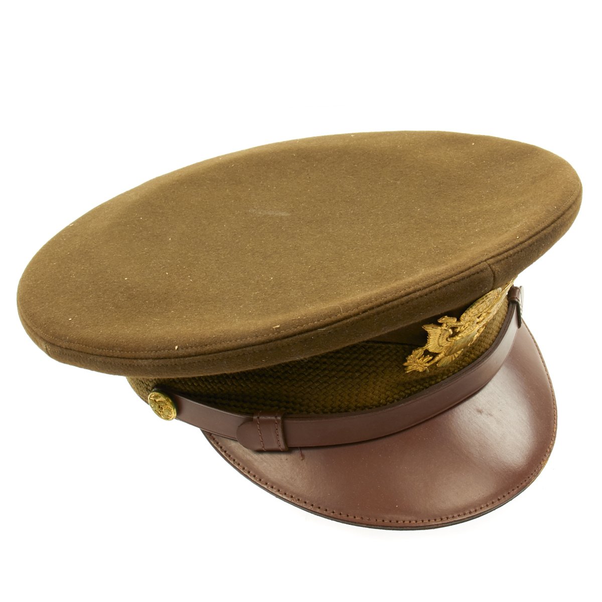 Original Item: Only One Available. This visor cap, in OD Green issue color, is offered in excellent condition. The sweatband is embossed with the retailer name NEWMAN"S JOPLIN, MISSOURI. The underside of the crown bears SUPERFINE KNOX NEW YORK logo. This peaked cap features a gold tone WWII Army Overseas insignia over a leather visor. Size is approximately a US 7.