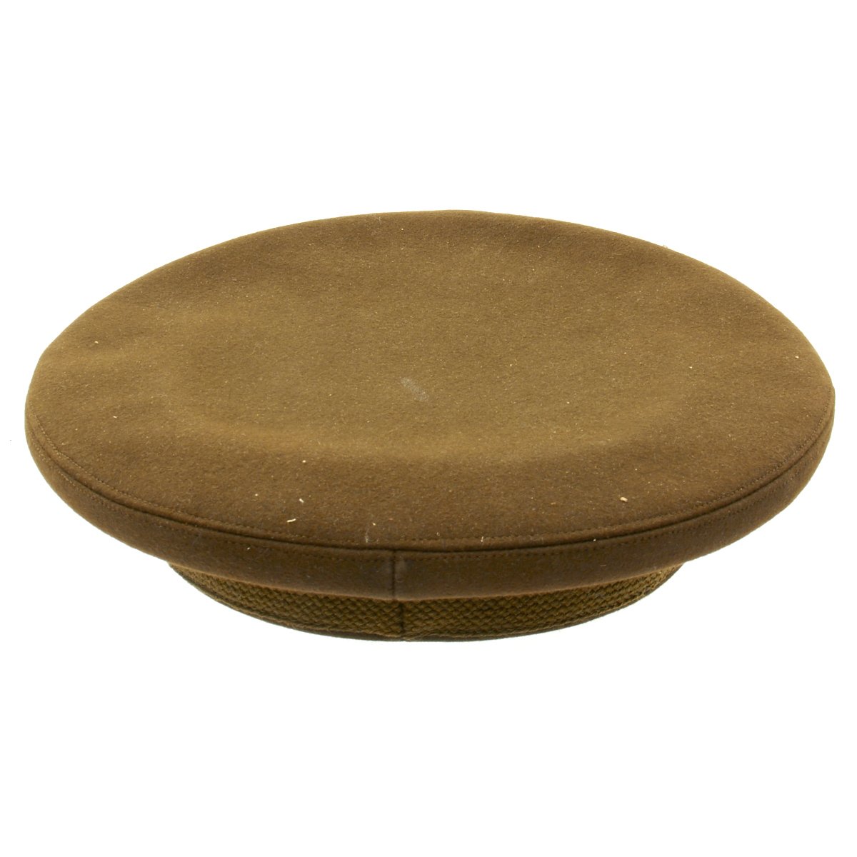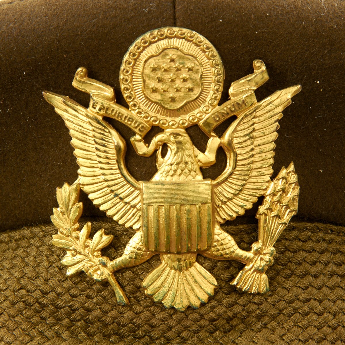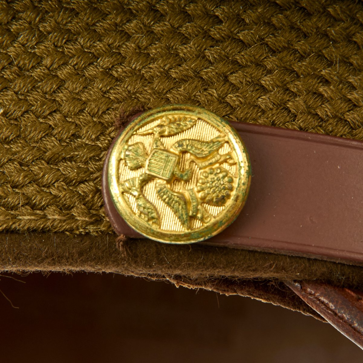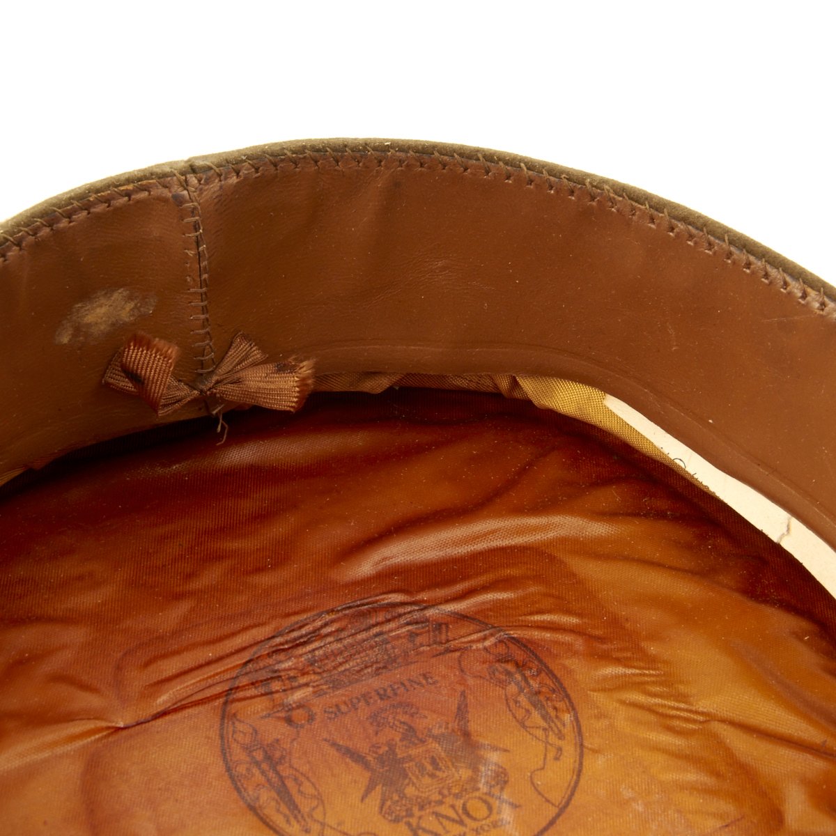 Original Item: Only One Available. This visor cap, in OD Green issue color, is offered in excellent condition. The sweatband is embossed with the retailer name NEWMAN"S JOPLIN, MISSOURI. The underside of the crown bears SUPERFINE KNOX NEW YORK logo. This peaked cap features a gold tone WWII Army Overseas insignia over a leather visor. Size is approximately a US 7.