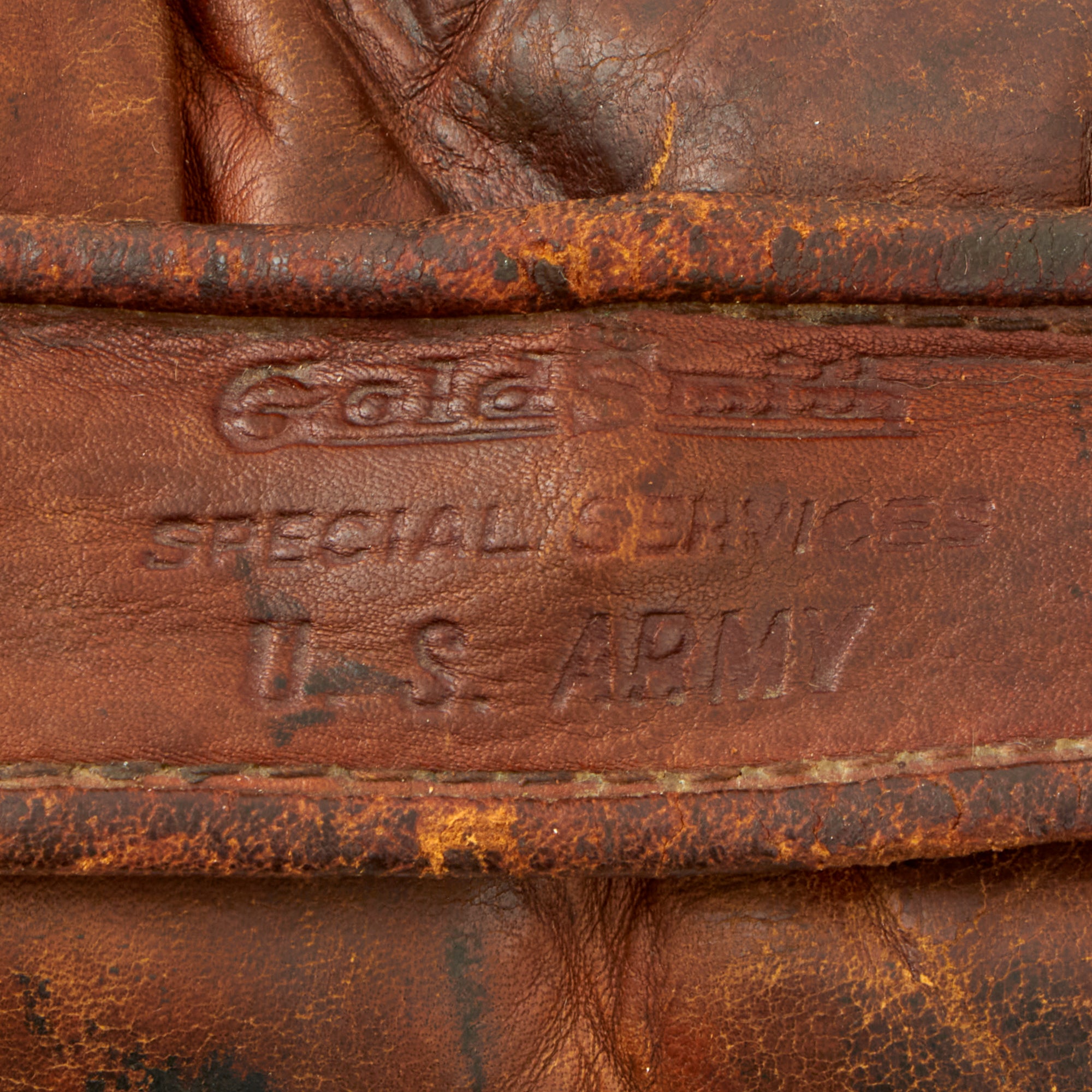 This is an extremely scarce example of a WWII Army Special Services marked baseball glove. The glove is marked on the strap on the back: