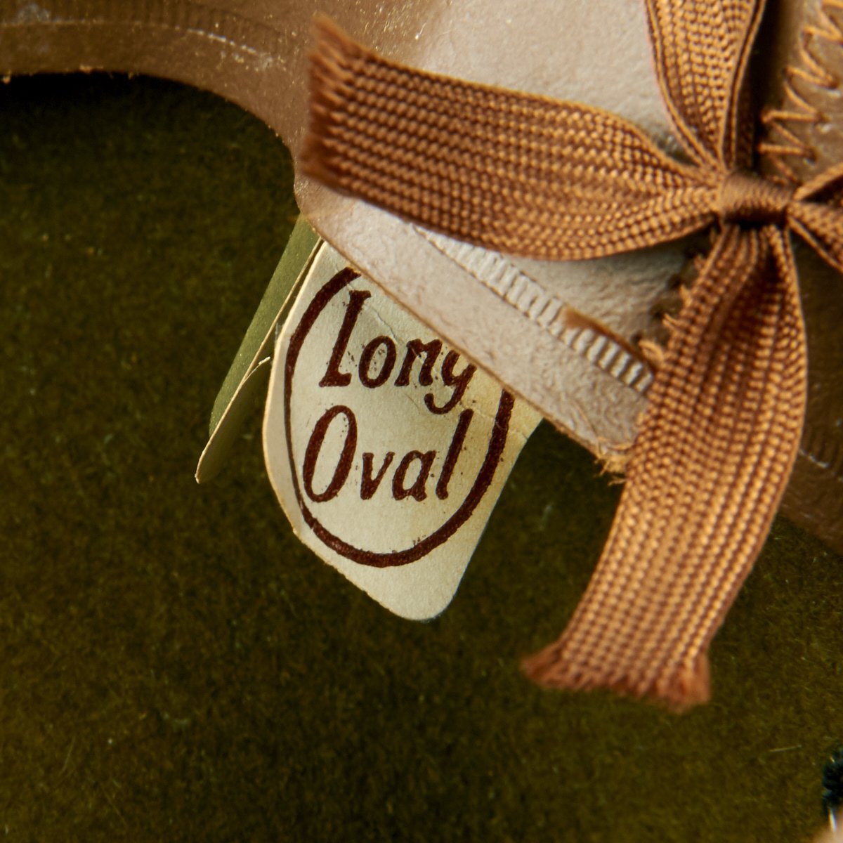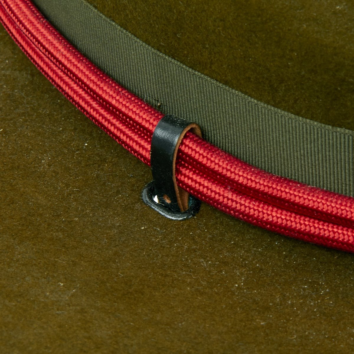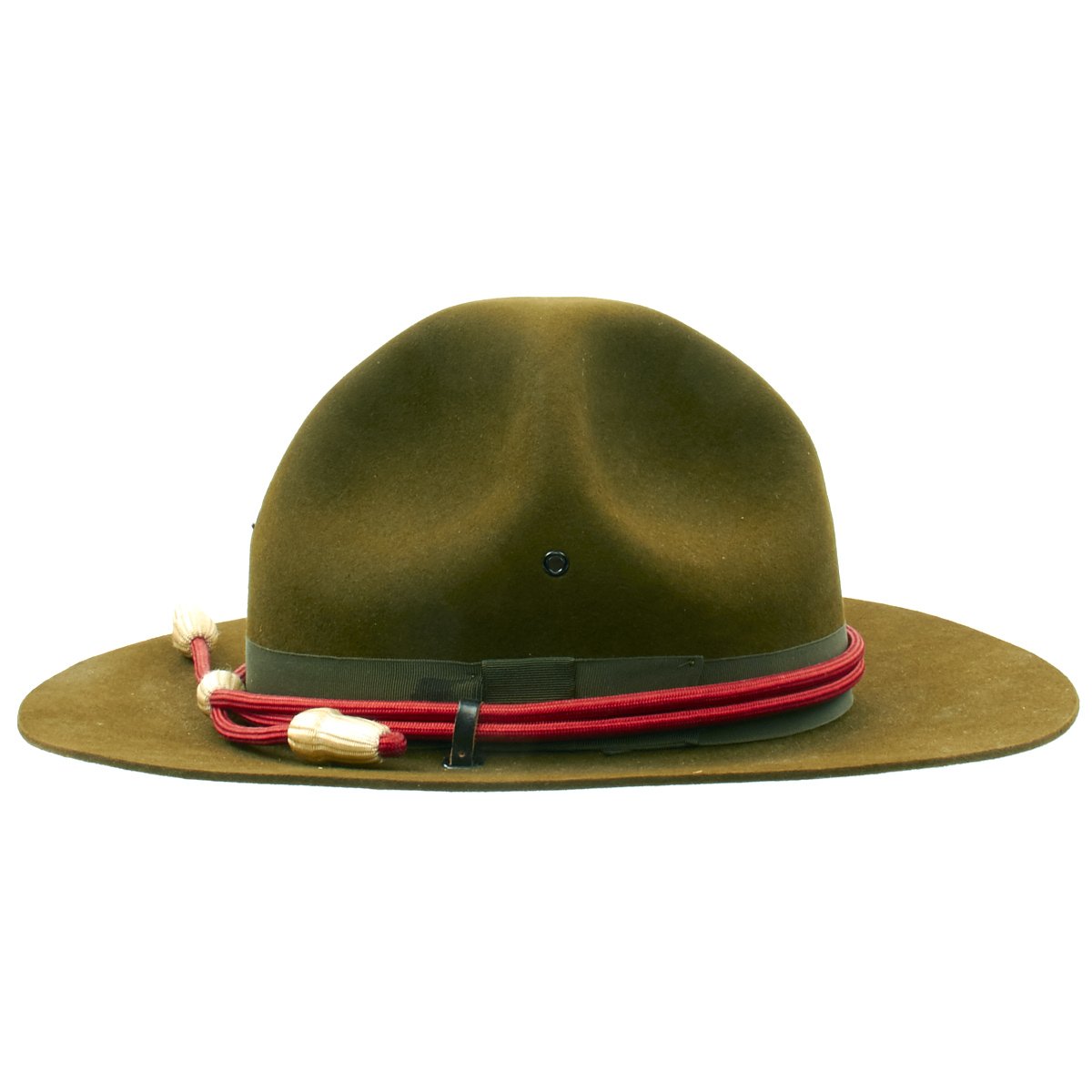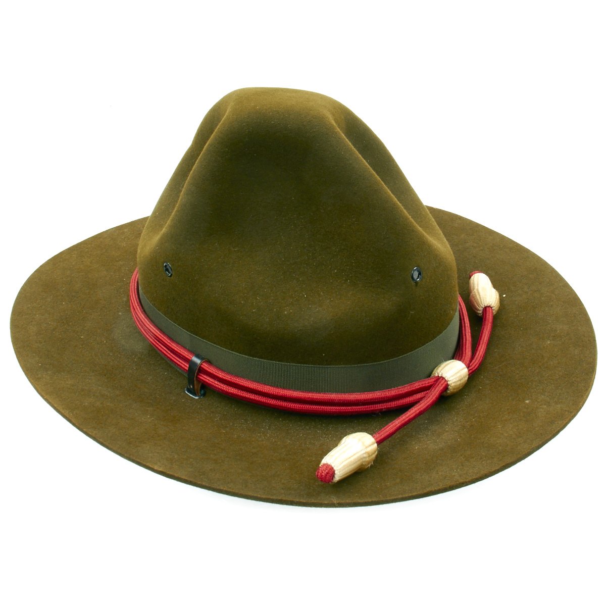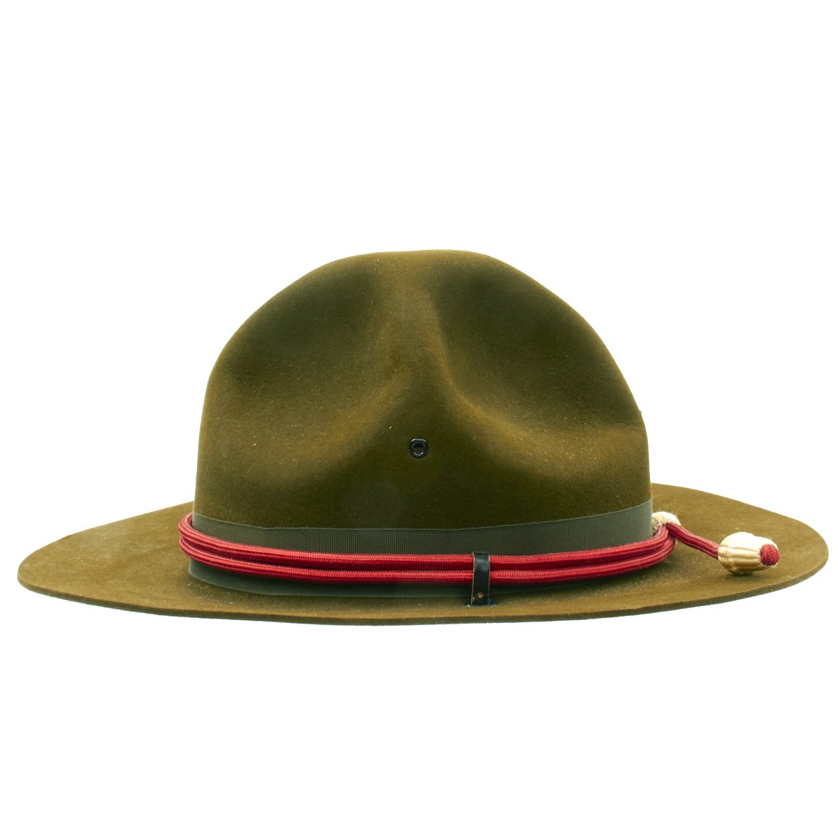 The Hat, Service, M1911 (Campaign Hat) was made of OD wool felt with a wide brim and "Montana peak" crown. There were ventilation holes in the crown with grommets, a silk hatband, and a silk and brass braid cord closed by a knot and terminated with a tassel. Inside was a leather sweatband and an attached chin strap. The Army model was dark brown OD in color.