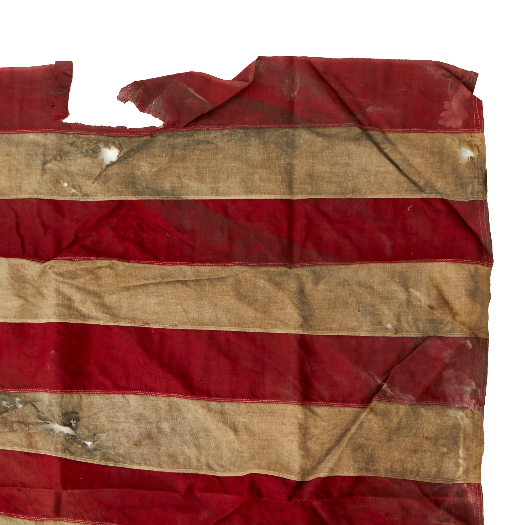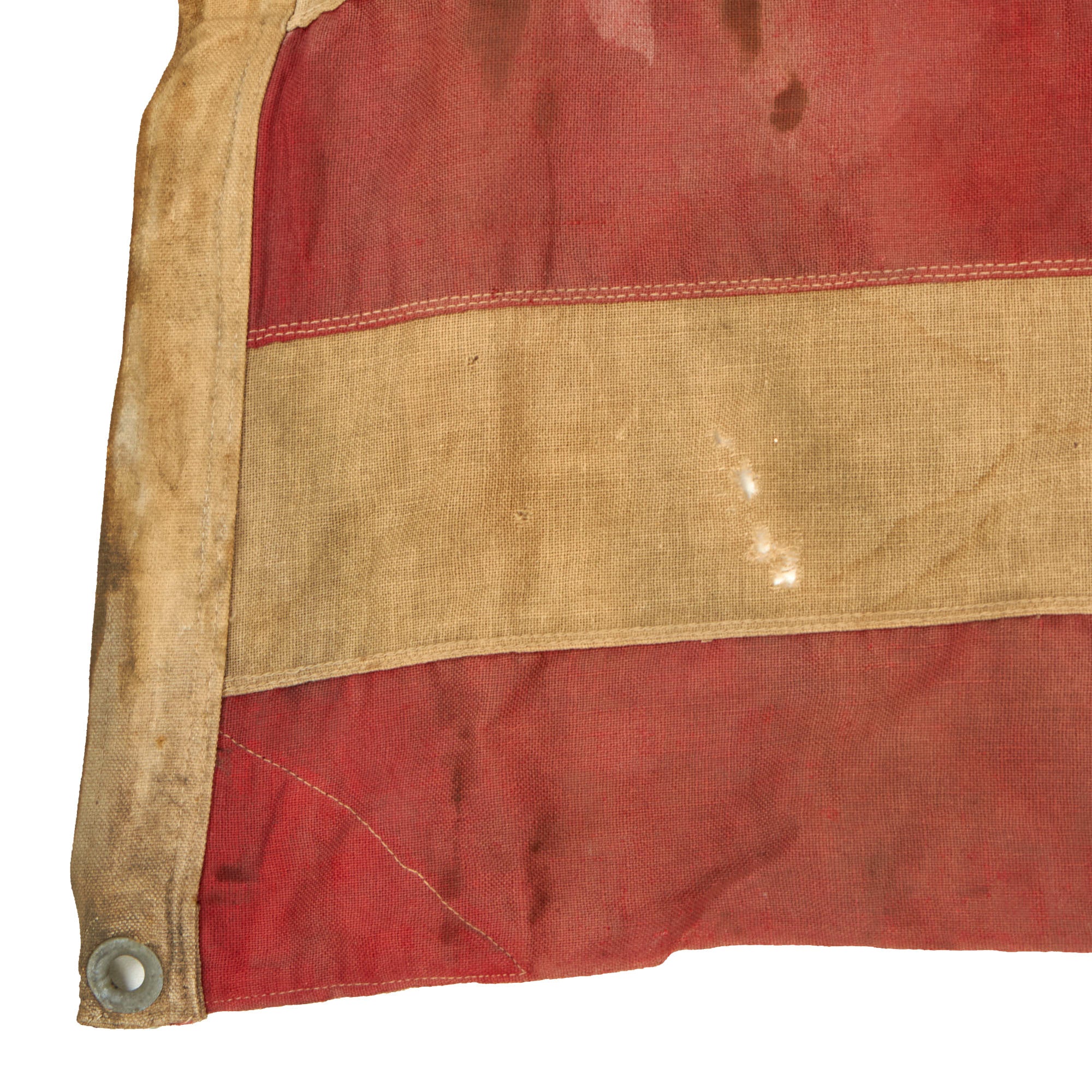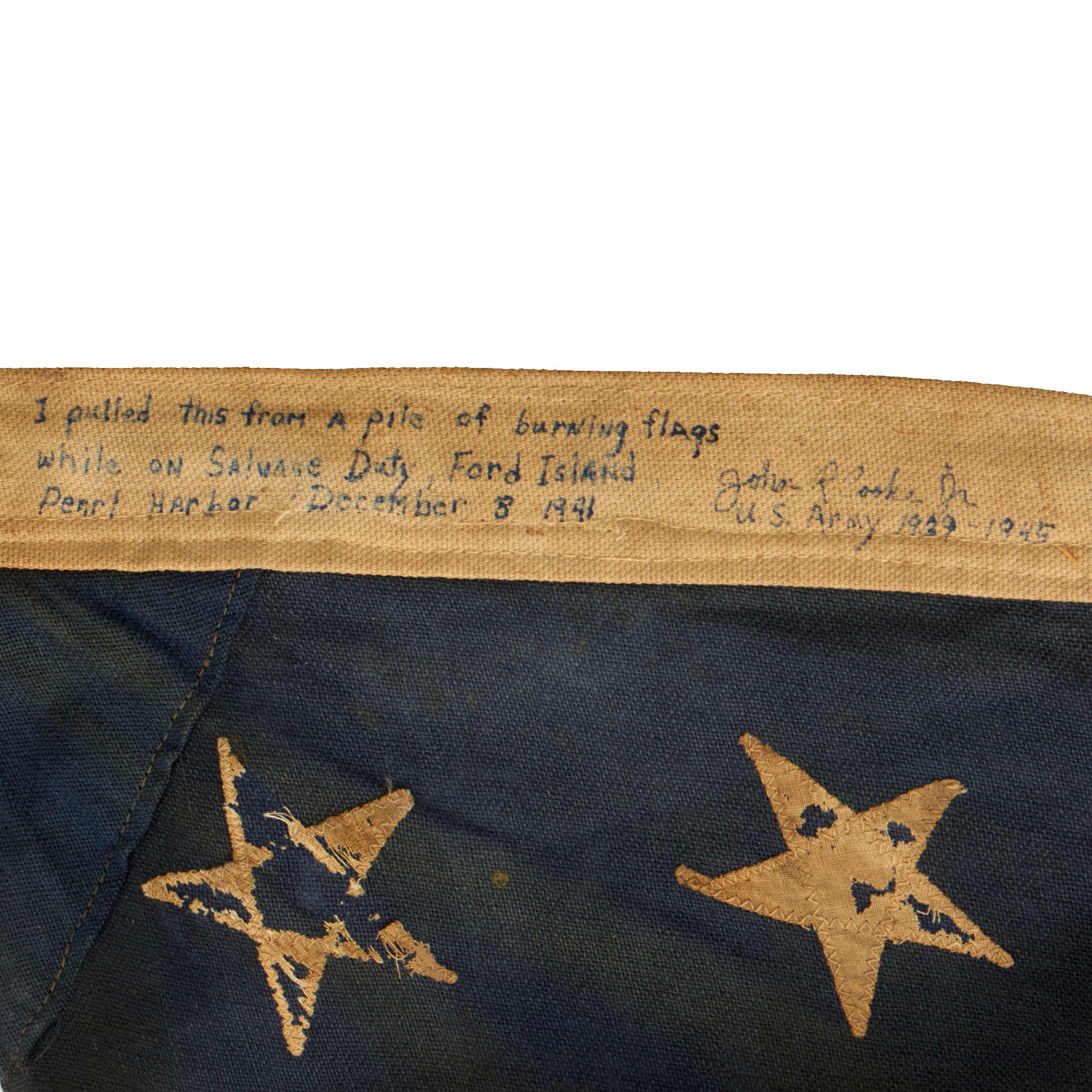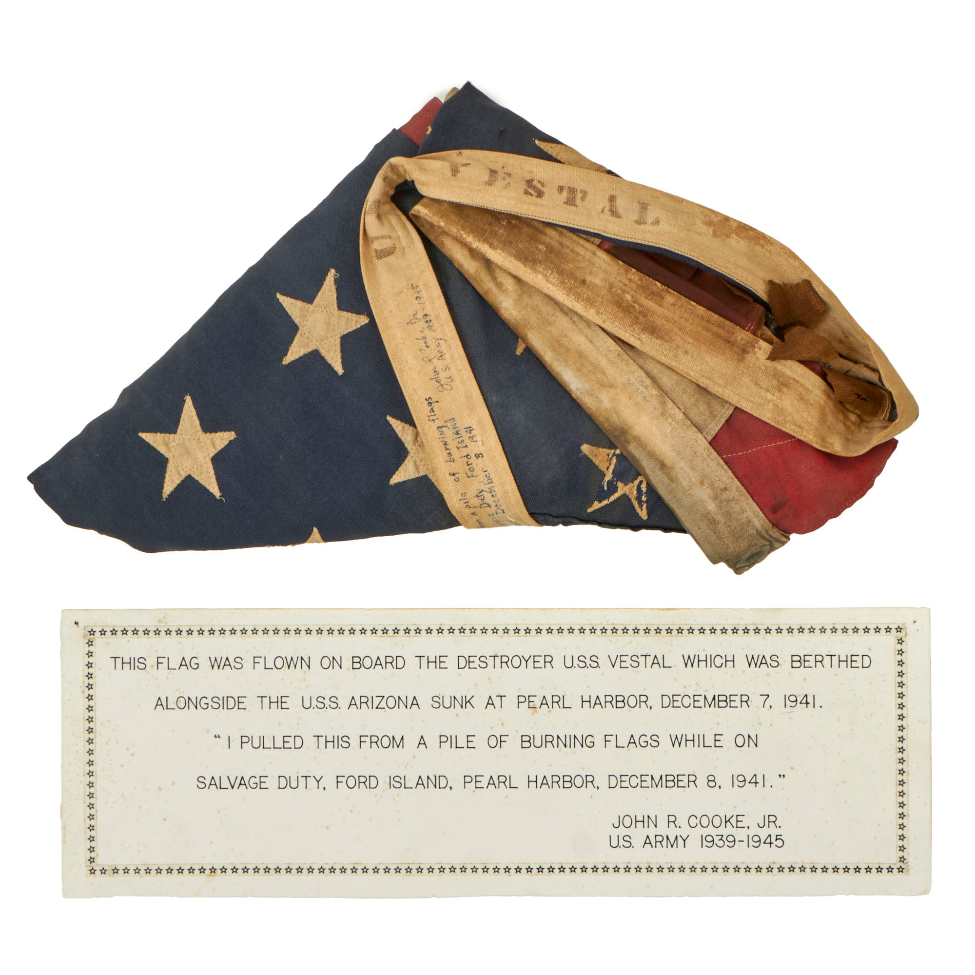 Original Item. One-of-a-Kind. This is one of the most historic flags we have offered. Recovered by John R. Cooke Jr. while on salvage duty on Ford Island on December 8th, 1941, this flag of the USS Vestal was found in a pile of burning flags left to the elements, and these burn marks are still very prominent on the flag.