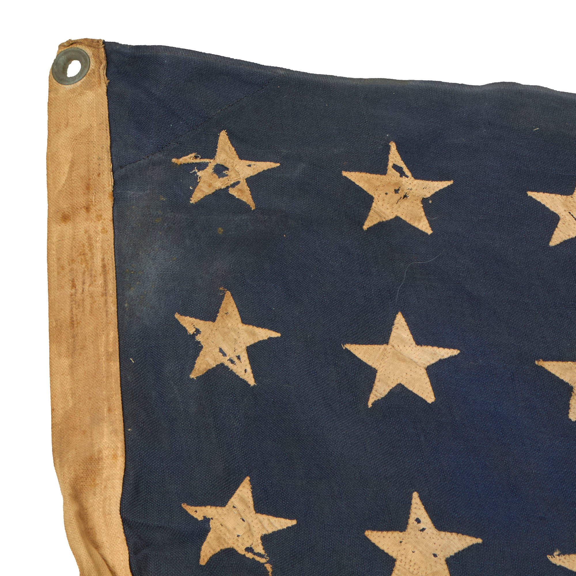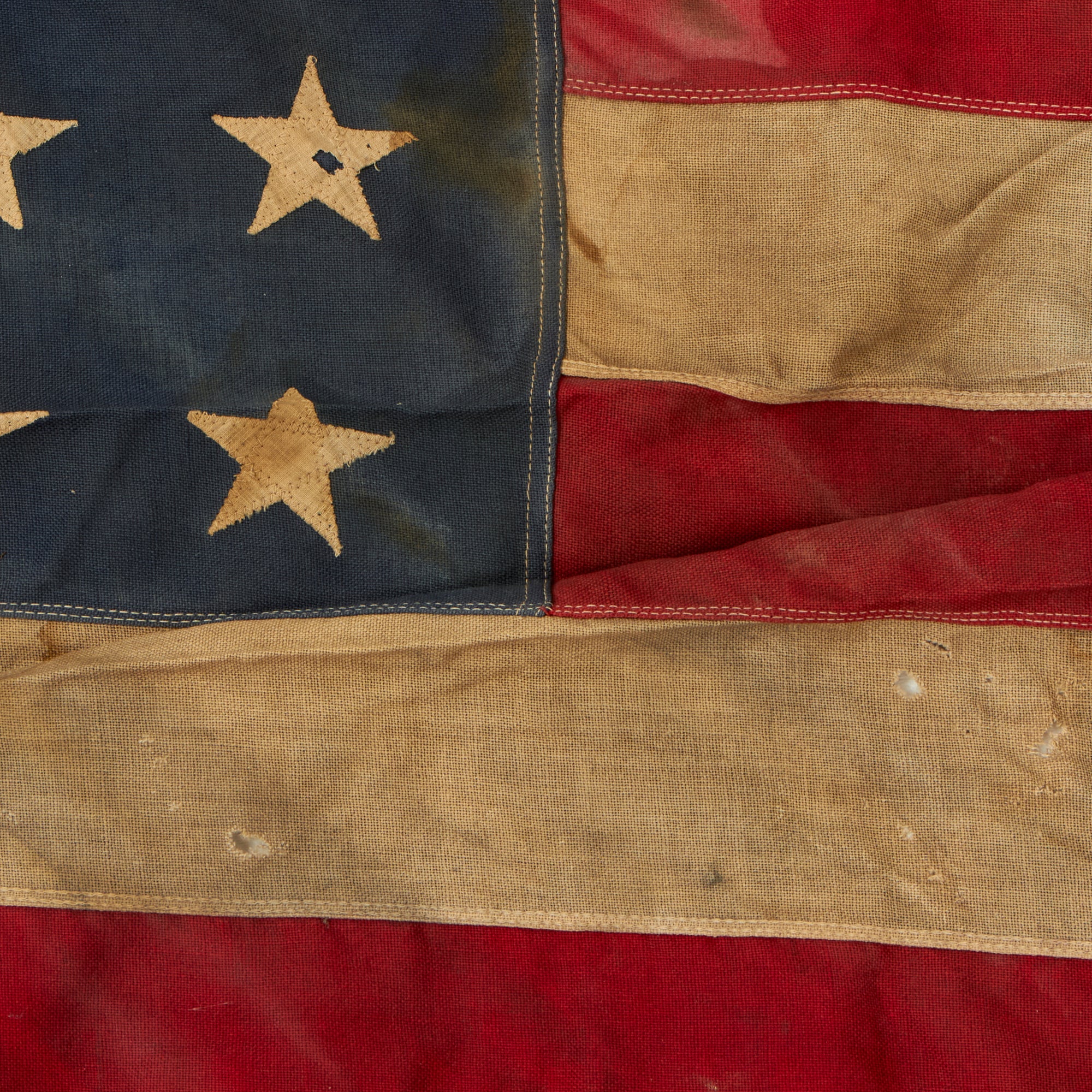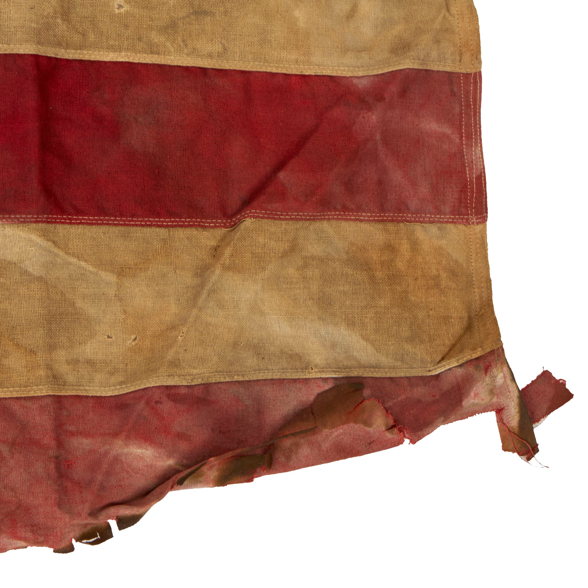 The flag was crudely folded into a triangle and displayed in a small box in the museum. We have removed it from the box in order to display it better. This flag would be a tremendous candidate for proper museum-grade framing. As shown, the flag has suffered some serious burn damage from being in the pile Cooke pulled it from. There is a large tear in the top red stripe roughly halfway through, and another bit of loss in the 8th stripe overall, directly below the blue canton. There are several other small rips and holes as shown, which all contribute heavily to the character of this tremendous flag.