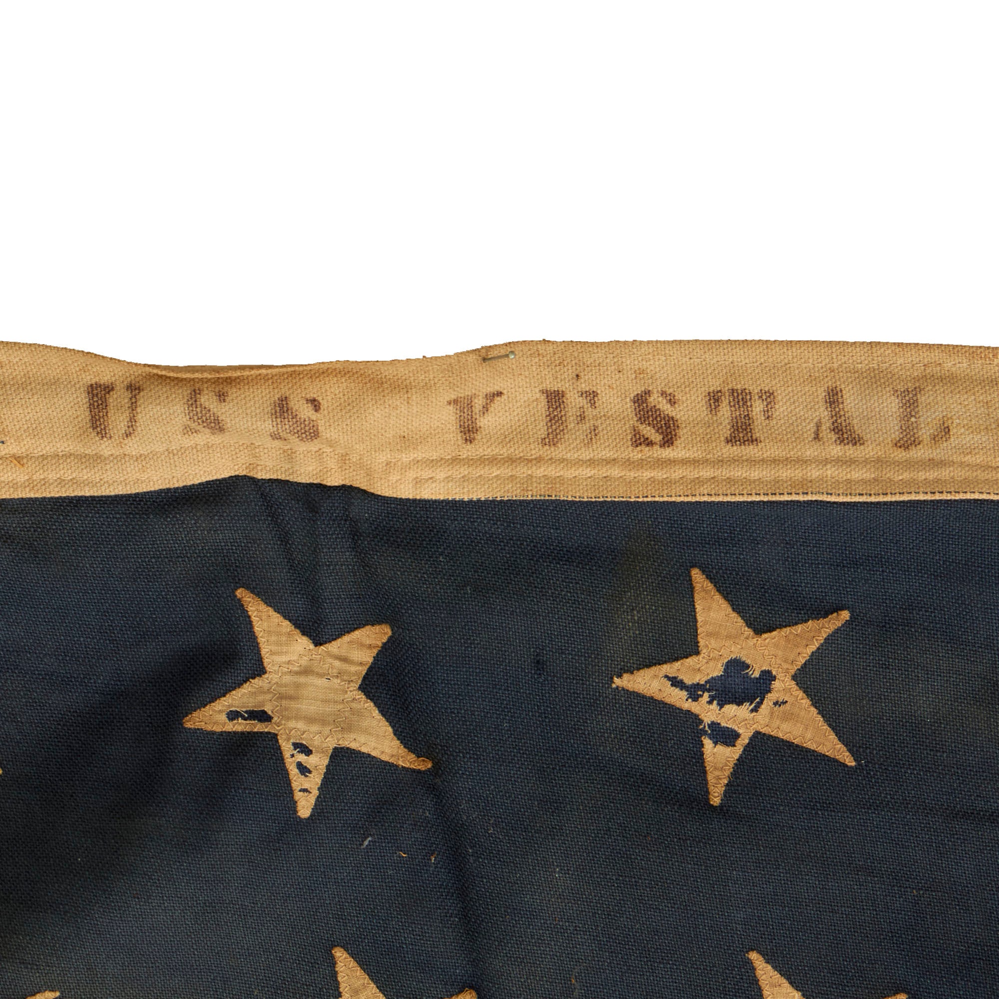 The flag, which measures roughly 46 x 64”, is stenciled along the header USS VESTAL, with the following inscription next to it:
