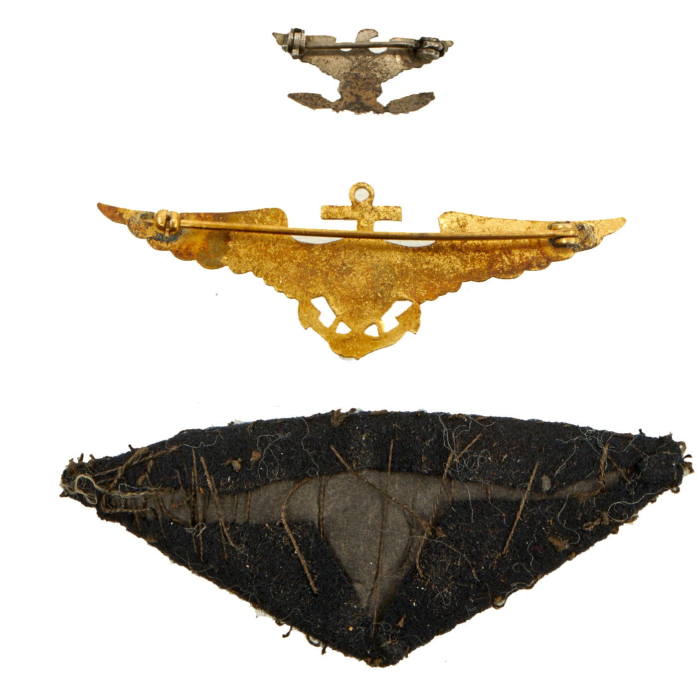 - Naval Aviation Wings: The wings are golden for officer use and still have the pin and clutch assembly on the back, with minor verdigris present. They are unmarked.