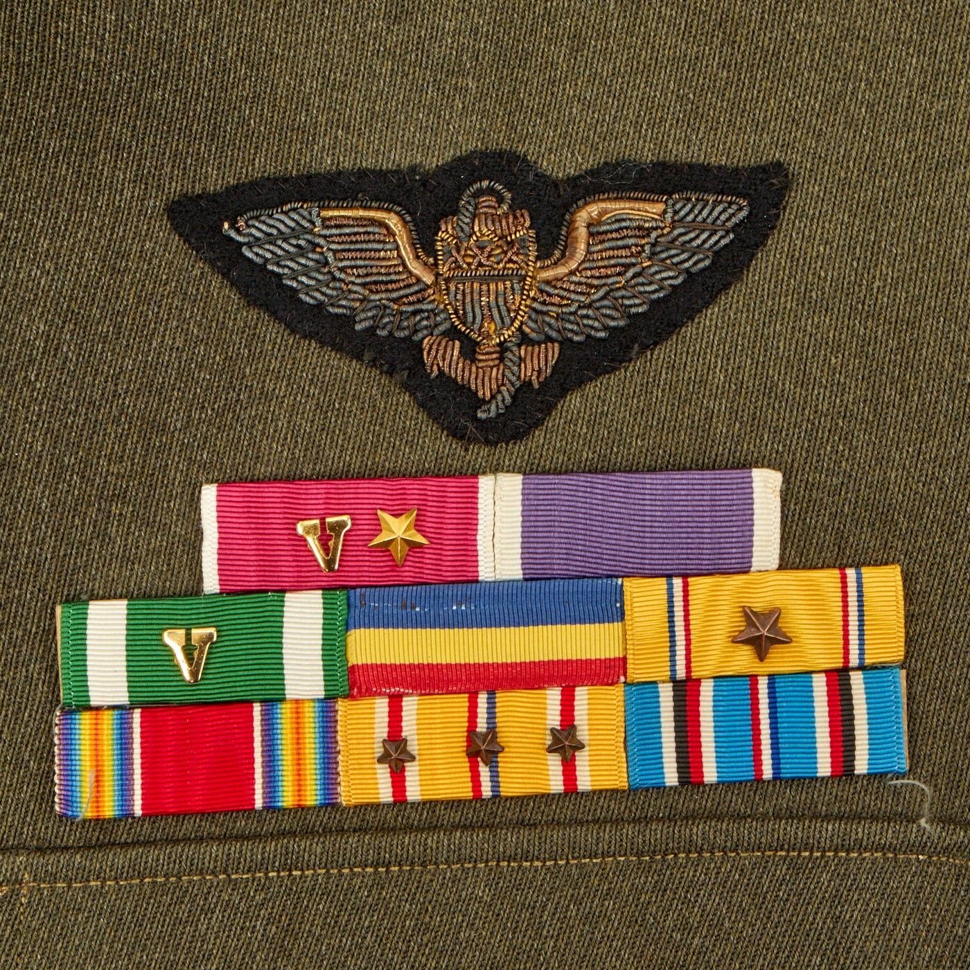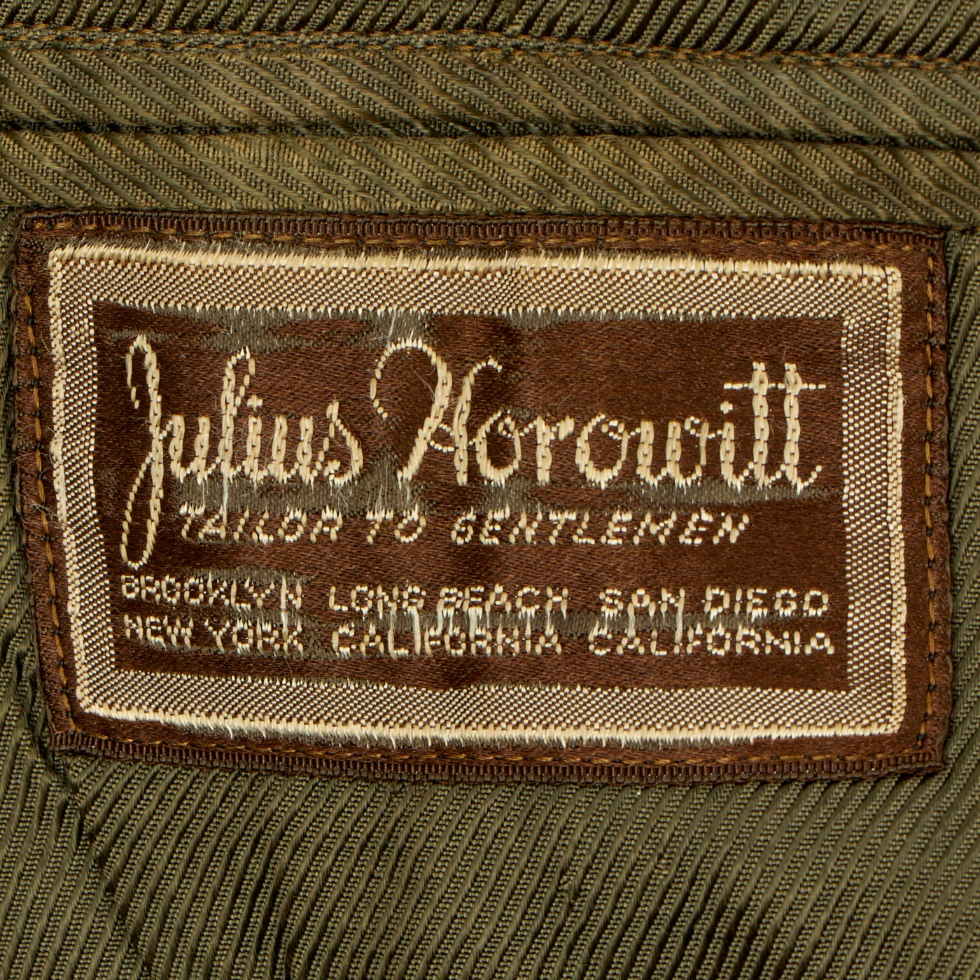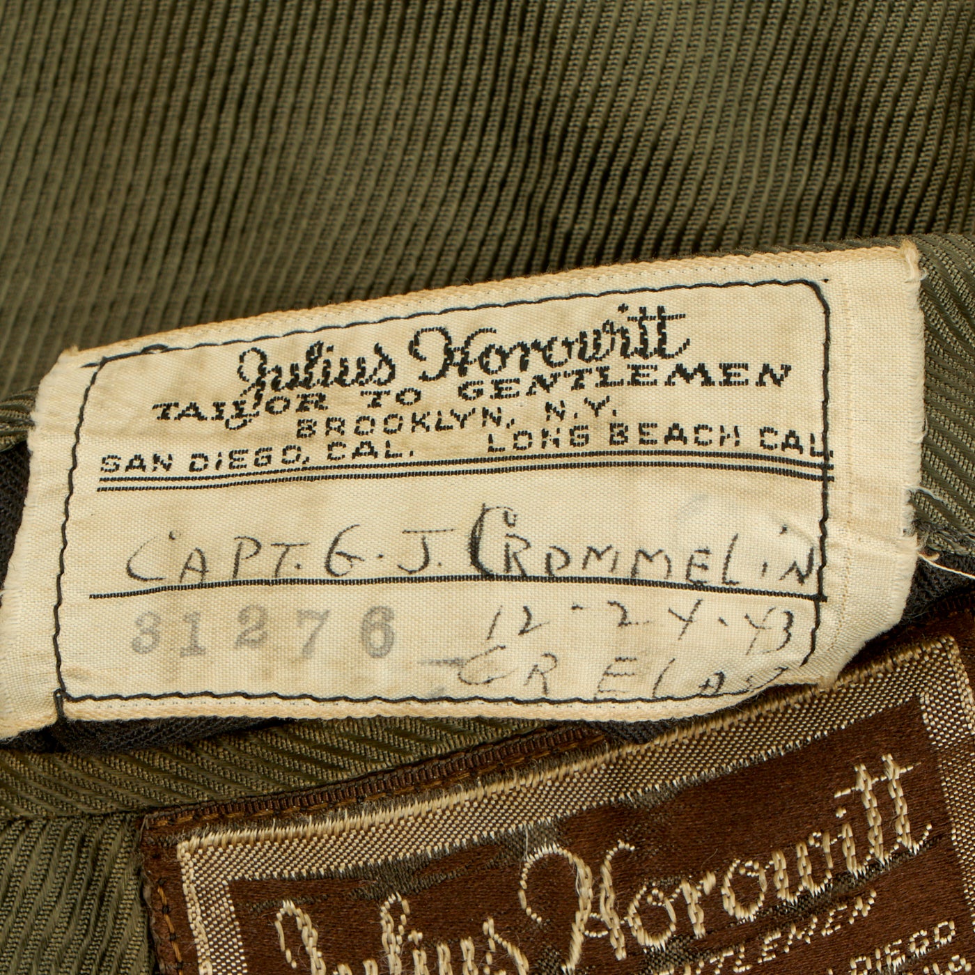 - Green Naval Uniform Jacket and Trousers: The uniform jacket and trousers are named to Crommelin and his handwritten name can be found on the inside right pocket tag. The jacket features a beautiful bullion Naval Aviation wings, as well as his ribbon stack. The ribbons that appear on the jacket are: Legion of Merit with Star and “V”, Purple Heart, Navy and Marine Corps Commendation with “V”, Navy and Marine Corps Presidential Unit Citation, American Defense with Star, WWII Victory Medal, Asiatic-Pacific with 3 Stars and an American Campaign. The uniform is offered in excellent condition.