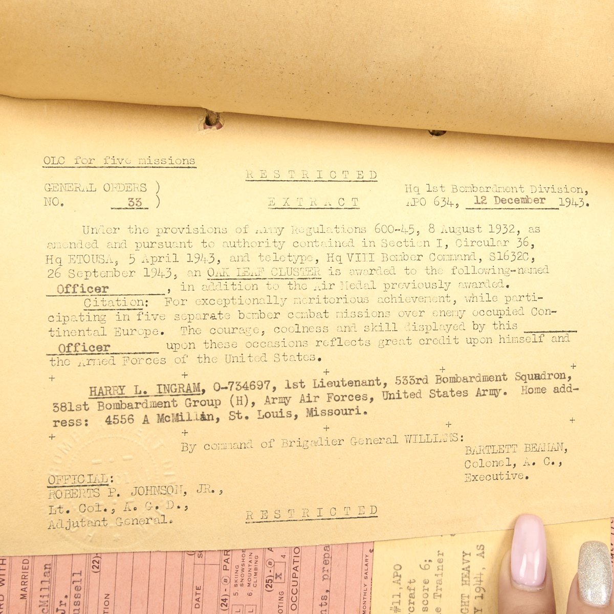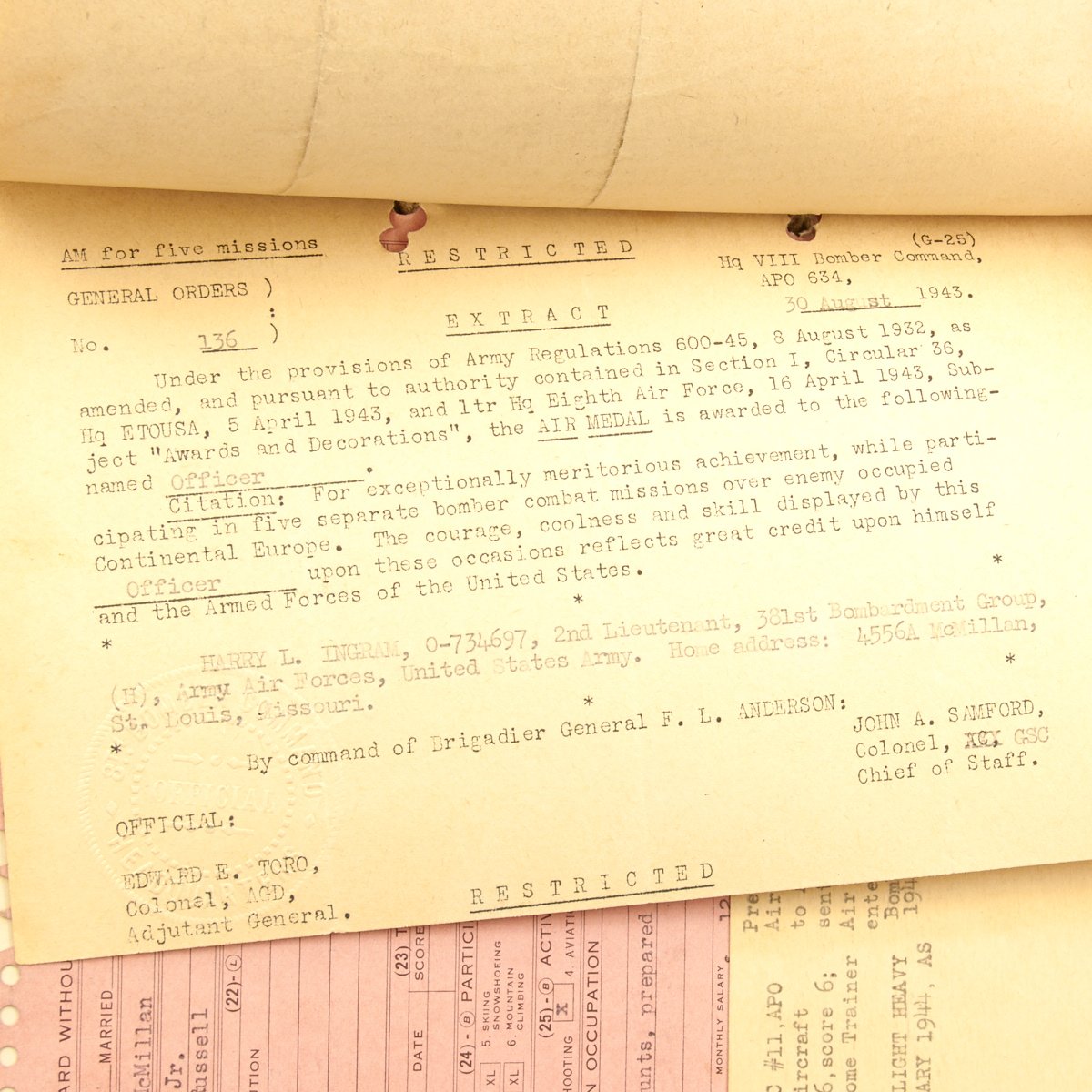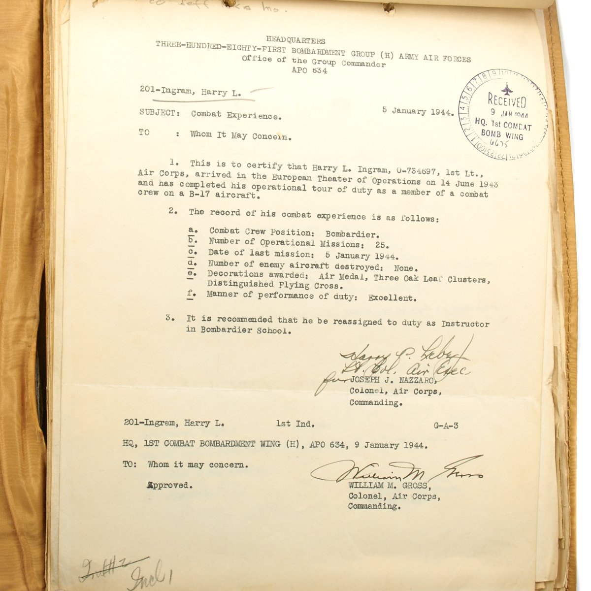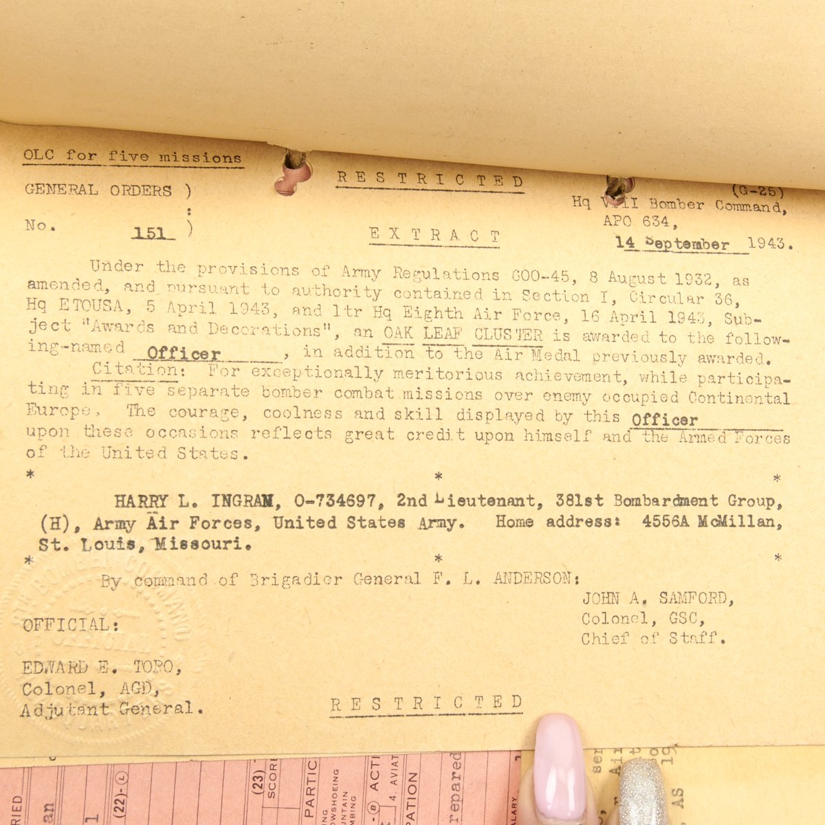 Original Items: One-of-a-kind set. 1st Lieutenant Harry Lee Ingram 0-734697 was the Navigator aboard B-17 Flying Fortresses as a member of the 8th Air Force, 381st Bombardement Group, 533rd Bomb Squadron during WWII. He flew 25 missions between July 17th, 1943 and January 4th, 1944. He was a recipient of the Air Medal with three oak leaf clusters and the Distinguished Flying Cross. This grouping while fascinating is quite rare in the fact that his hand written flight log book detailing all 25 "sorties" is included. This book describes each mission in detail including the date, target, formation, weather, enemy encountered, number and type of bombs dropped and more. Also included is what appears to be almost every official document Ingram was issued by the military, all the way back to his induction paperwork, through his DFC citation paper work to his discharge in the 1960s. It is easily the most extensive historical document record for one soldier we have ever seen.