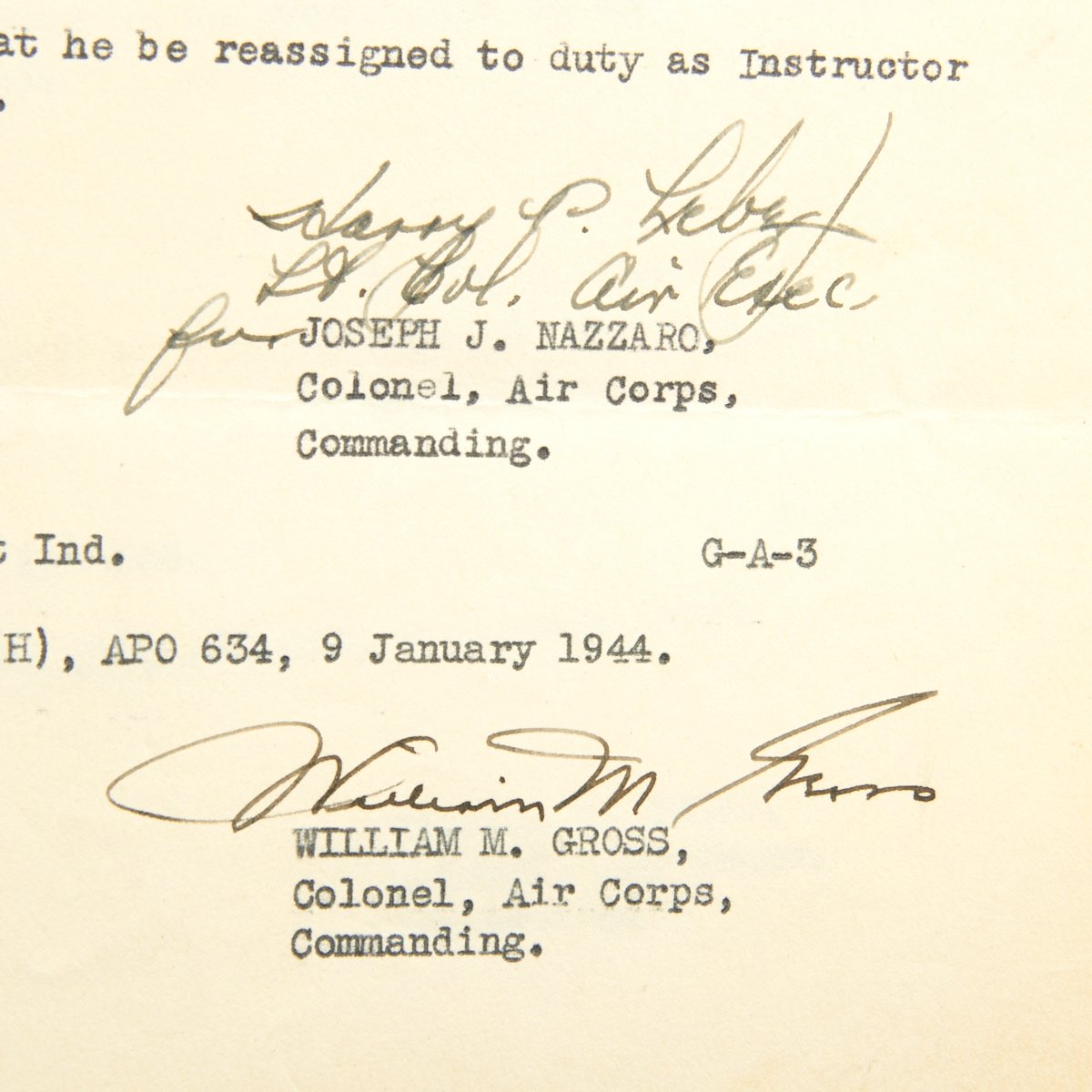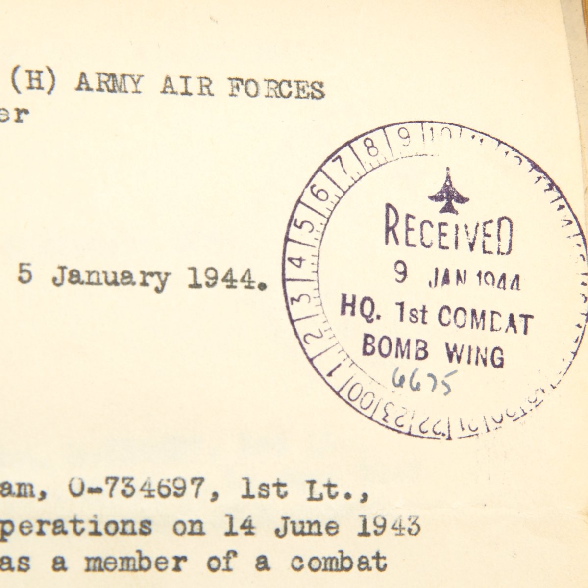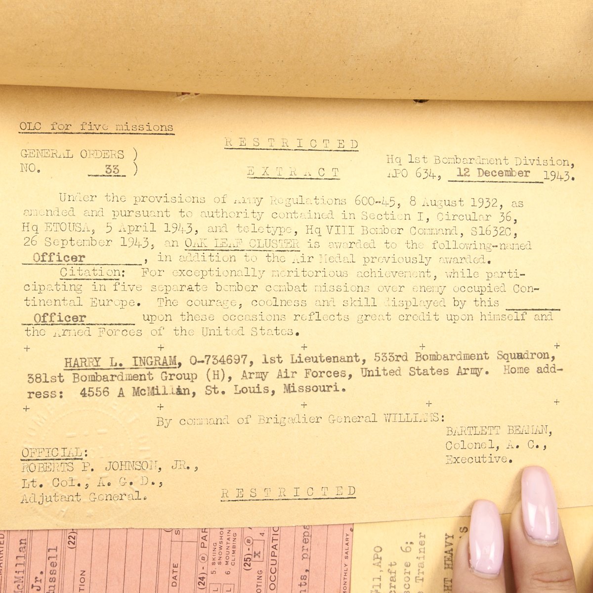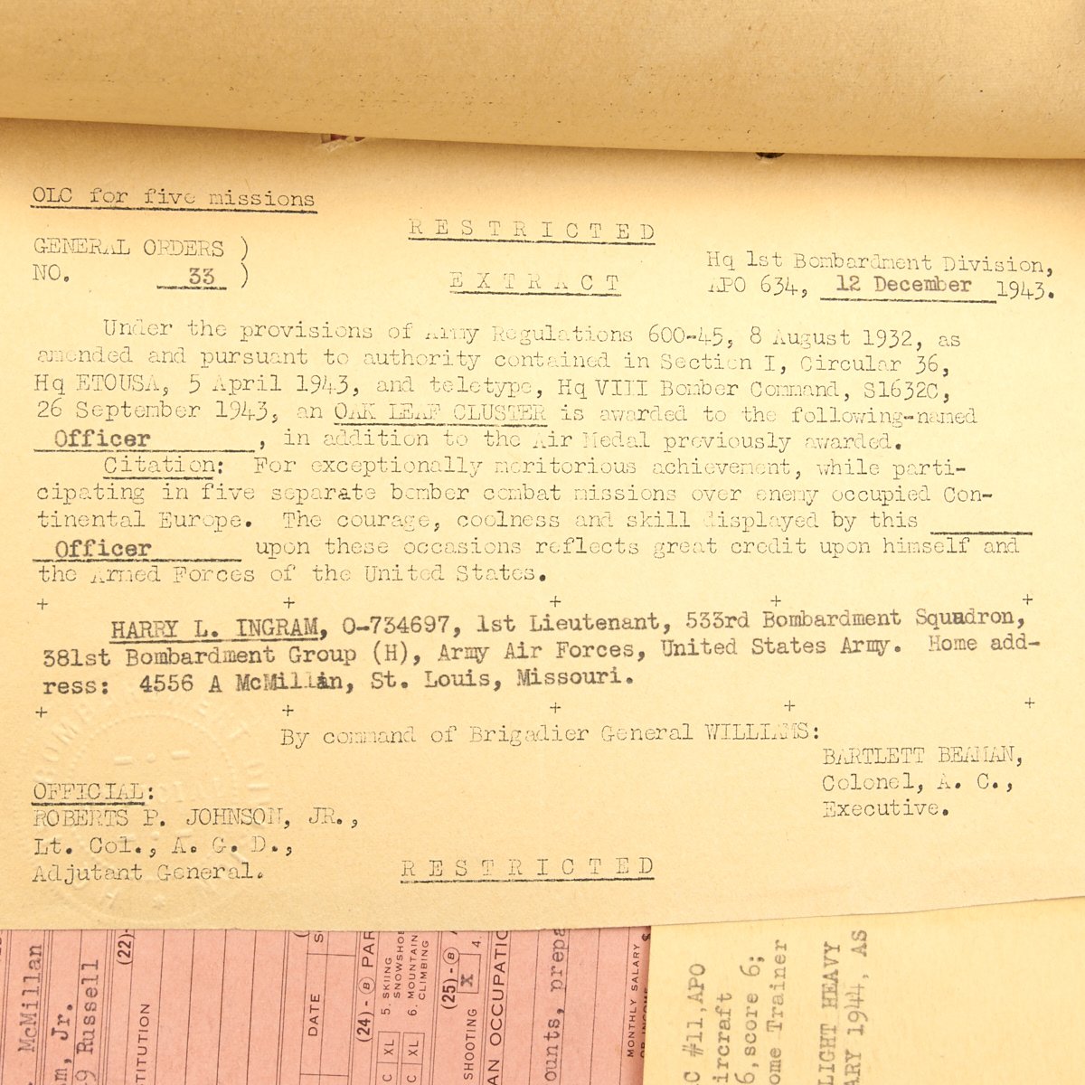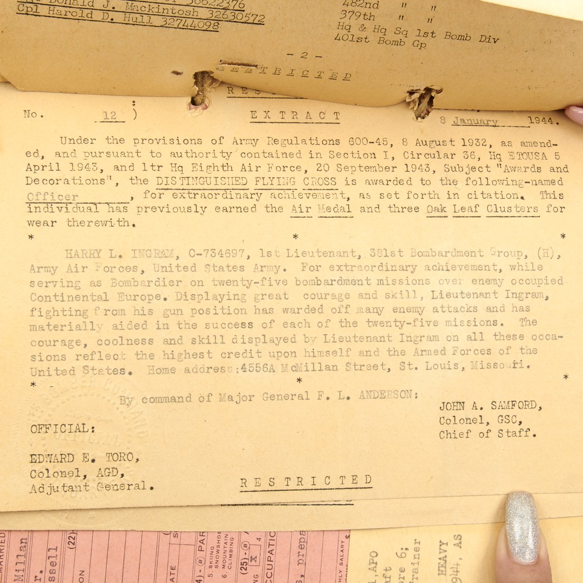 Original Items: One-of-a-kind set. 1st Lieutenant Harry Lee Ingram 0-734697 was the Navigator aboard B-17 Flying Fortresses as a member of the 8th Air Force, 381st Bombardement Group, 533rd Bomb Squadron during WWII. He flew 25 missions between July 17th, 1943 and January 4th, 1944. He was a recipient of the Air Medal with three oak leaf clusters and the Distinguished Flying Cross. This grouping while fascinating is quite rare in the fact that his hand written flight log book detailing all 25 "sorties" is included. This book describes each mission in detail including the date, target, formation, weather, enemy encountered, number and type of bombs dropped and more. Also included is what appears to be almost every official document Ingram was issued by the military, all the way back to his induction paperwork, through his DFC citation paper work to his discharge in the 1960s. It is easily the most extensive historical document record for one soldier we have ever seen.