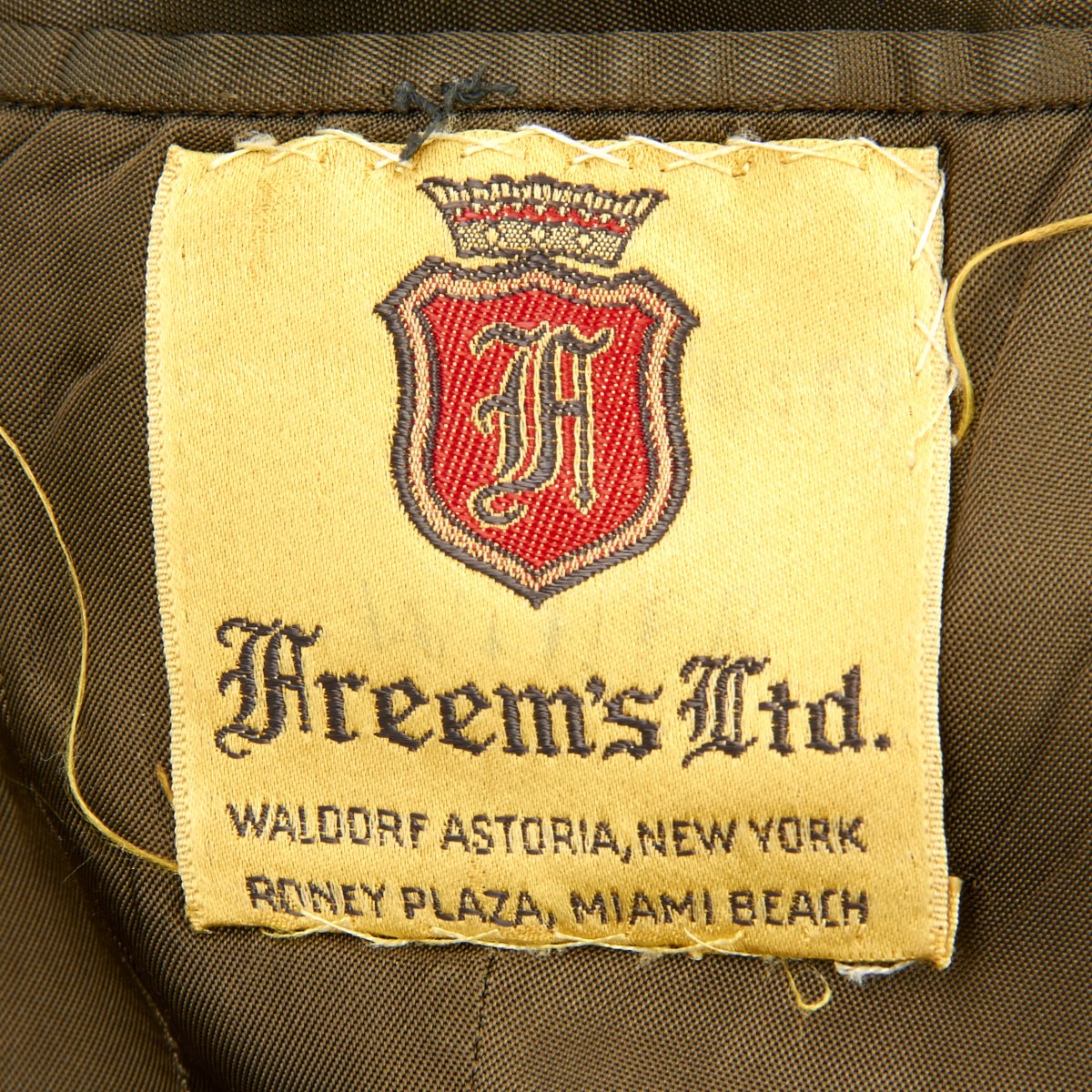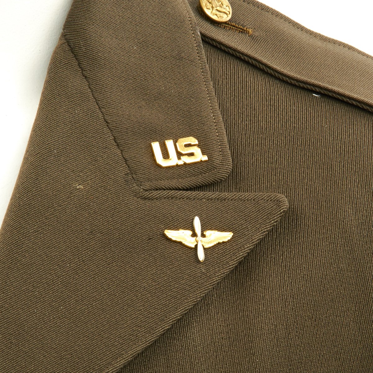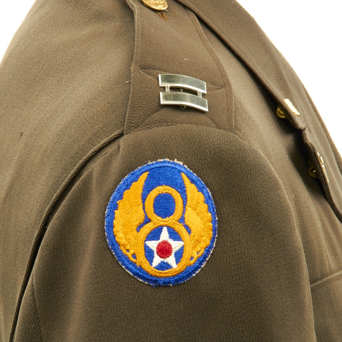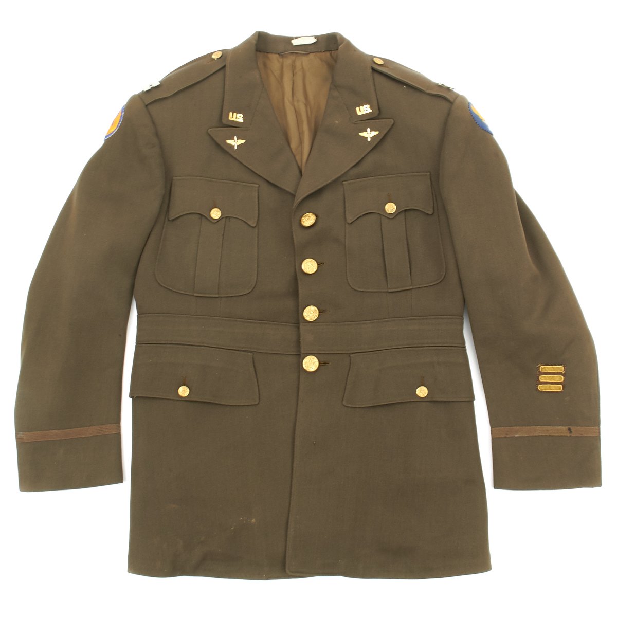 - Original WWII U.S. Class A four pocket officer tunic with Lieutenant bars on each shoulder, early Army Air Force patch, 8th Air Force patch, 3 overseas bars on left sleeve, tailor label from Freem's Ltd located in New York City inside the Waldorf Astoria Hotel.