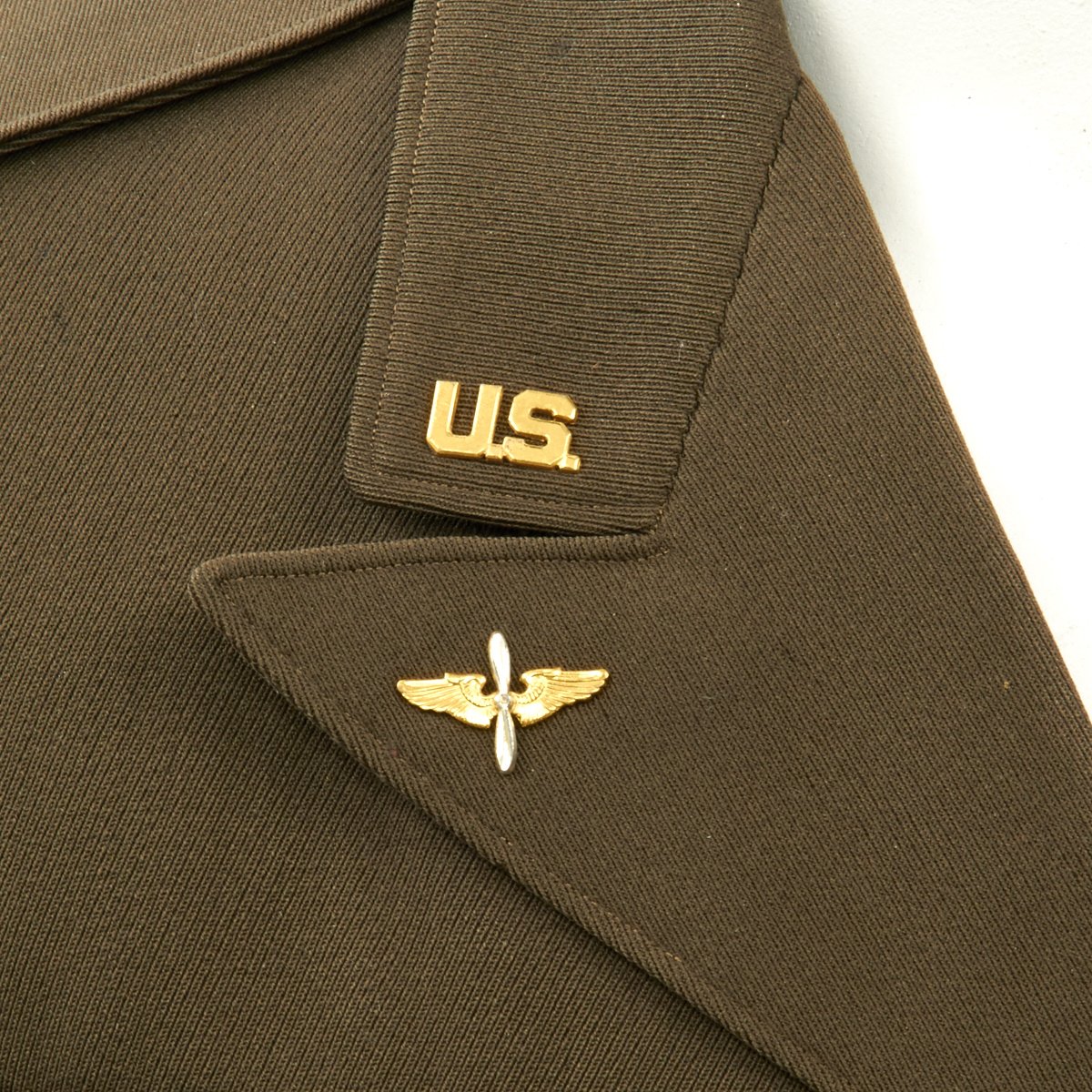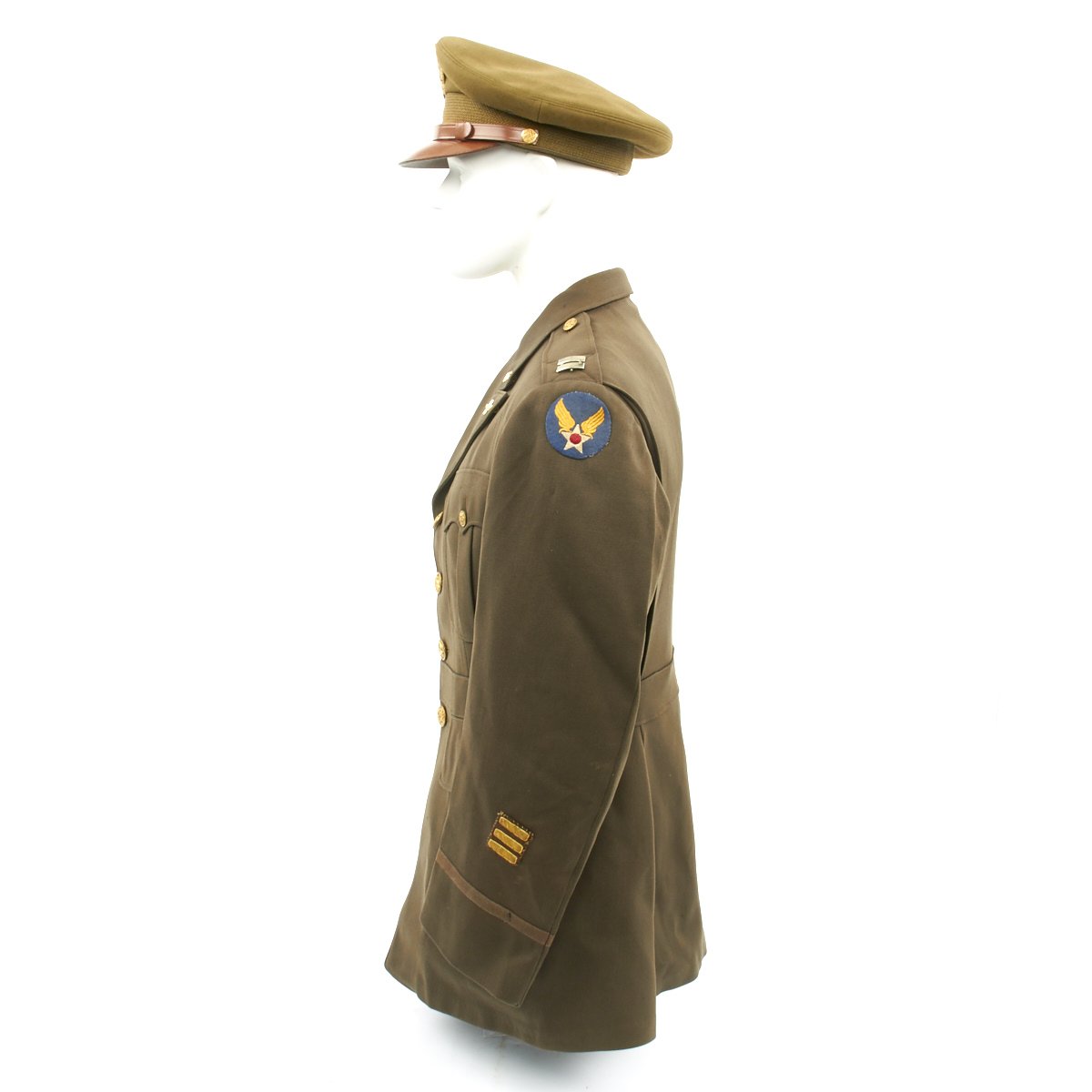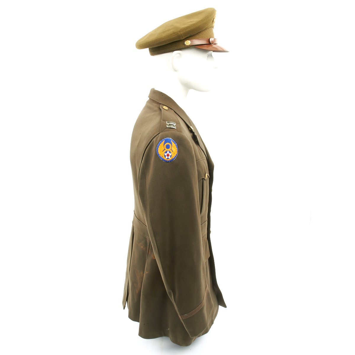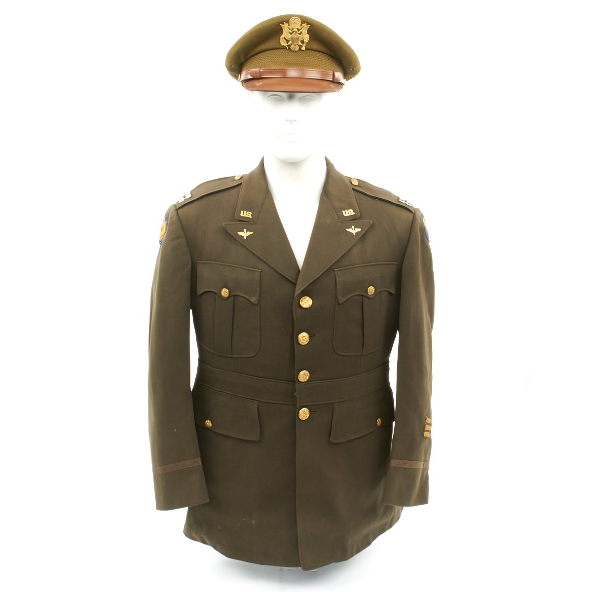 - Original WWII U.S. Class A four pocket officer tunic with Lieutenant bars on each shoulder, early Army Air Force patch, 8th Air Force patch, 3 overseas bars on left sleeve, tailor label from Freem's Ltd located in New York City inside the Waldorf Astoria Hotel.