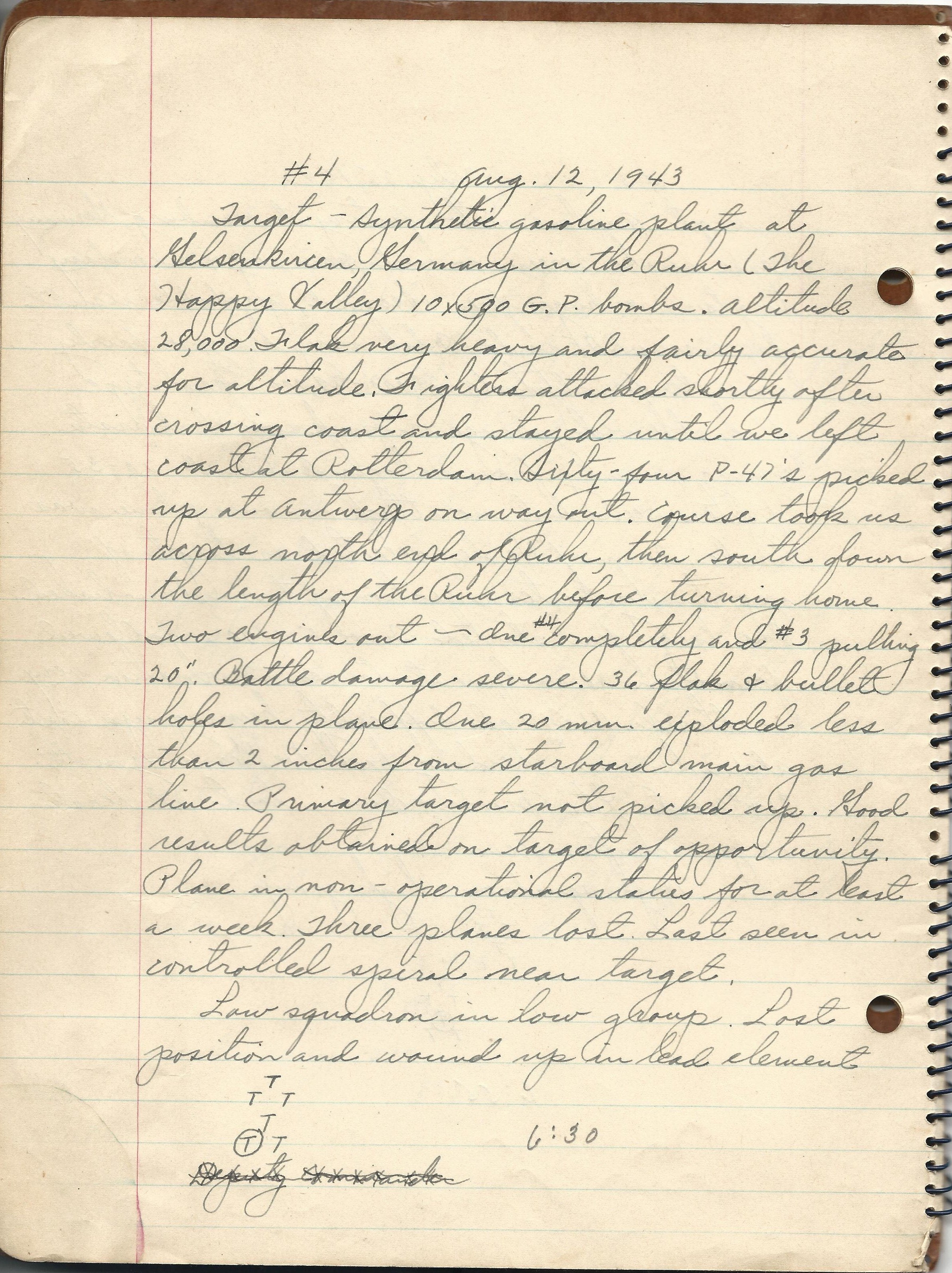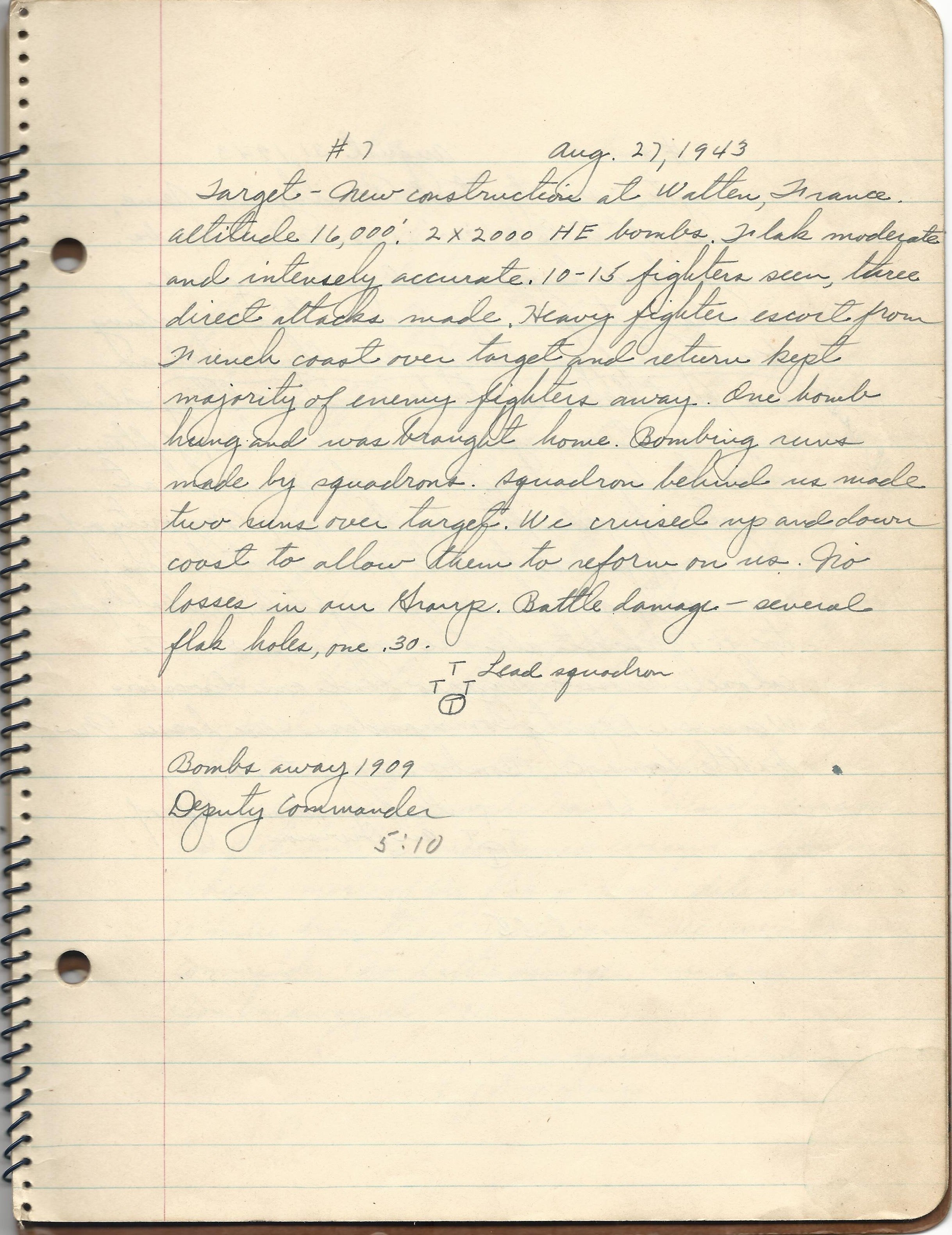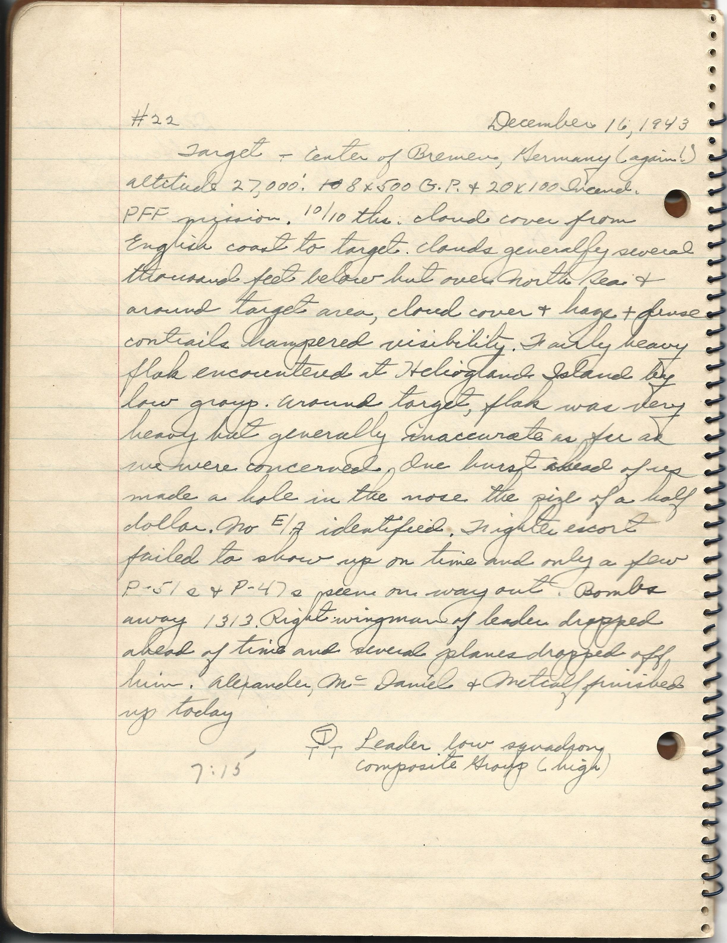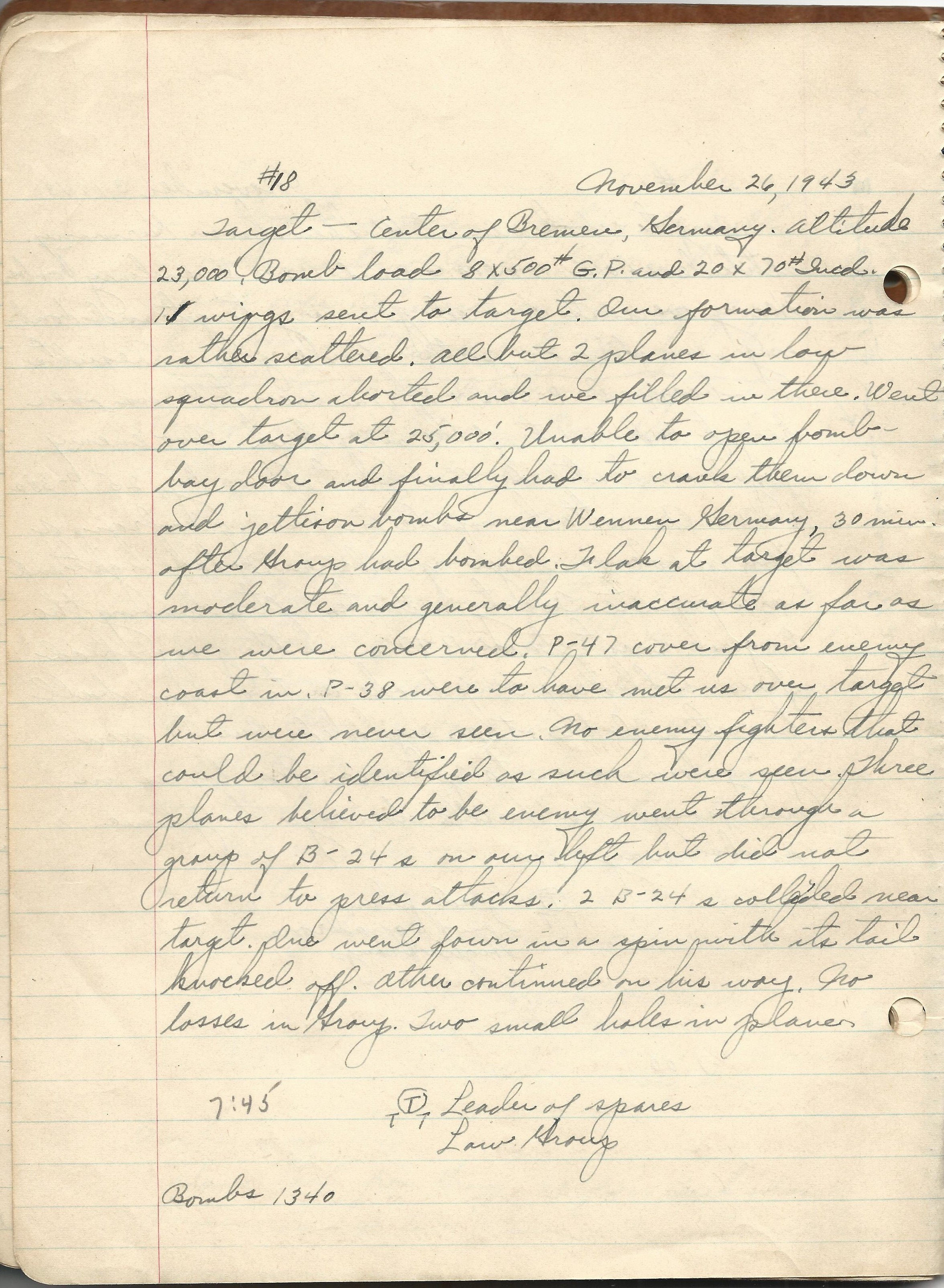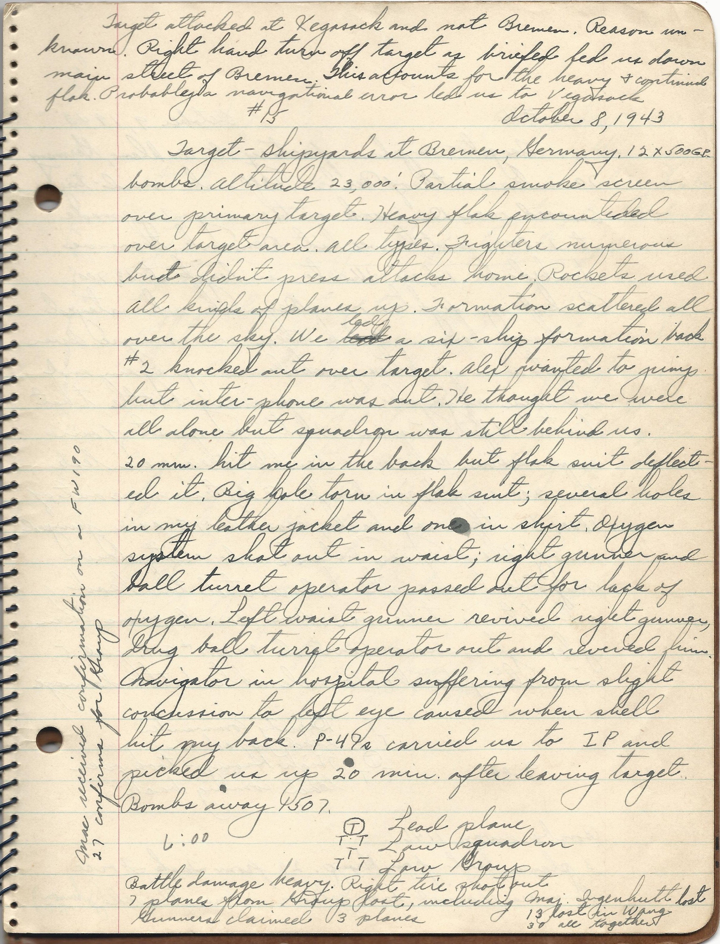 Mission #15 October 8,1943Target- Shipyards at Bremen, Germany. 12 x 500Gr bombs. Altitude 23,000'. Partial smoke screen over primary target. heavy flak encountered over target area. Fighters numerous but didn't press attacks home. Rockets used. All kinds of planes up. Formation scattered all over the sky. We led a six-ship formation back #2 knocked out over target. Alex wanted to jump but inter phone was out. He thought we were all alone but squadron was still behind us. 20mm hit me the back but flak suit deflected it. Big hole torn in flak suit; several holes in my leather jacket and one in my shirt. Oxygen system shot out in waist, right gunner and ball turret operator passed out for lack of oxygen. Left waist gunner revived right gunner, dug ball turret operator out and revived him. Navigator in hospital suffering from slight concussion to left eye caused when shell hit my back. P-47s carried us to IP and picked us up 20 min after leaving target. Bombs away 1507.There are 24 more entries all as detailed as this one. Incredible!