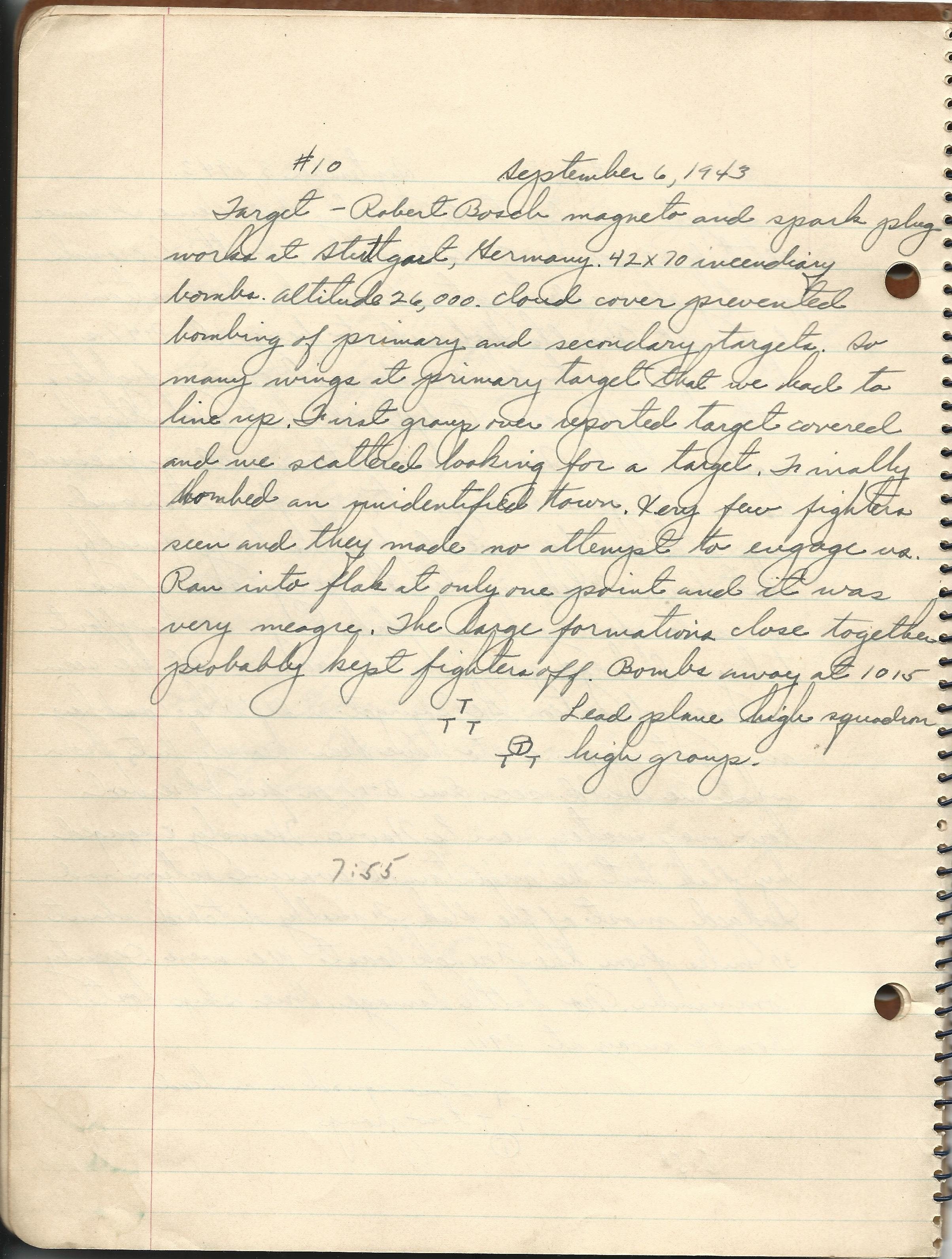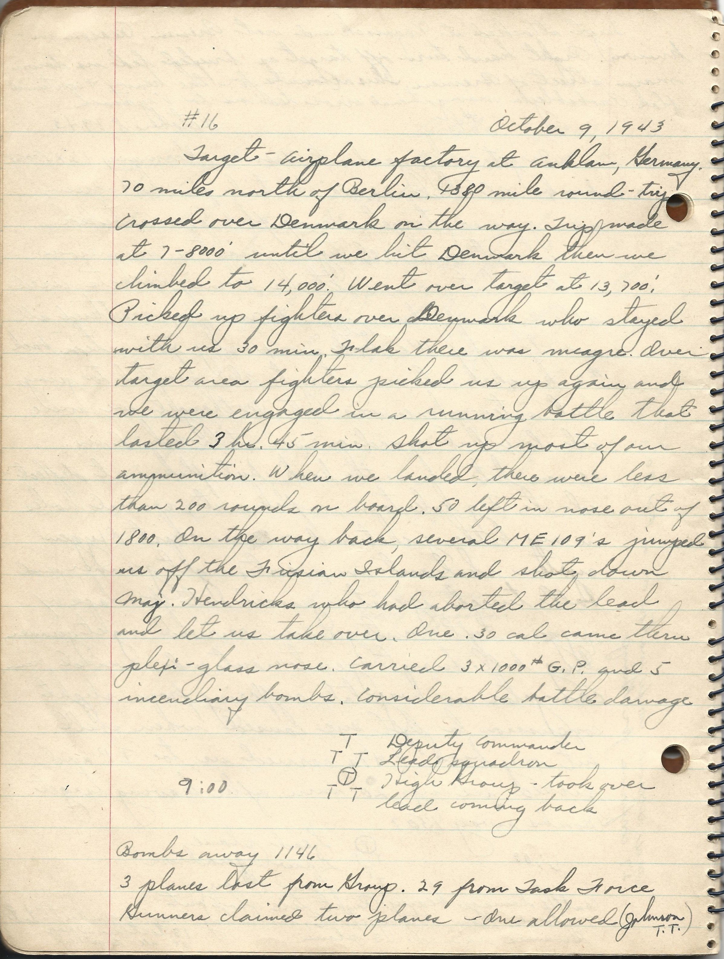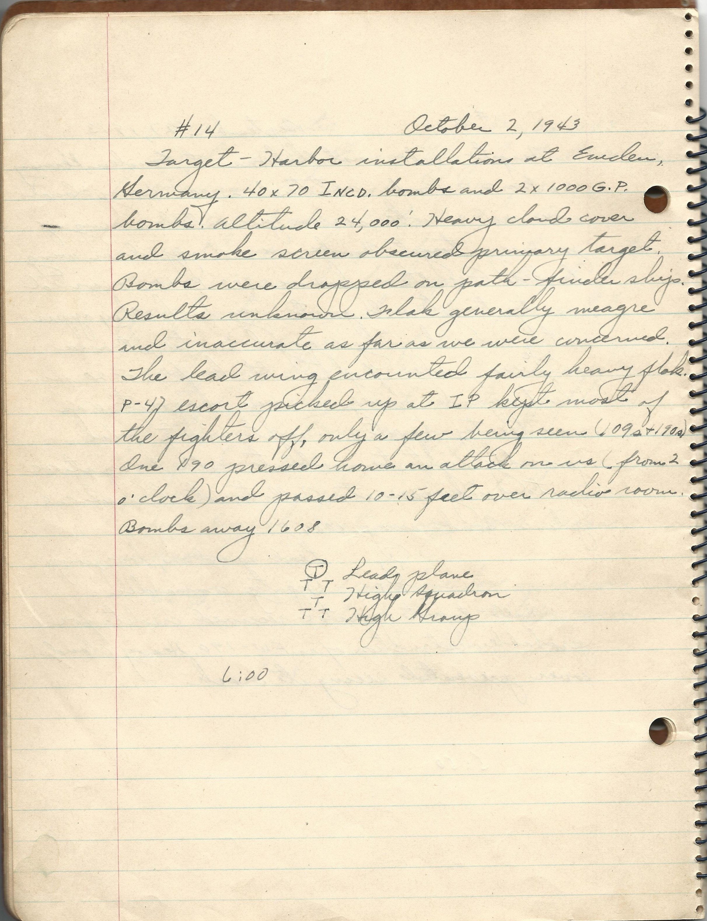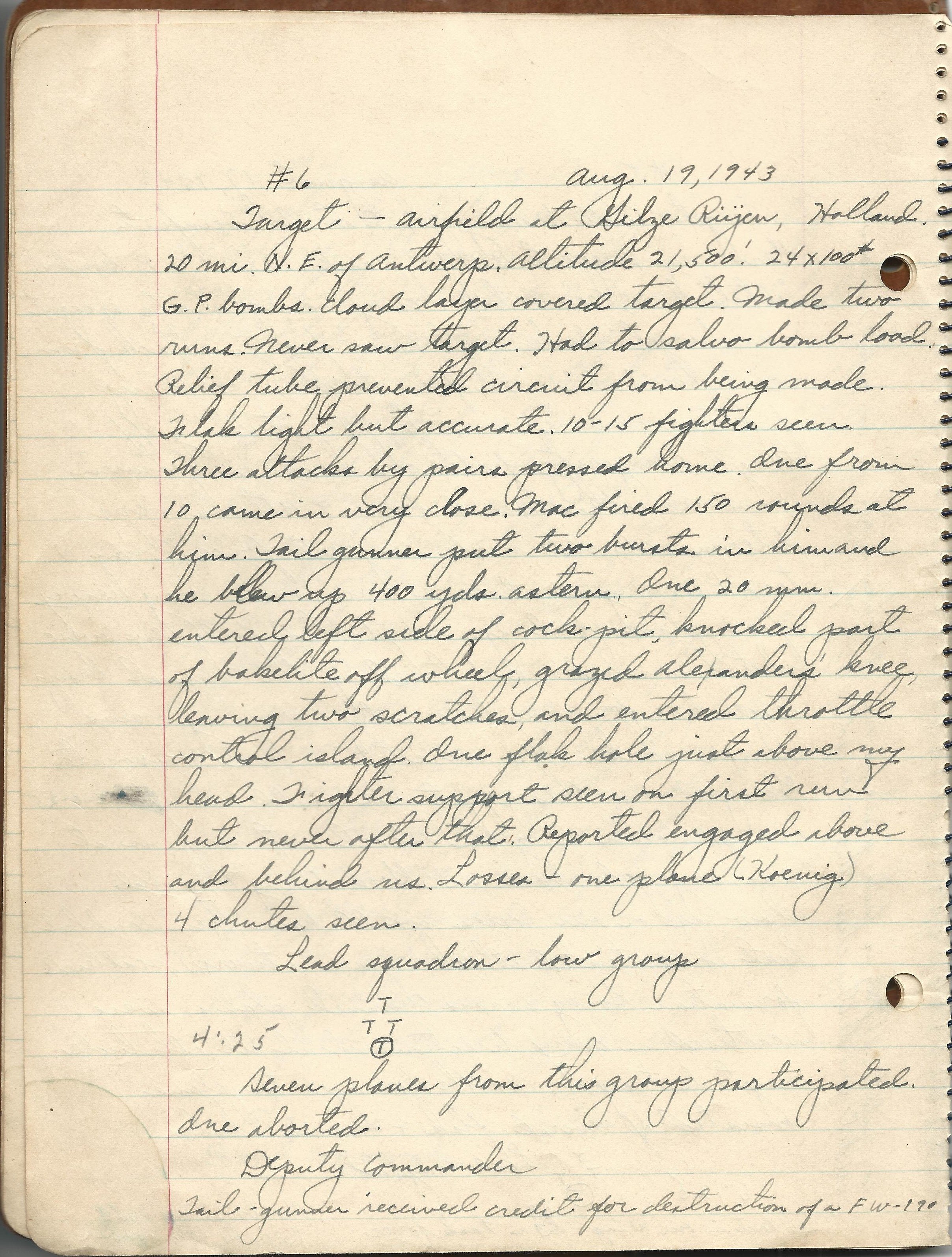 Mission #15 October 8,1943Target- Shipyards at Bremen, Germany. 12 x 500Gr bombs. Altitude 23,000'. Partial smoke screen over primary target. heavy flak encountered over target area. Fighters numerous but didn't press attacks home. Rockets used. All kinds of planes up. Formation scattered all over the sky. We led a six-ship formation back #2 knocked out over target. Alex wanted to jump but inter phone was out. He thought we were all alone but squadron was still behind us. 20mm hit me the back but flak suit deflected it. Big hole torn in flak suit; several holes in my leather jacket and one in my shirt. Oxygen system shot out in waist, right gunner and ball turret operator passed out for lack of oxygen. Left waist gunner revived right gunner, dug ball turret operator out and revived him. Navigator in hospital suffering from slight concussion to left eye caused when shell hit my back. P-47s carried us to IP and picked us up 20 min after leaving target. Bombs away 1507.There are 24 more entries all as detailed as this one. Incredible!