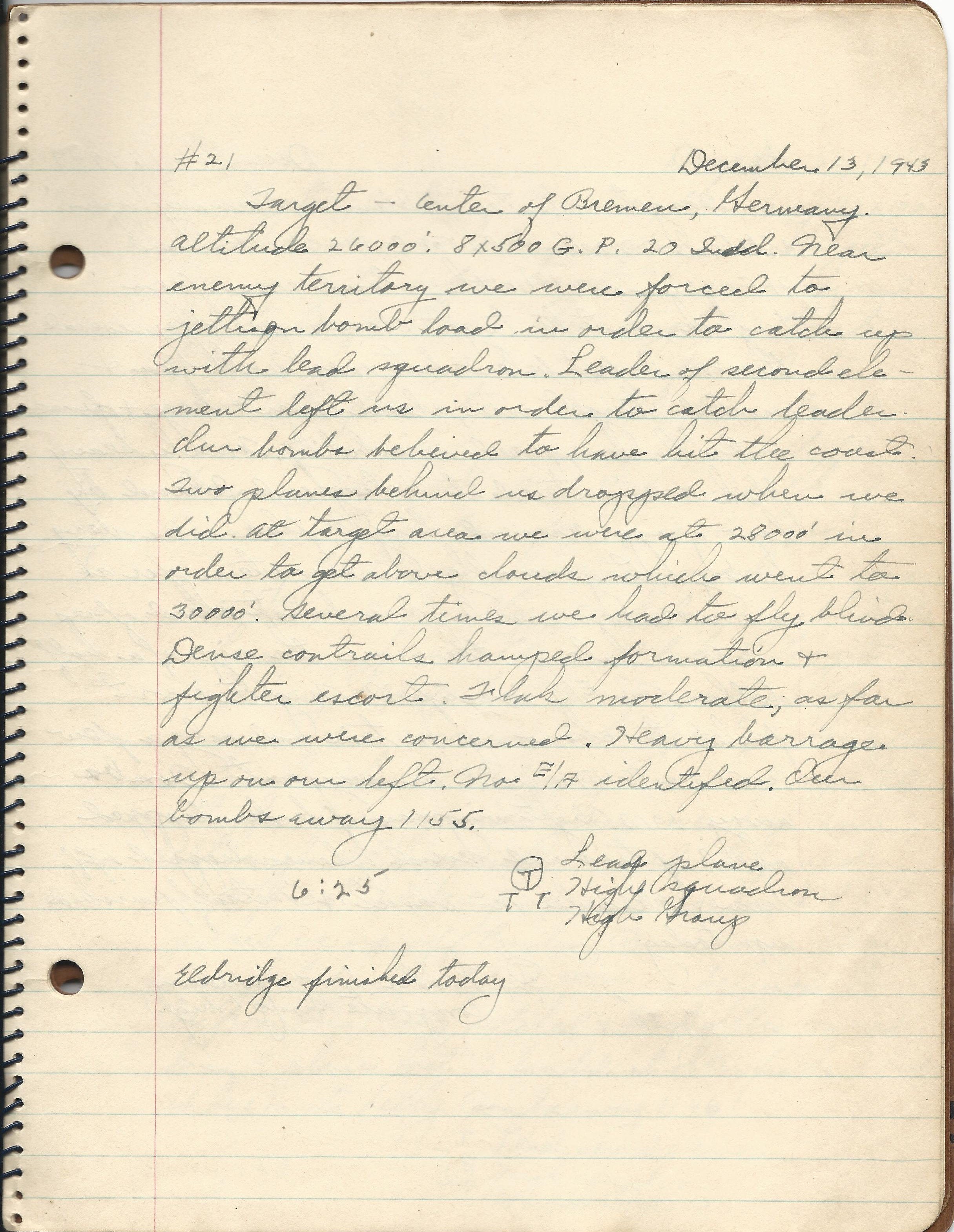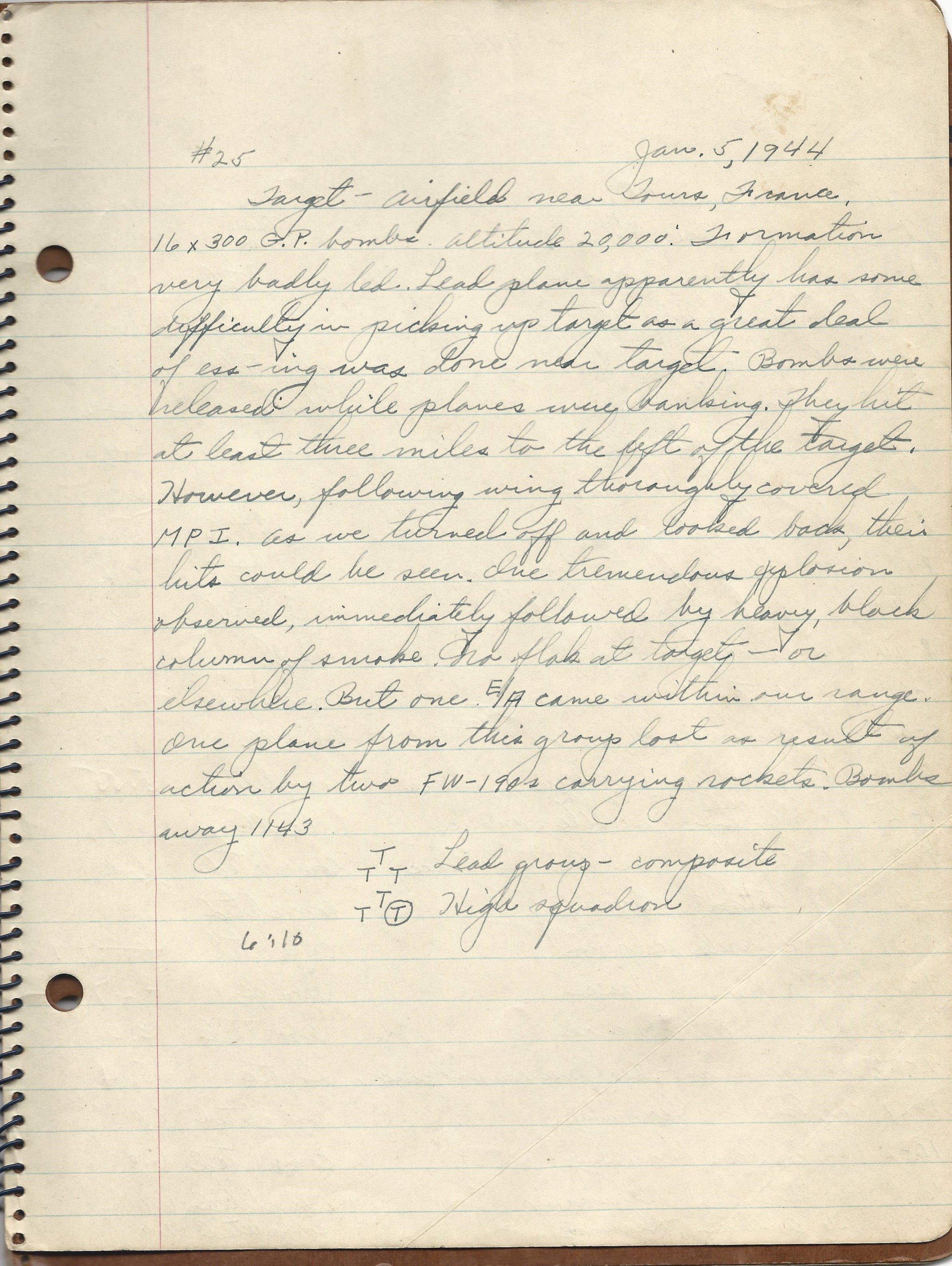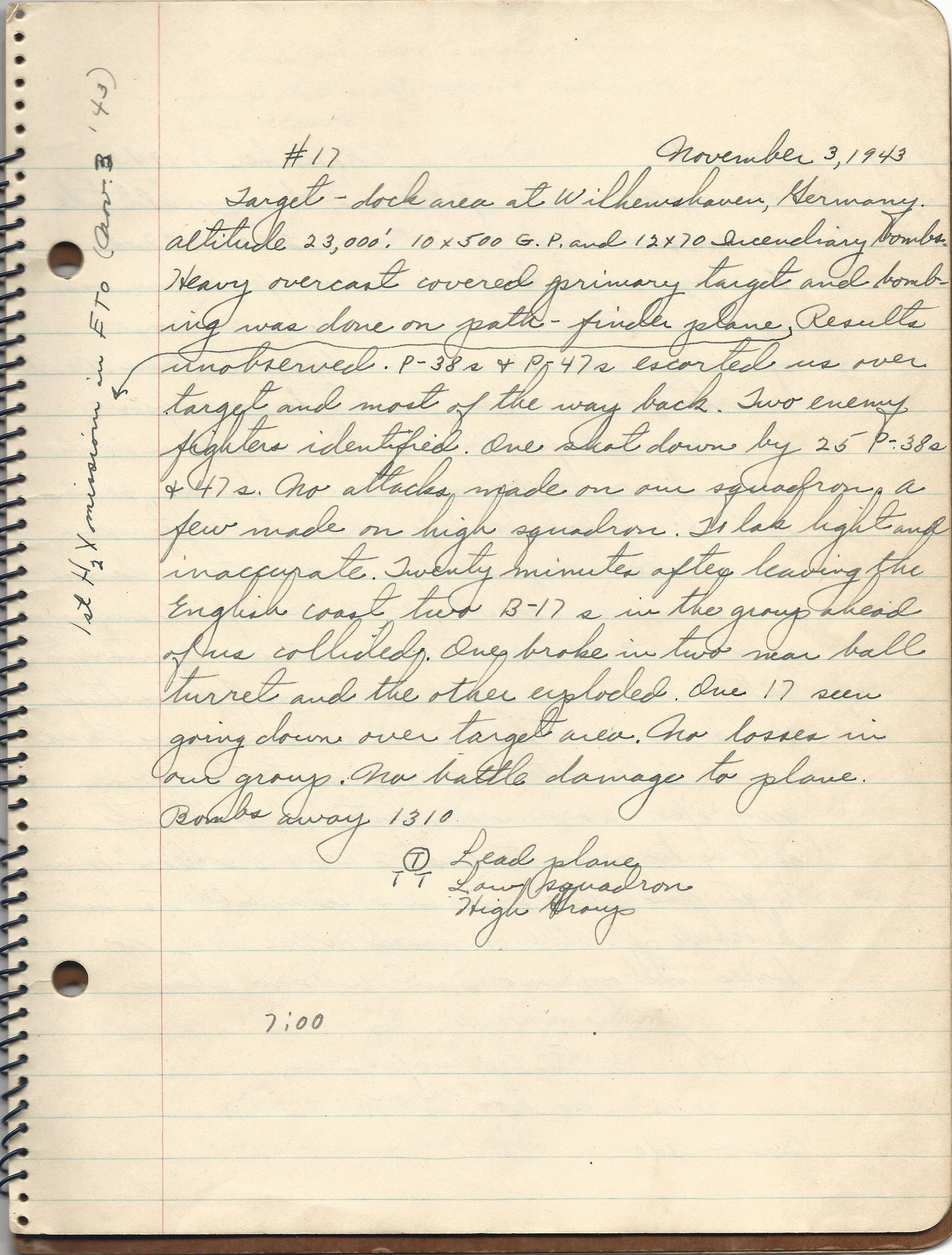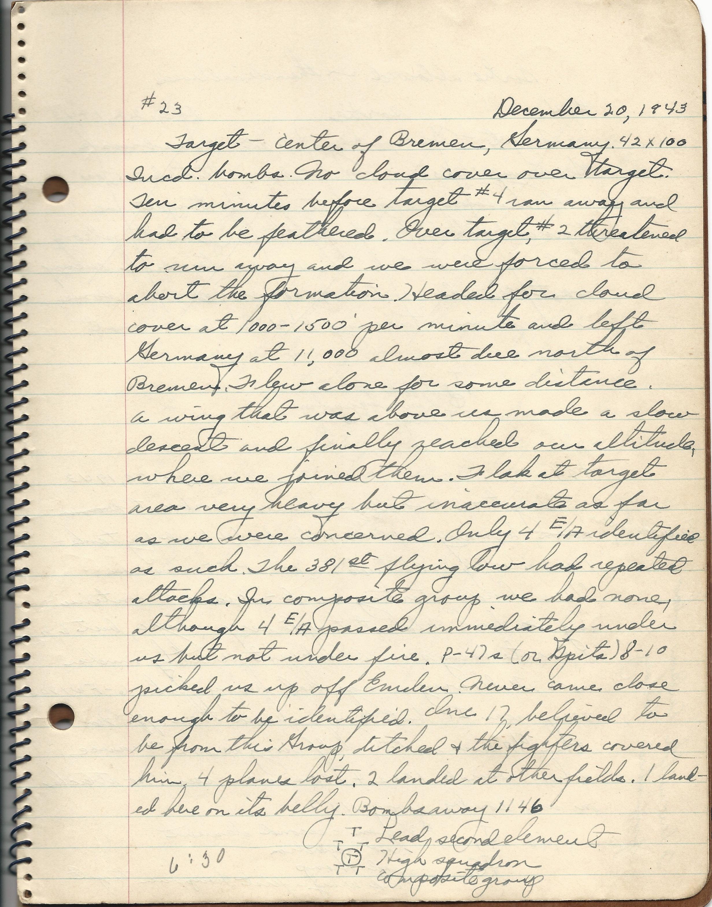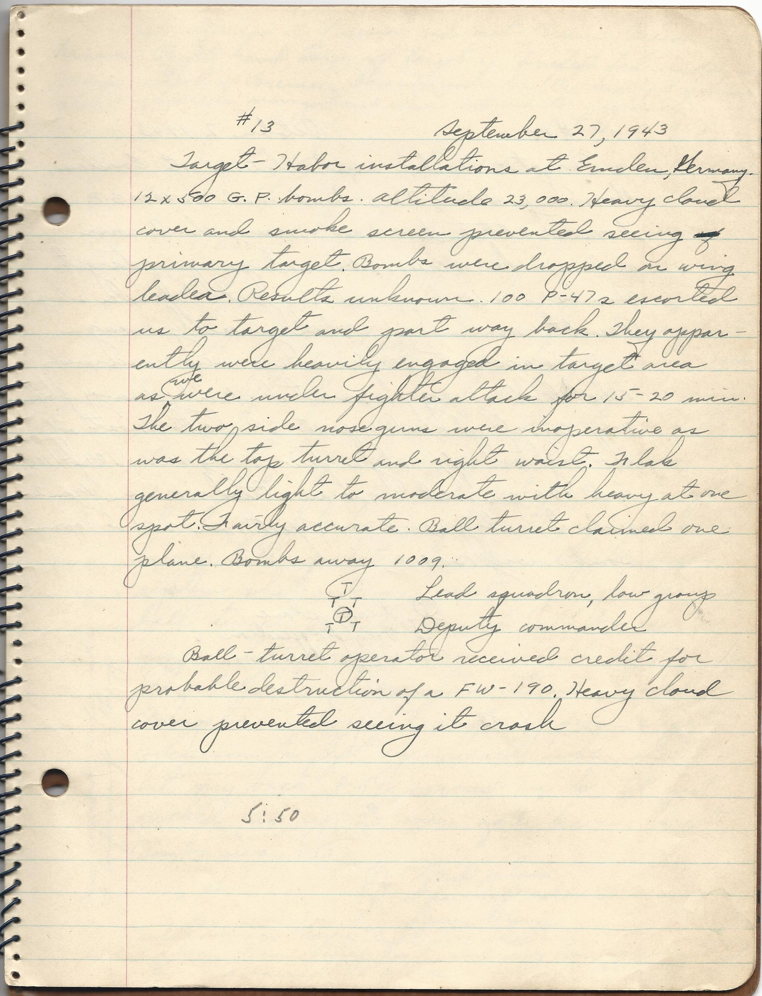 Mission #15 October 8,1943Target- Shipyards at Bremen, Germany. 12 x 500Gr bombs. Altitude 23,000'. Partial smoke screen over primary target. heavy flak encountered over target area. Fighters numerous but didn't press attacks home. Rockets used. All kinds of planes up. Formation scattered all over the sky. We led a six-ship formation back #2 knocked out over target. Alex wanted to jump but inter phone was out. He thought we were all alone but squadron was still behind us. 20mm hit me the back but flak suit deflected it. Big hole torn in flak suit; several holes in my leather jacket and one in my shirt. Oxygen system shot out in waist, right gunner and ball turret operator passed out for lack of oxygen. Left waist gunner revived right gunner, dug ball turret operator out and revived him. Navigator in hospital suffering from slight concussion to left eye caused when shell hit my back. P-47s carried us to IP and picked us up 20 min after leaving target. Bombs away 1507.There are 24 more entries all as detailed as this one. Incredible!