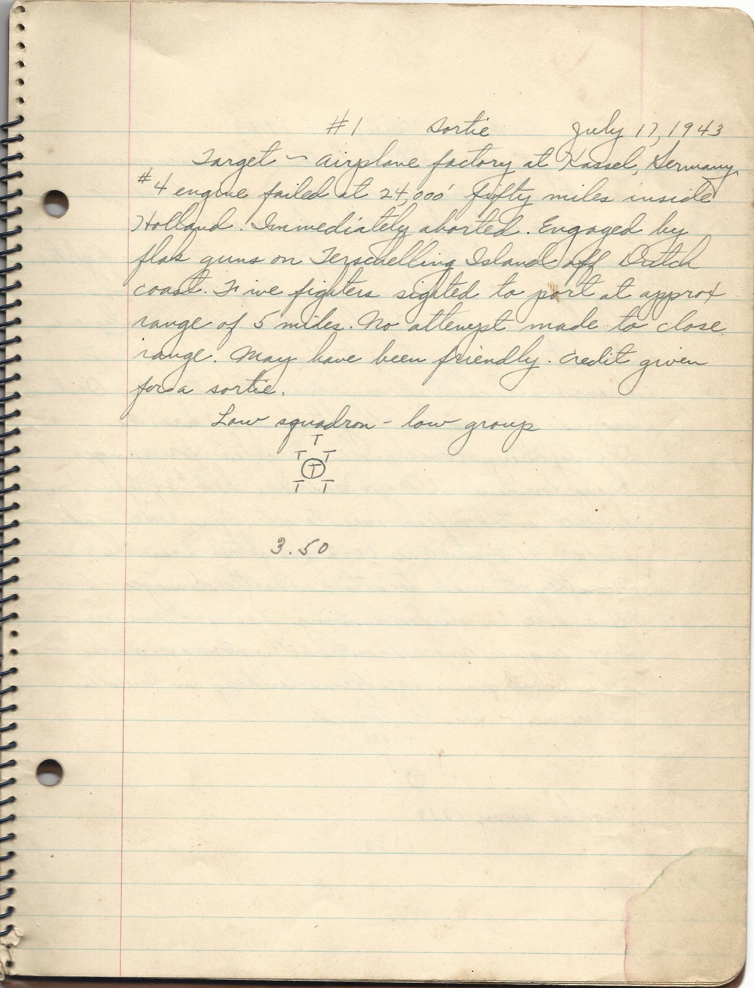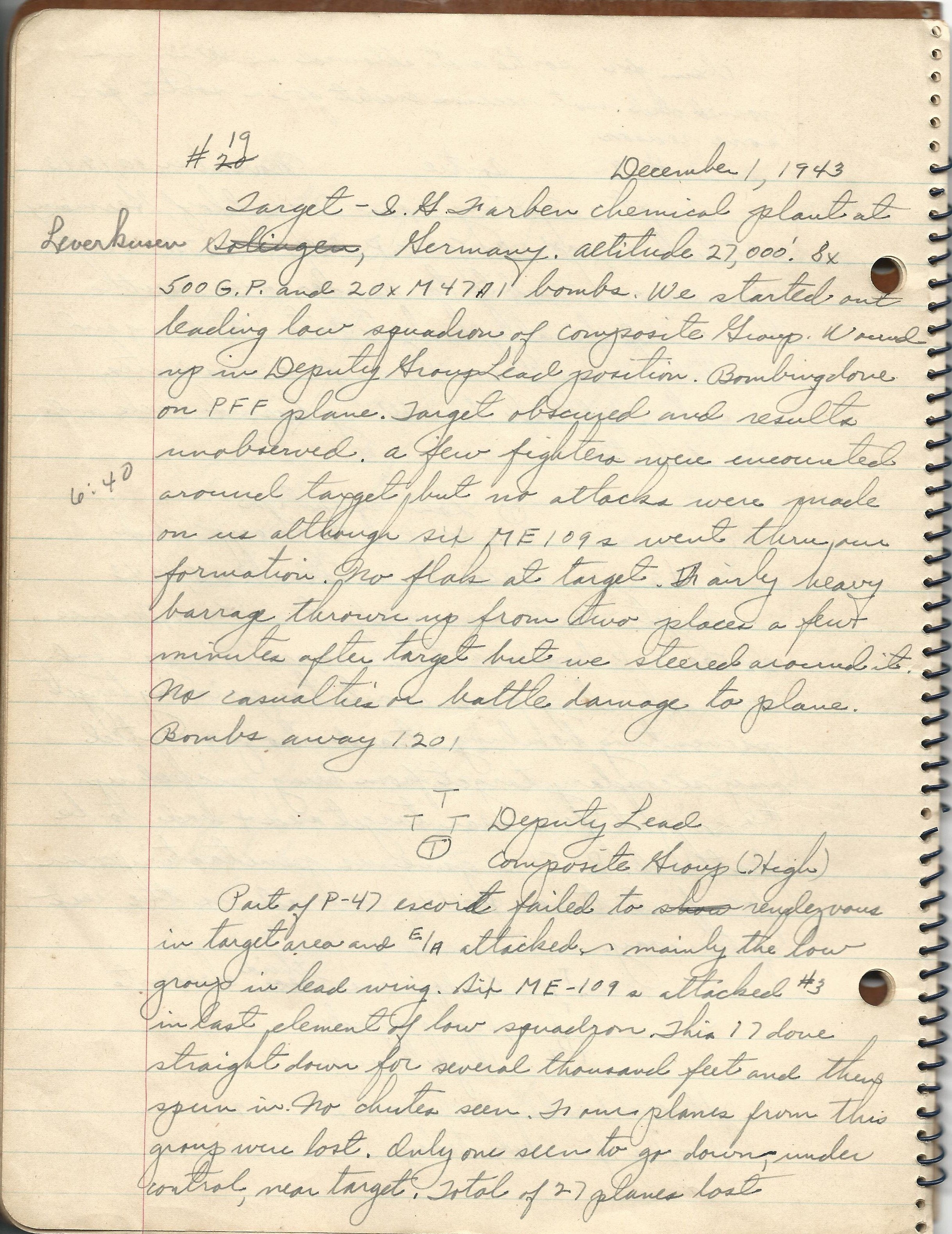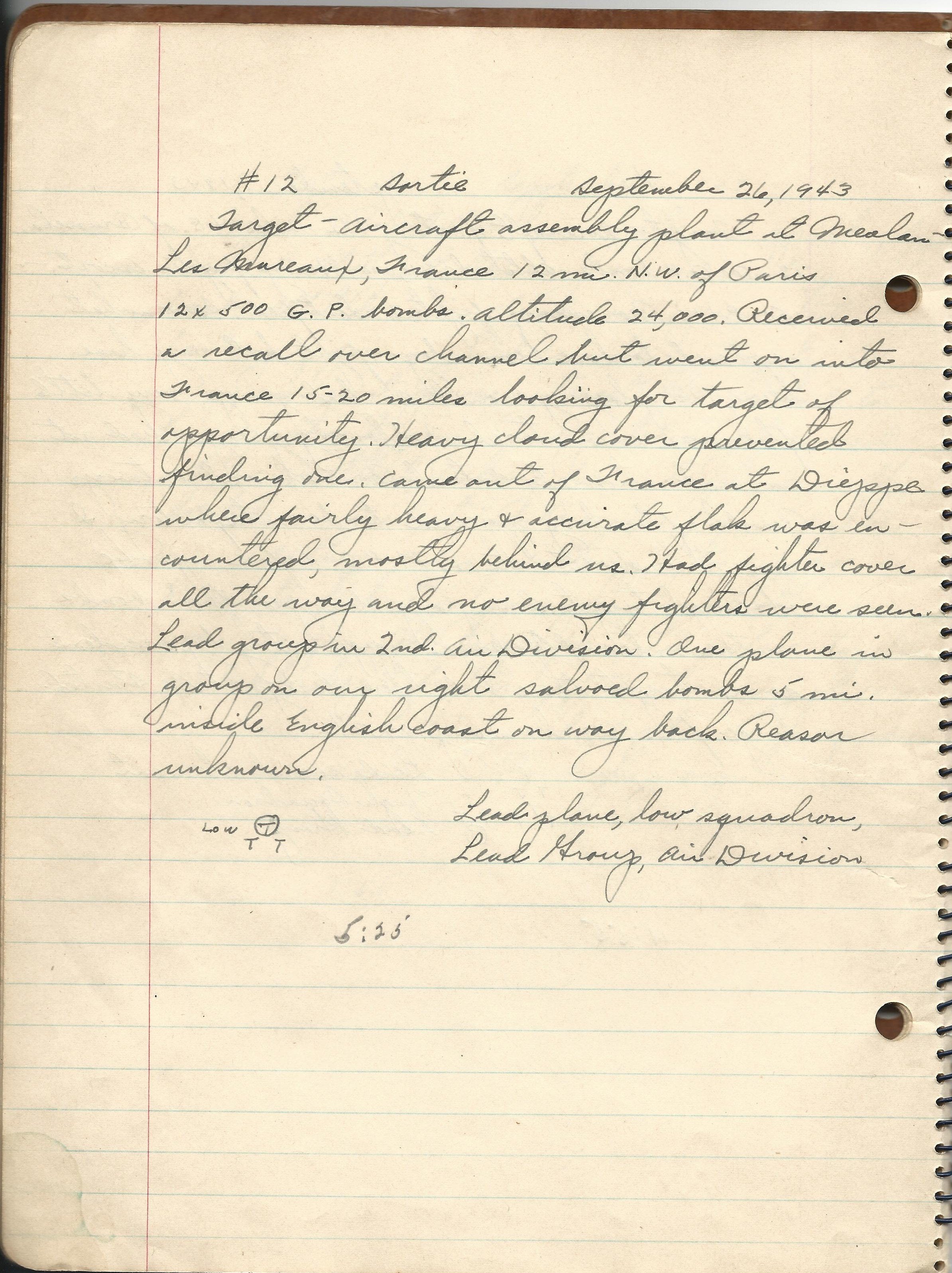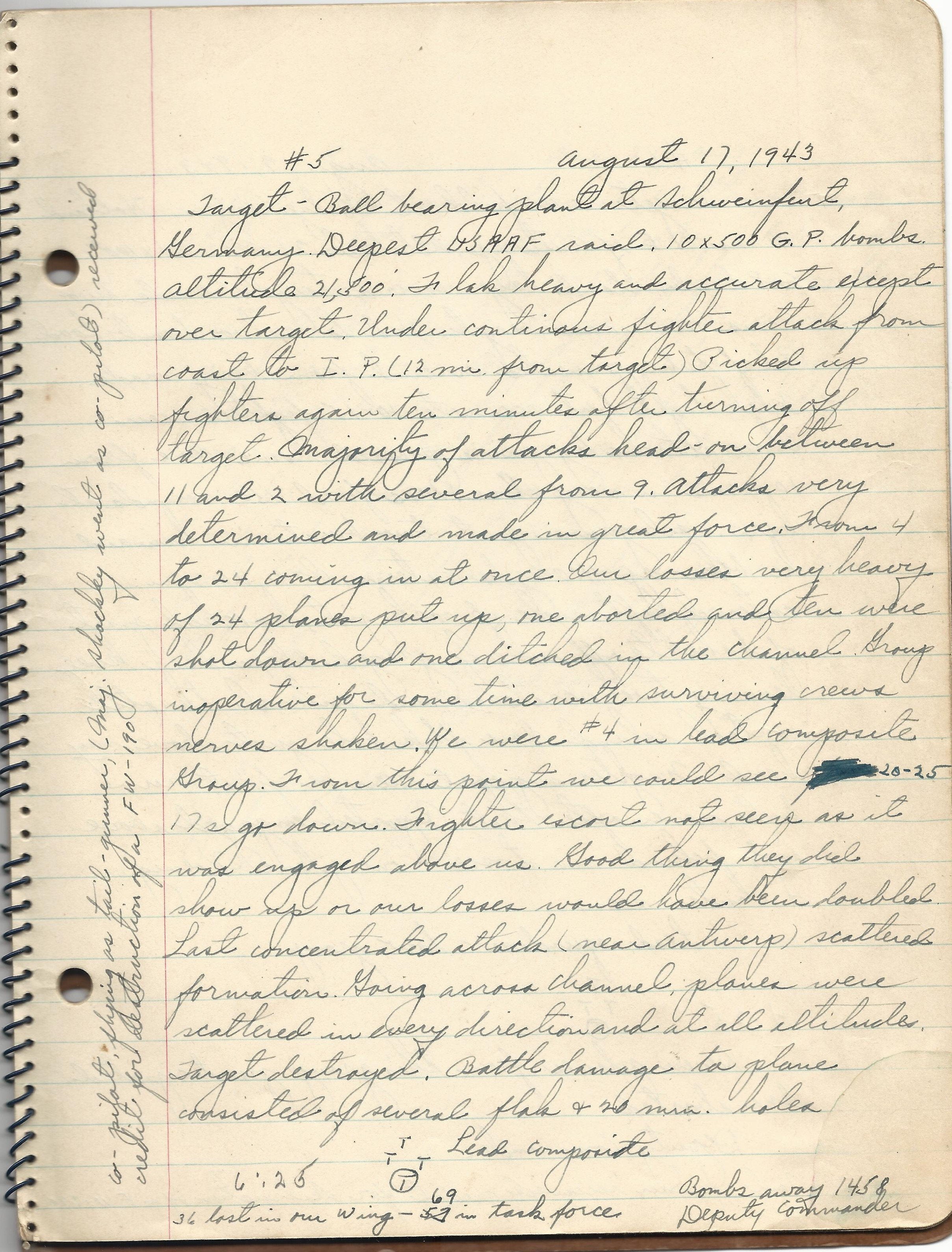 Mission #15 October 8,1943Target- Shipyards at Bremen, Germany. 12 x 500Gr bombs. Altitude 23,000'. Partial smoke screen over primary target. heavy flak encountered over target area. Fighters numerous but didn't press attacks home. Rockets used. All kinds of planes up. Formation scattered all over the sky. We led a six-ship formation back #2 knocked out over target. Alex wanted to jump but inter phone was out. He thought we were all alone but squadron was still behind us. 20mm hit me the back but flak suit deflected it. Big hole torn in flak suit; several holes in my leather jacket and one in my shirt. Oxygen system shot out in waist, right gunner and ball turret operator passed out for lack of oxygen. Left waist gunner revived right gunner, dug ball turret operator out and revived him. Navigator in hospital suffering from slight concussion to left eye caused when shell hit my back. P-47s carried us to IP and picked us up 20 min after leaving target. Bombs away 1507.There are 24 more entries all as detailed as this one. Incredible!
