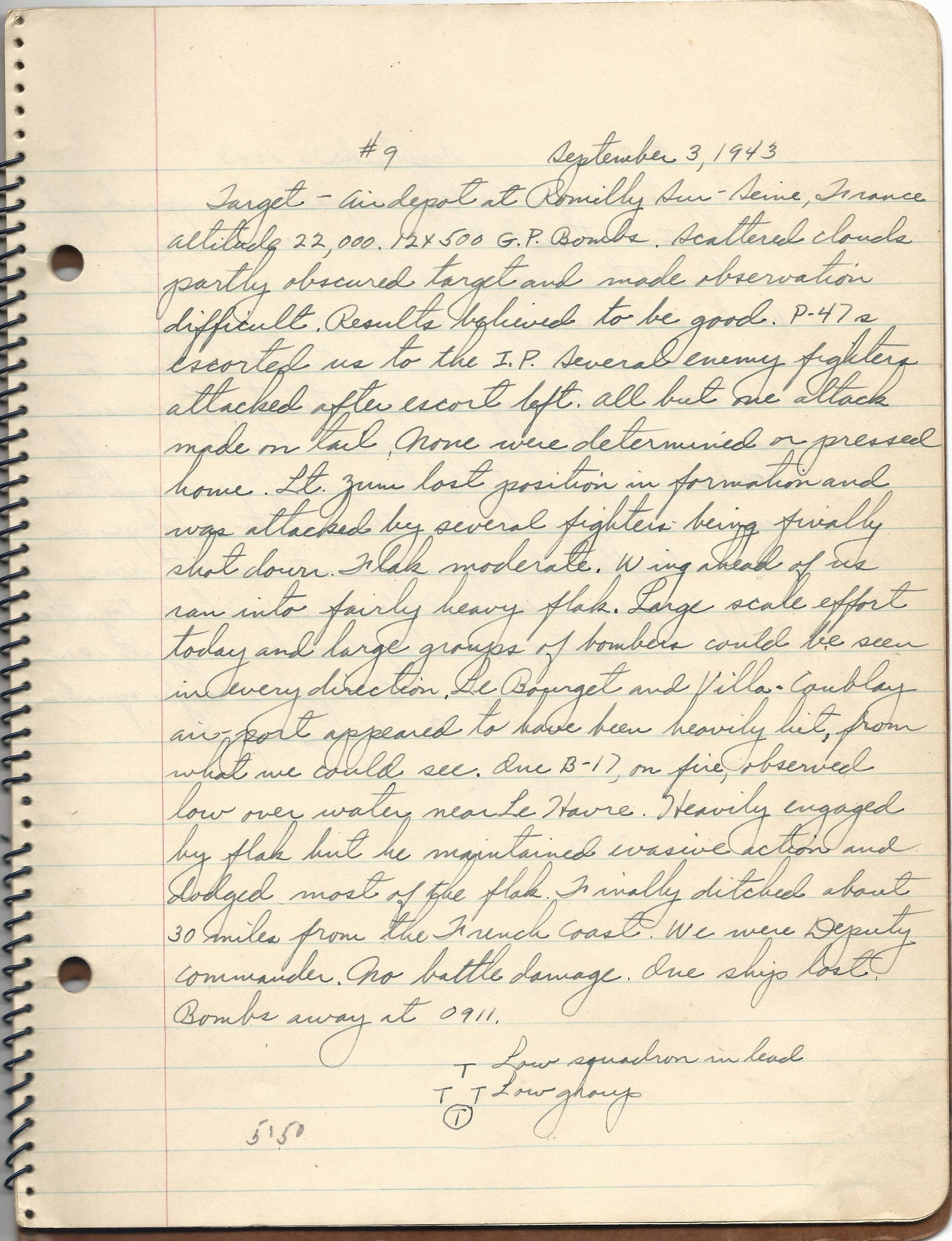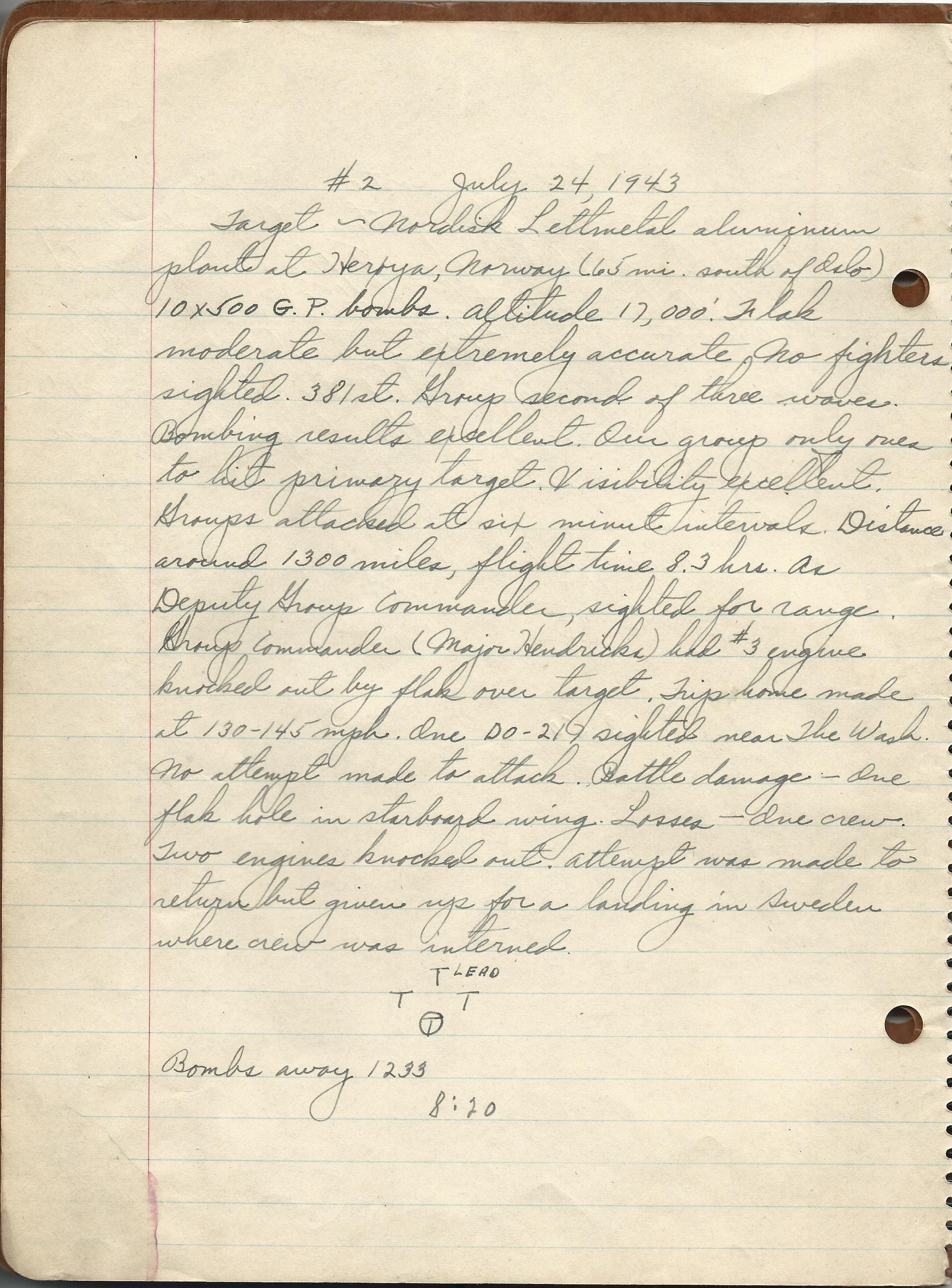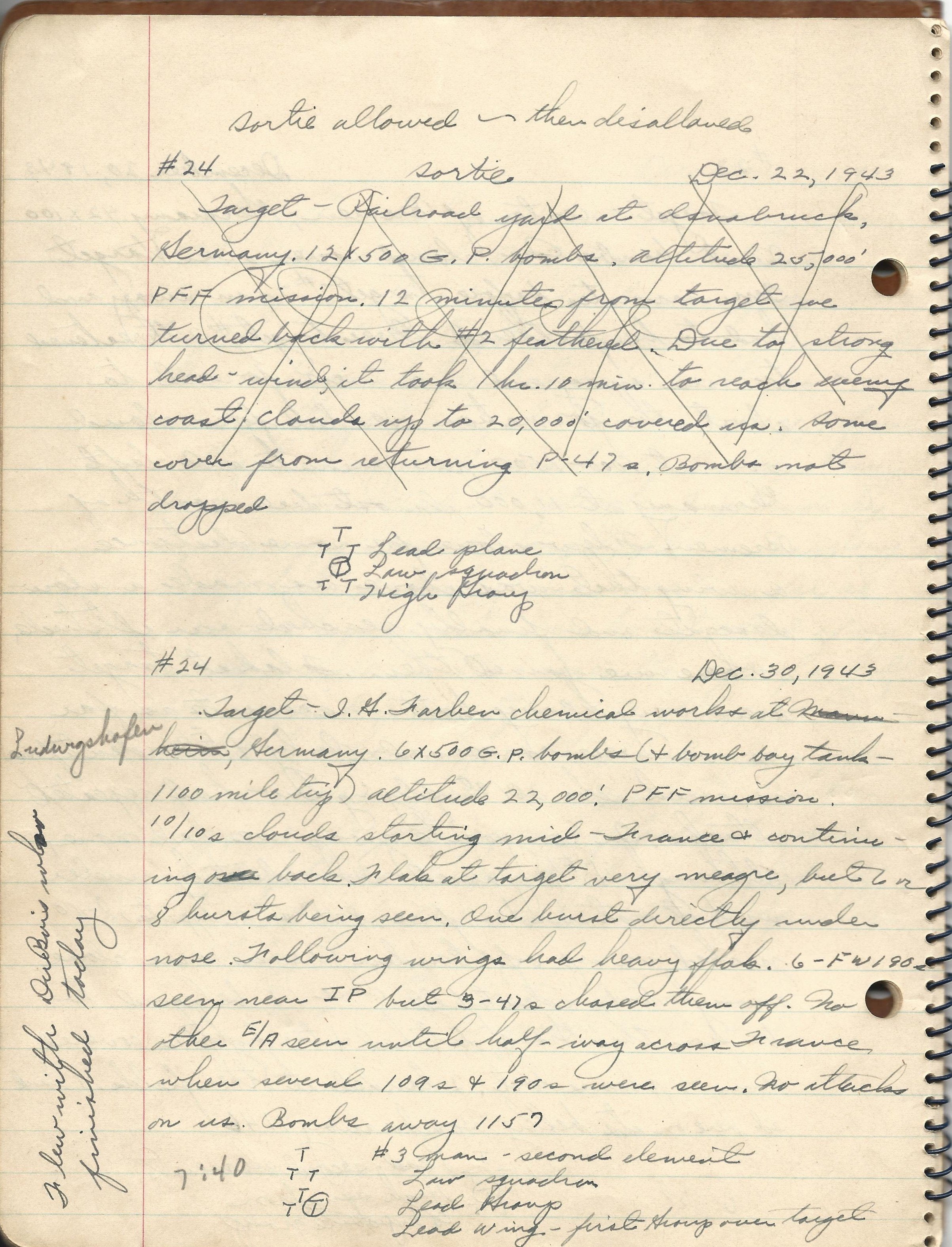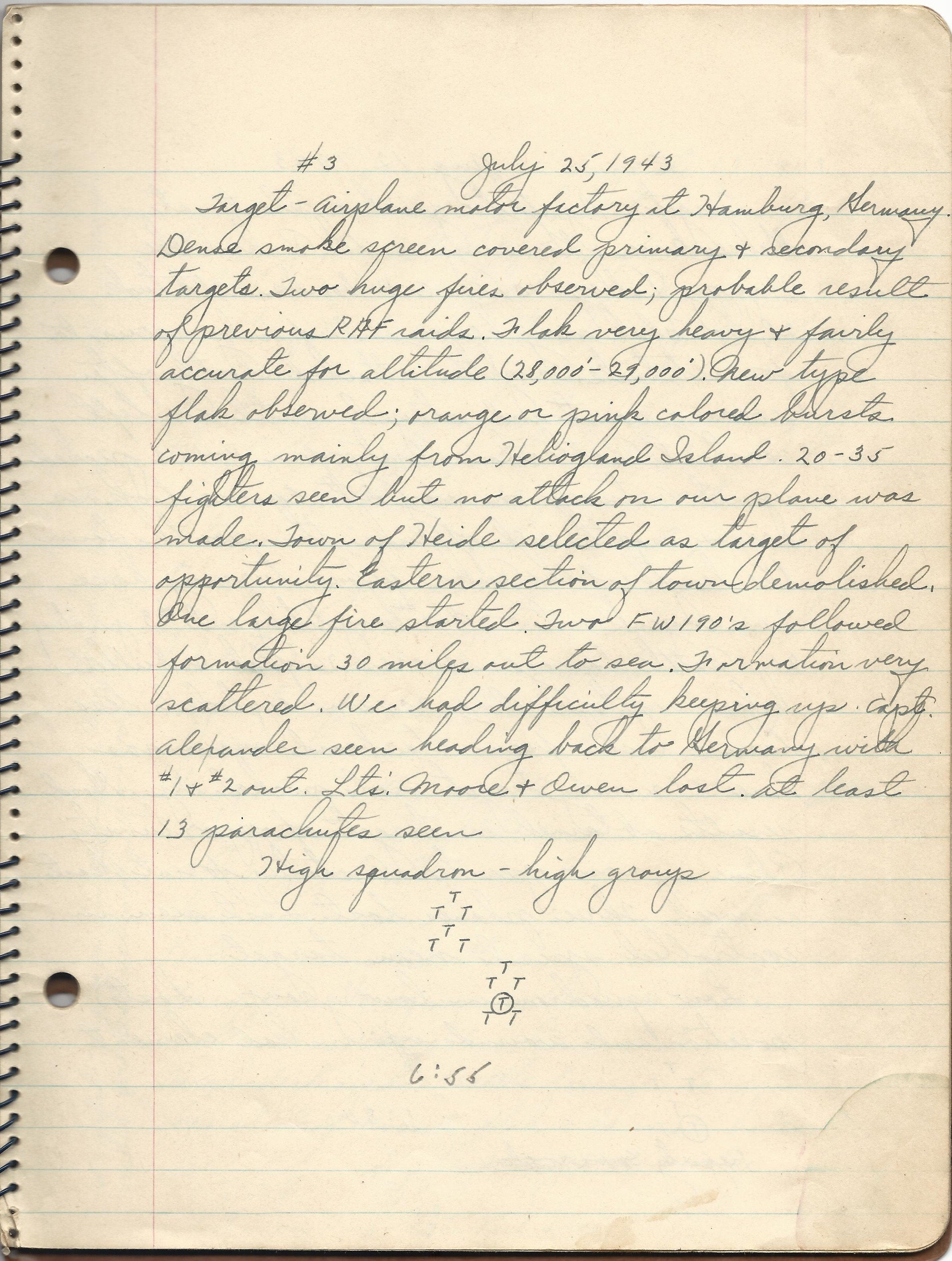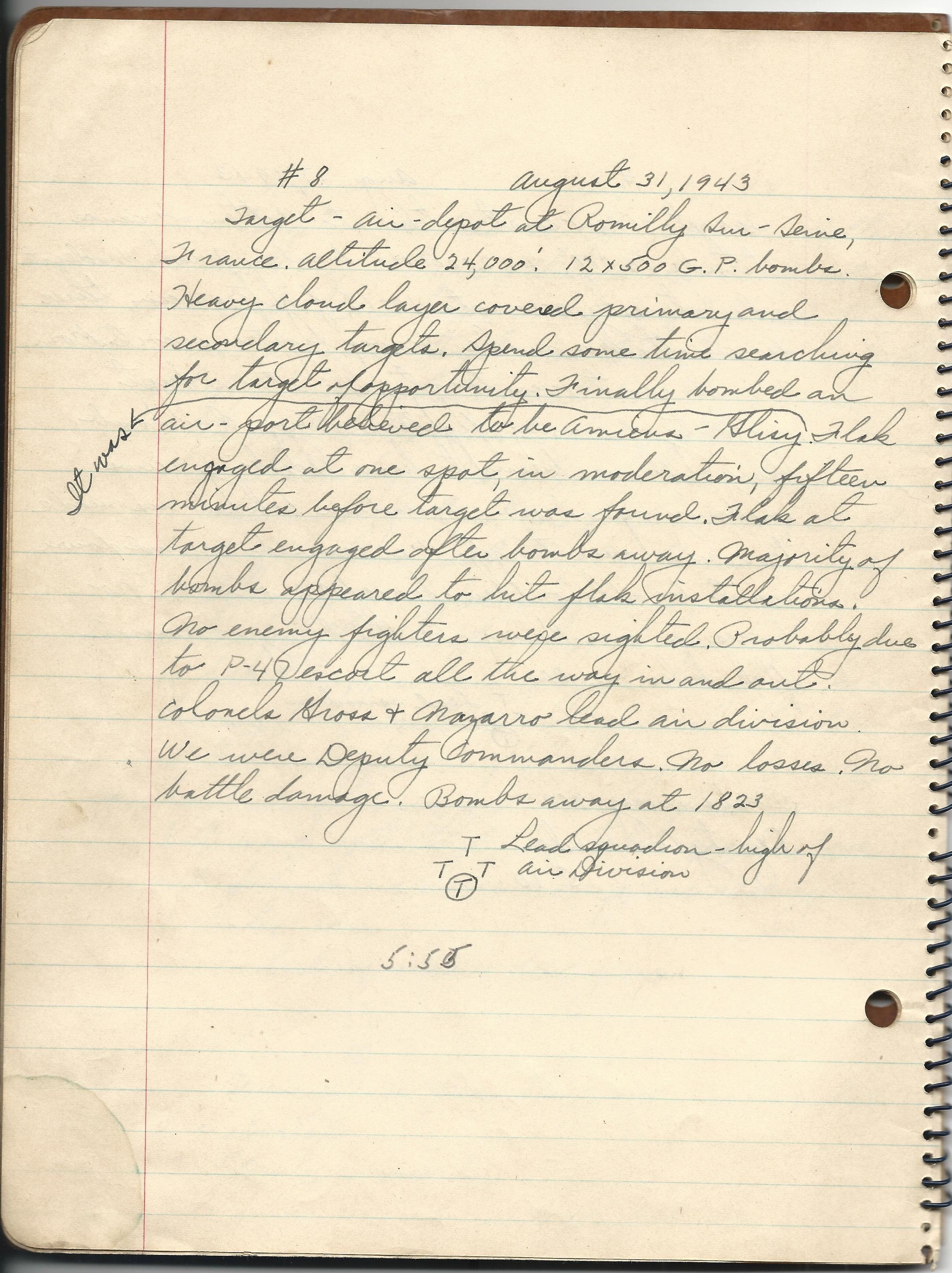 Mission #15 October 8,1943Target- Shipyards at Bremen, Germany. 12 x 500Gr bombs. Altitude 23,000'. Partial smoke screen over primary target. heavy flak encountered over target area. Fighters numerous but didn't press attacks home. Rockets used. All kinds of planes up. Formation scattered all over the sky. We led a six-ship formation back #2 knocked out over target. Alex wanted to jump but inter phone was out. He thought we were all alone but squadron was still behind us. 20mm hit me the back but flak suit deflected it. Big hole torn in flak suit; several holes in my leather jacket and one in my shirt. Oxygen system shot out in waist, right gunner and ball turret operator passed out for lack of oxygen. Left waist gunner revived right gunner, dug ball turret operator out and revived him. Navigator in hospital suffering from slight concussion to left eye caused when shell hit my back. P-47s carried us to IP and picked us up 20 min after leaving target. Bombs away 1507.There are 24 more entries all as detailed as this one. Incredible!