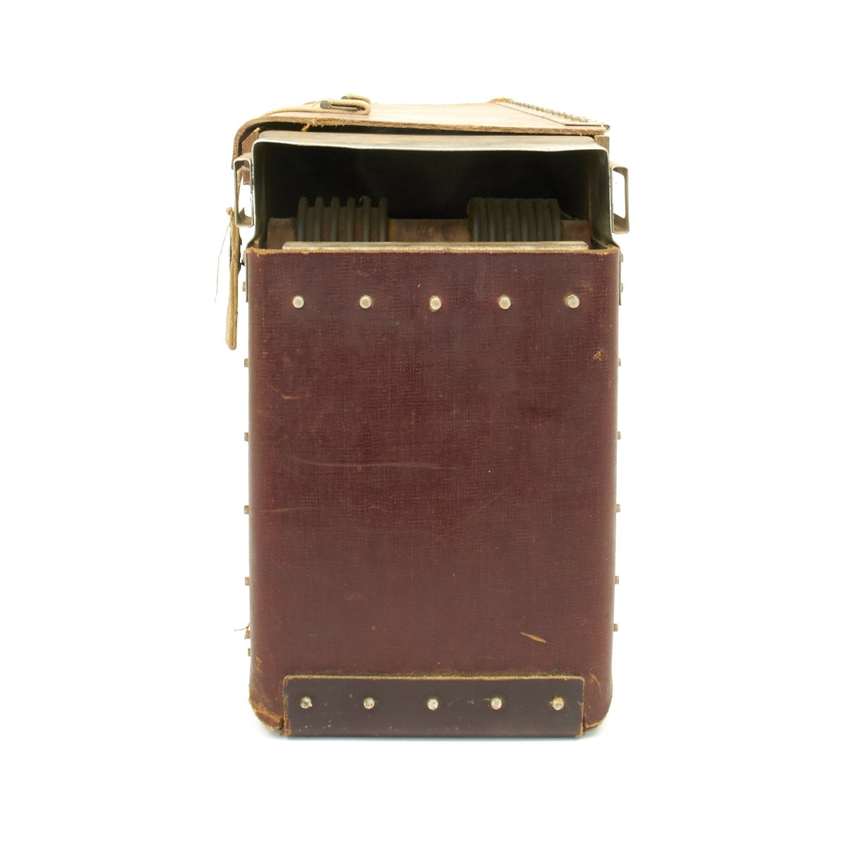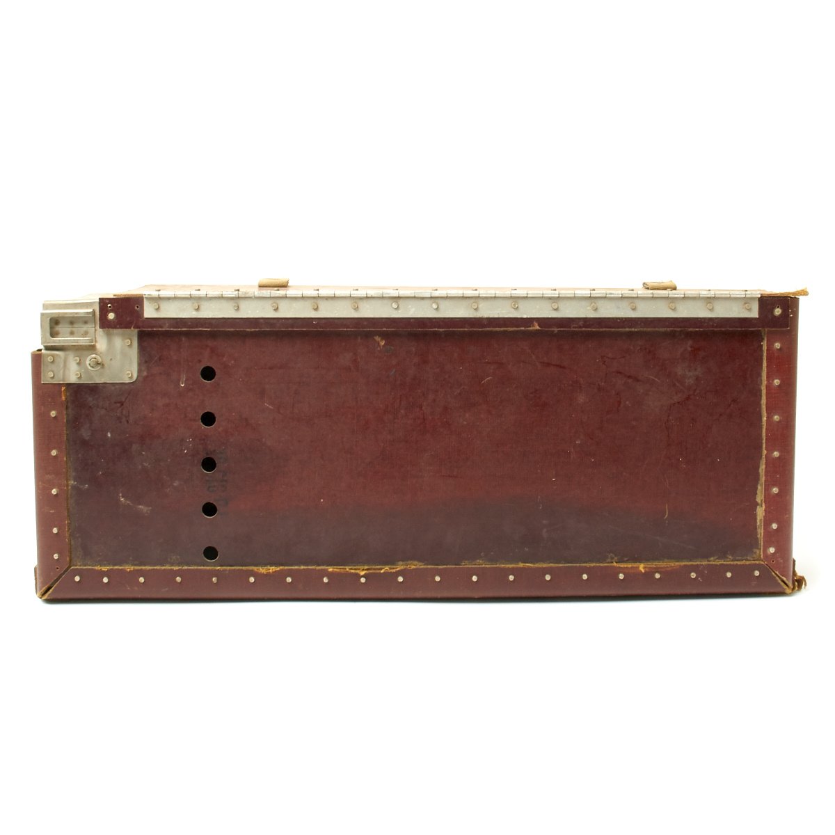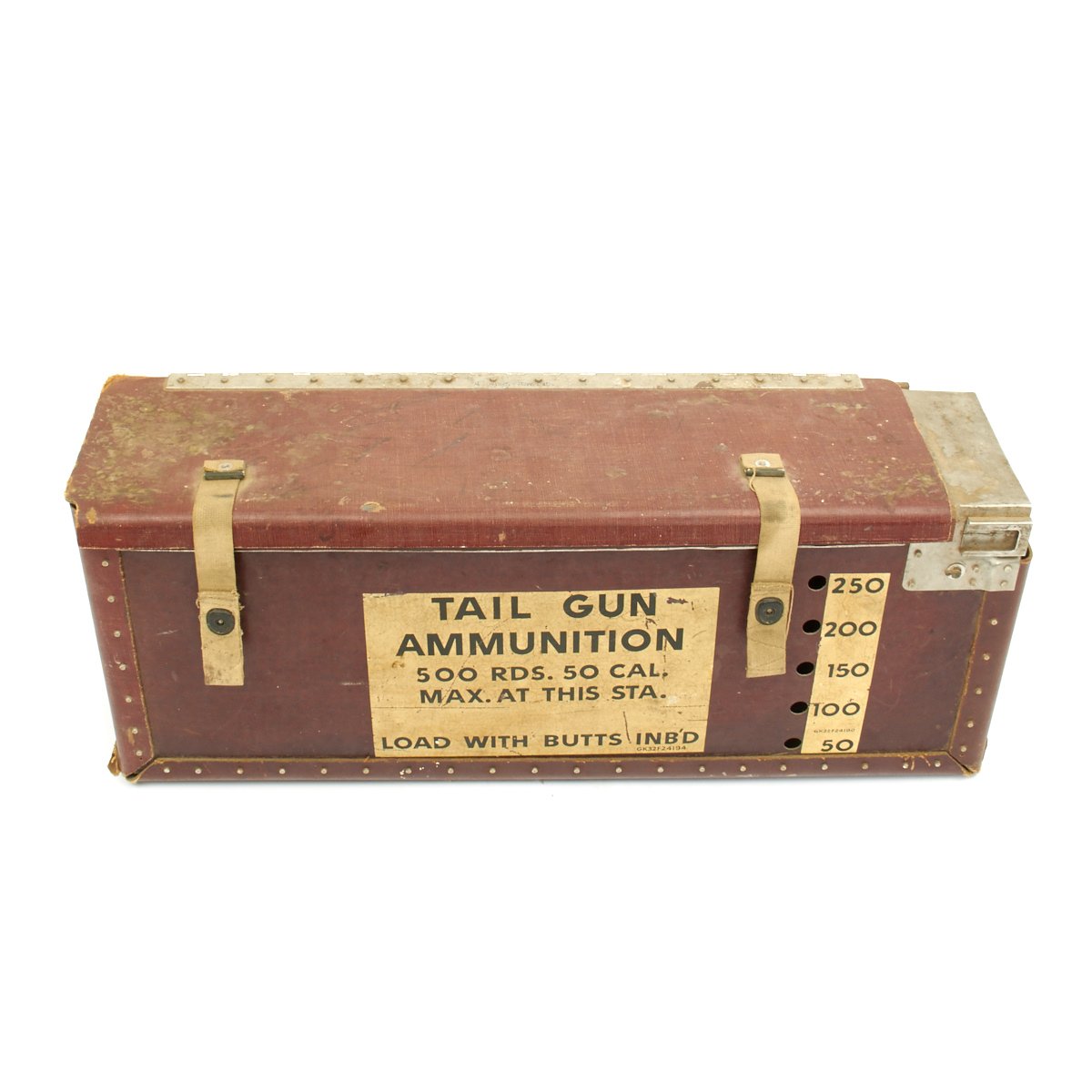 Original Item: Only One Available. WWII B-17 Flying Fortress Tail gun ammunition box, handles a capacity of 500 rounds of 50 caliber Browning machine gun ammunition. Made of sturdy but aircraft friendly lightweight fiberboard and manufactured by the Standard Tire Company of Cedar Rapids, Iowa. Features quick release lift-the-dot closures and a rubber covered internal belt roller. Offered in excellent condition inside and out. Measures 25 x 7 x 10 inches.