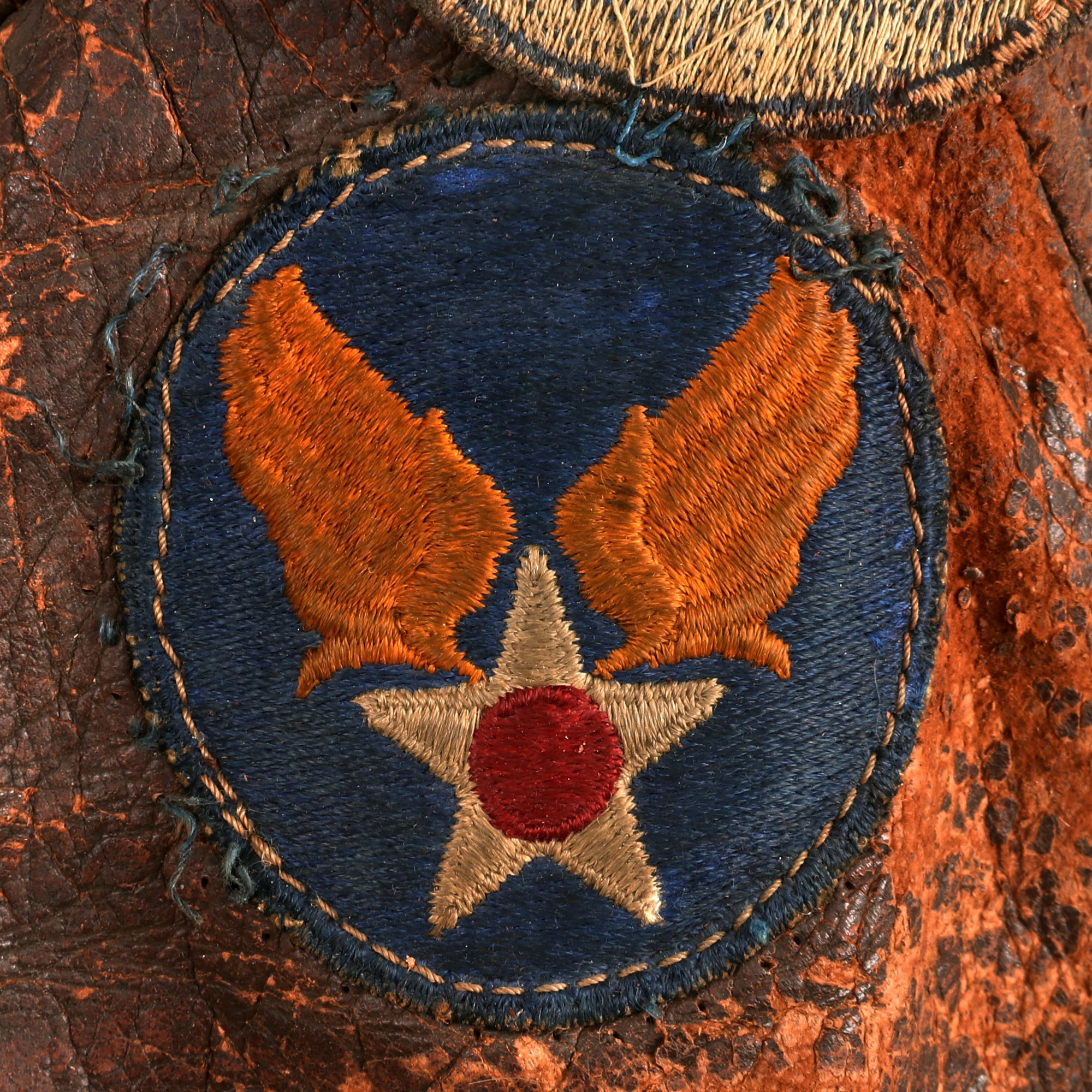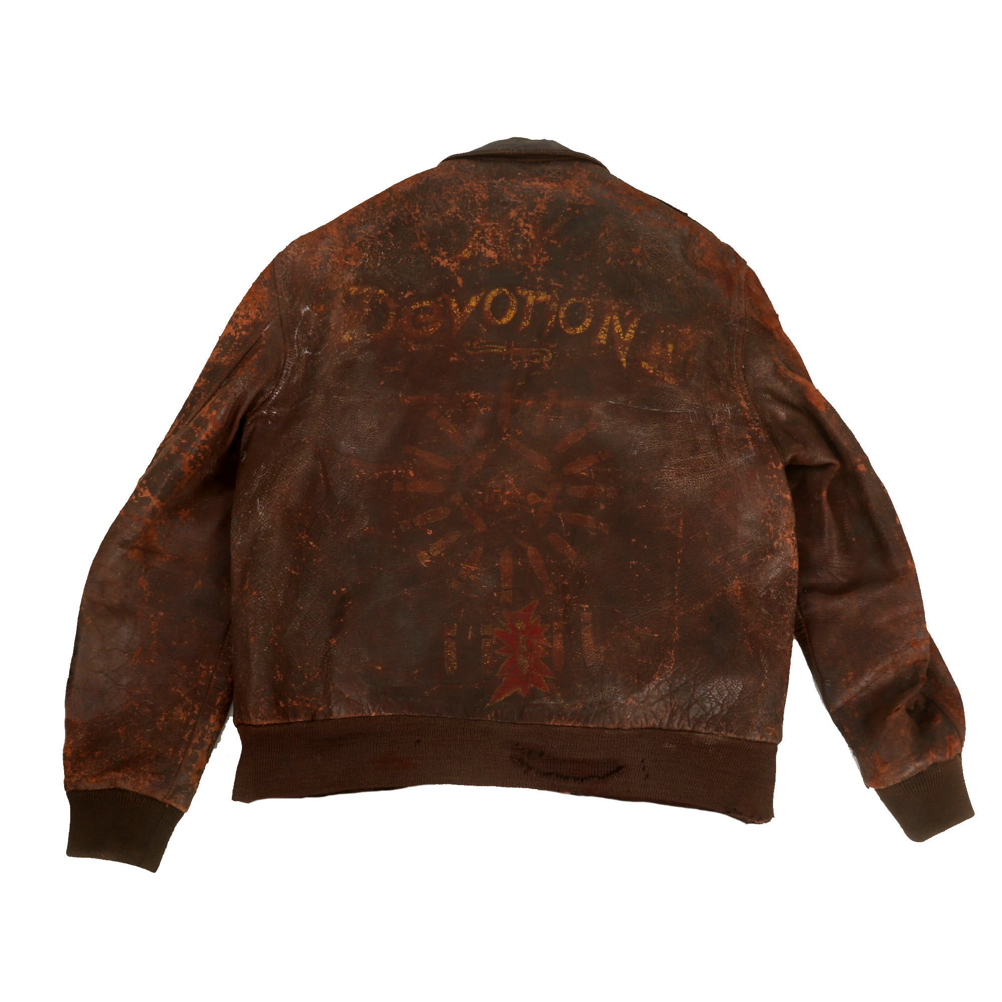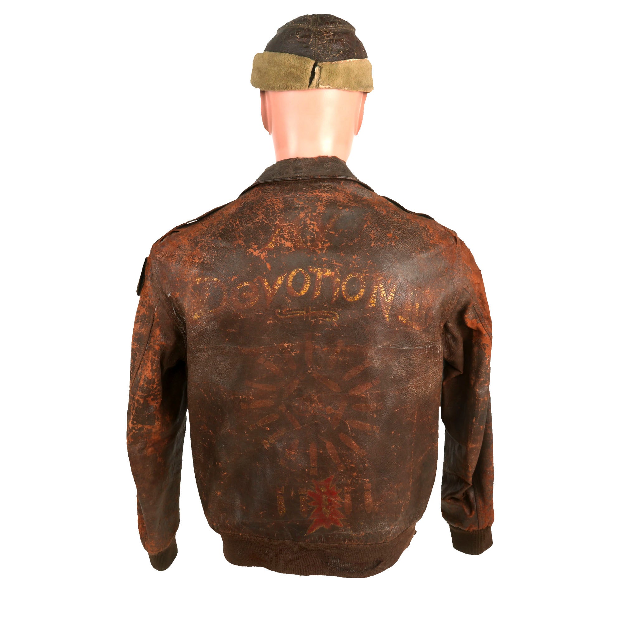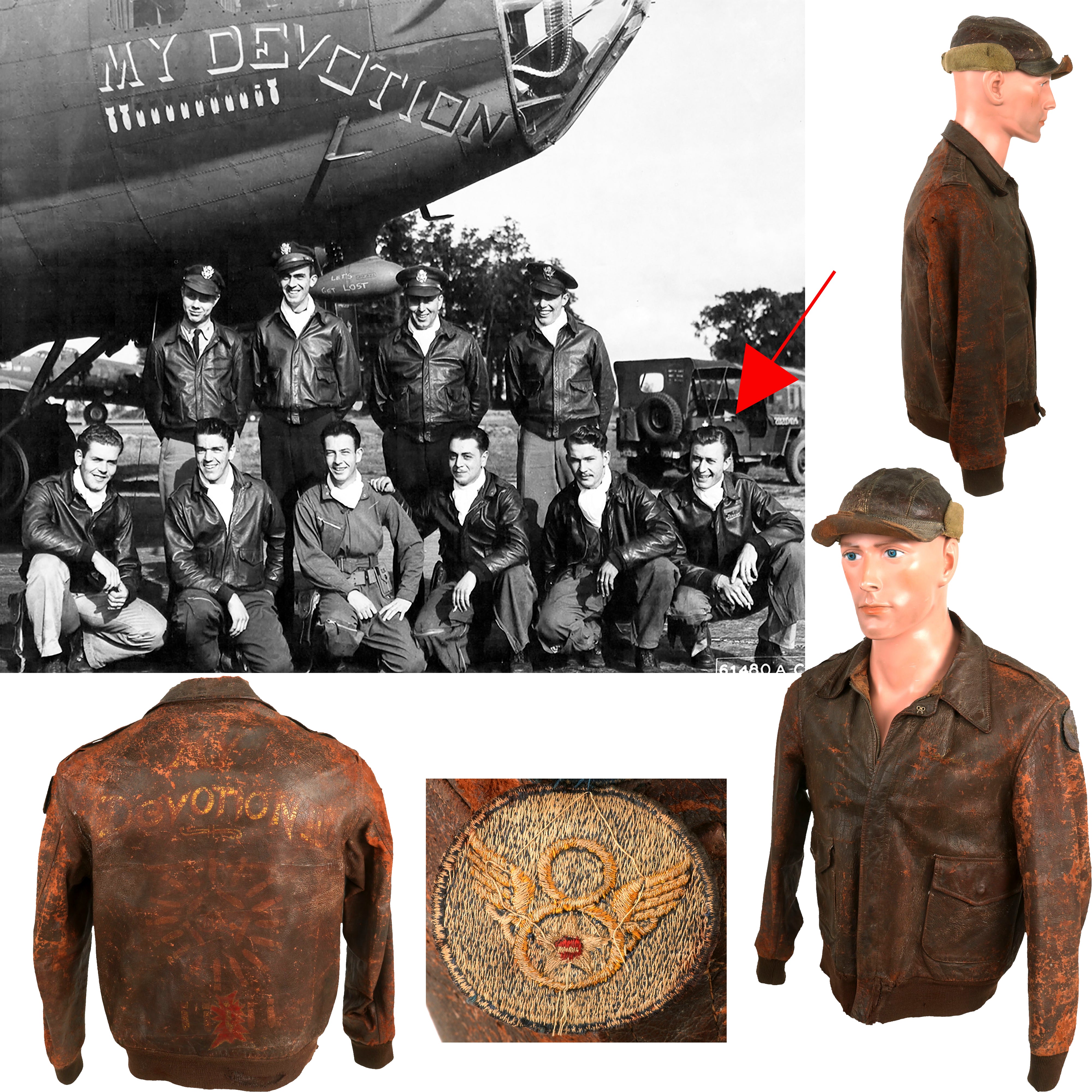- Original WWII A-2 Flying Jacket manufactured by Spiewak & Sons with hand painted artwork on the back. One the reverse is MY DEVOTION with clusters of bombs. The left shoulder bears very early 8th AF insigna that is litterally hanging by a thread over thee Army Air Forces insignia. The jacket is size is not legibale on the data tag but is approximately a size 38 or 40 with original data label (hard to read), original cuffs, original waist band and functional Crown zipper. In the nape of the neck written in ink is RL ALLMAN "SNAKE" 7063. The front right chest below where the name tape would be in cursive yellow paint faintly reads "Snake". After close inspection of the crew photos it appears Allman is in the first row viewer's far right as soldier wearing that jacket also has a script name in the same location. The jacket is in overall fair condition, with the leather flaking in multiple areas.