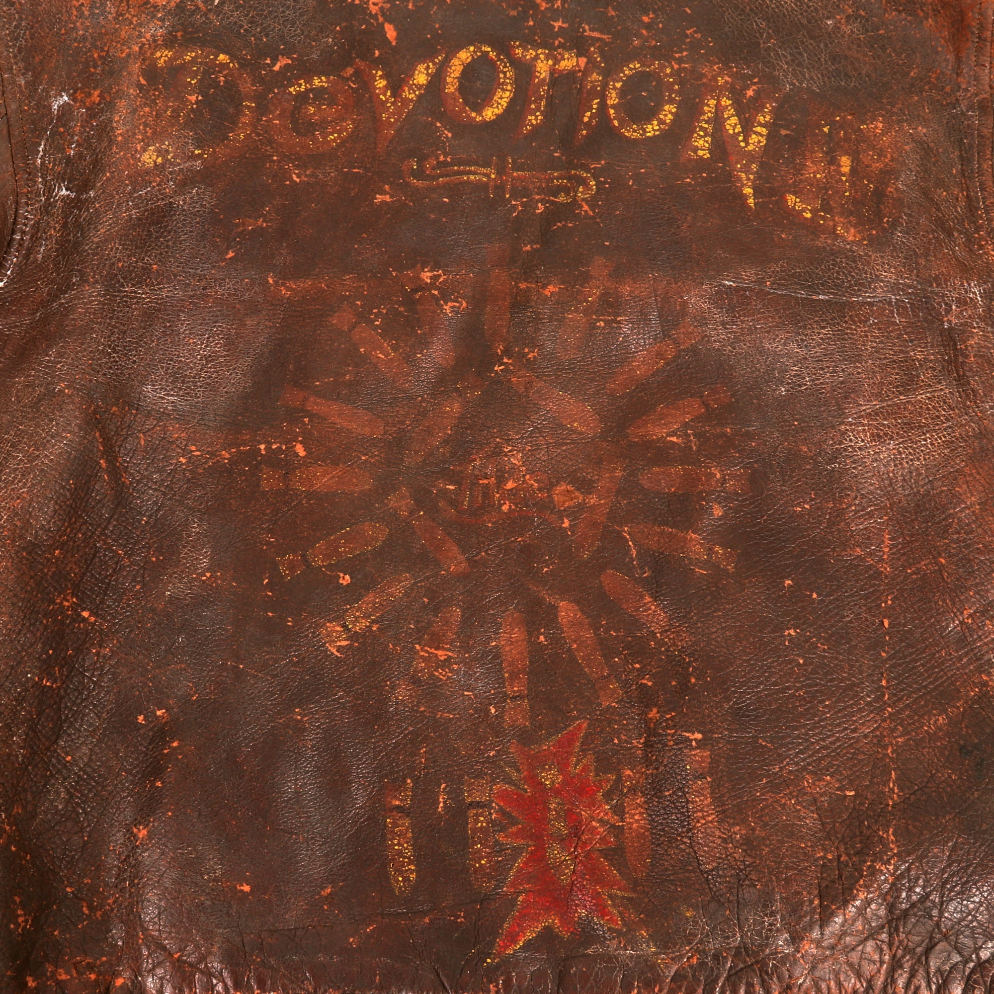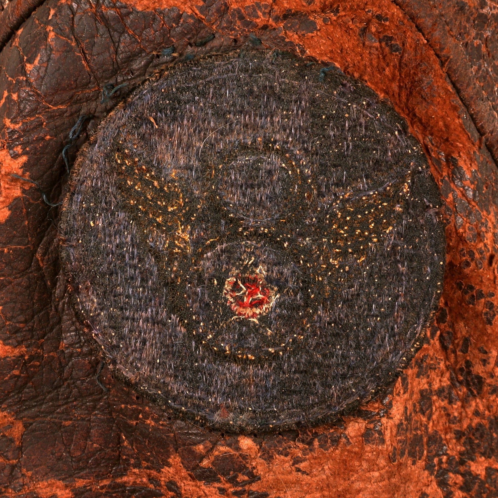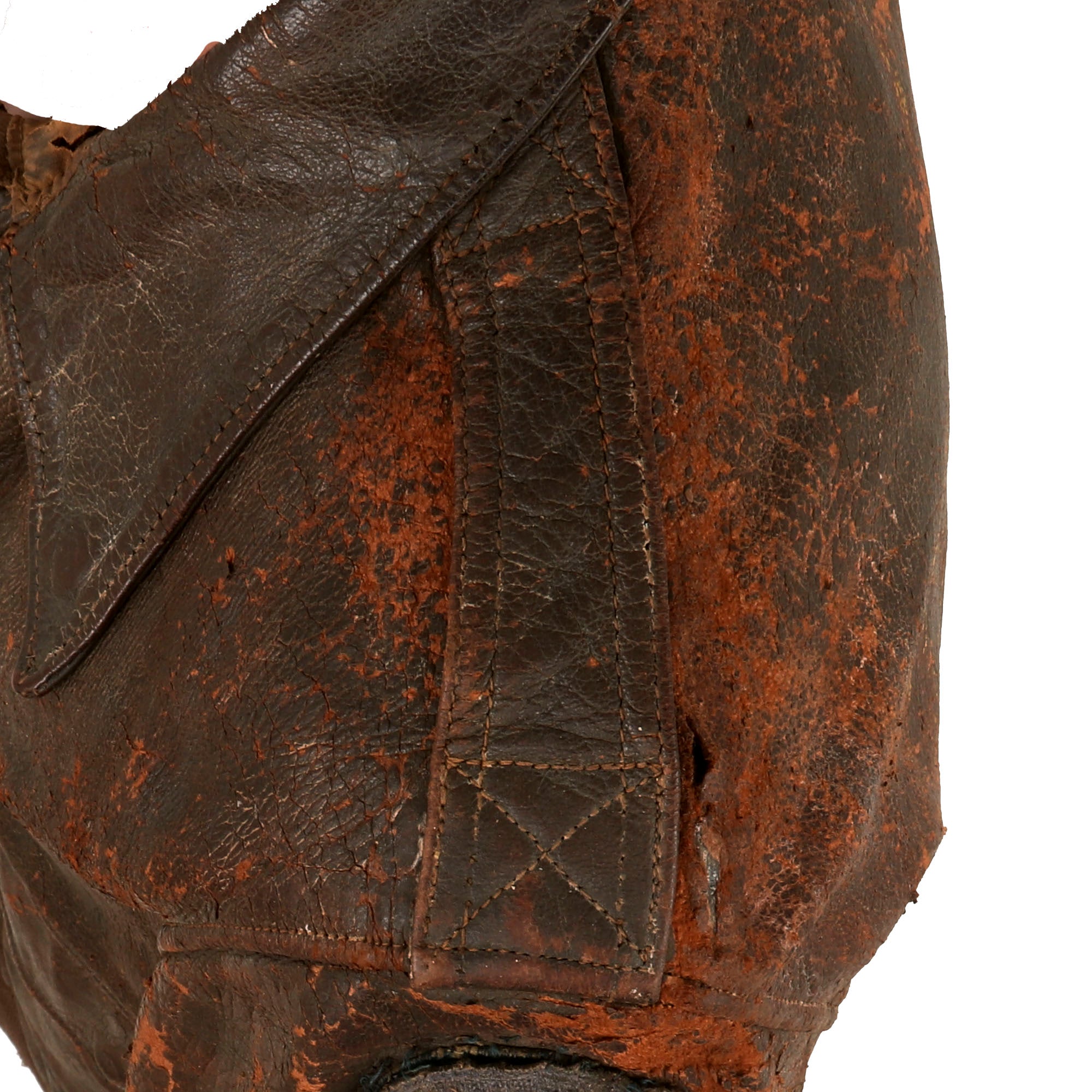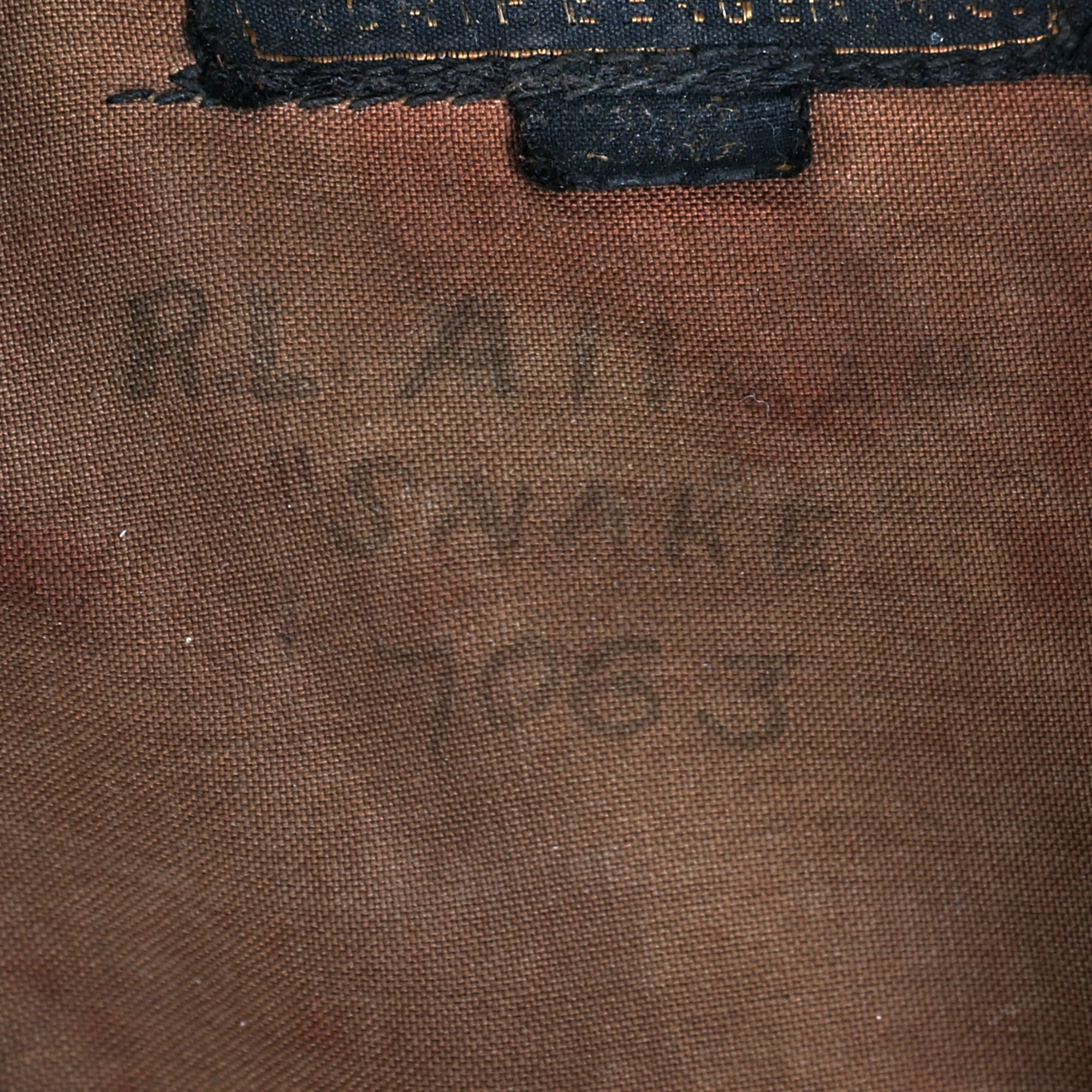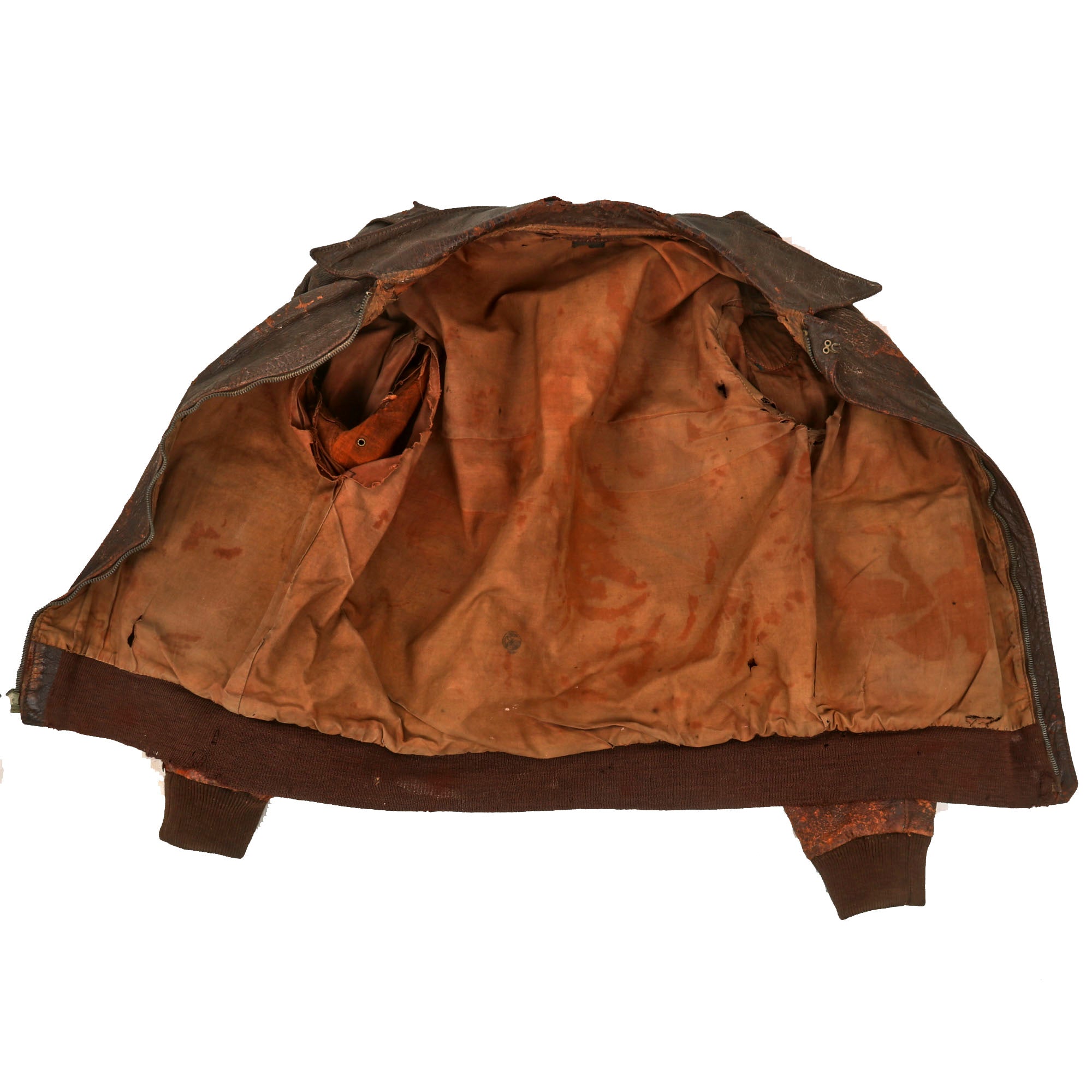 - Original WWII A-2 Flying Jacket manufactured by Spiewak & Sons with hand painted artwork on the back. One the reverse is MY DEVOTION with clusters of bombs. The left shoulder bears very early 8th AF insigna that is litterally hanging by a thread over thee Army Air Forces insignia. The jacket is size is not legibale on the data tag but is approximately a size 38 or 40 with original data label (hard to read), original cuffs, original waist band and functional Crown zipper. In the nape of the neck written in ink is RL ALLMAN "SNAKE" 7063. The front right chest below where the name tape would be in cursive yellow paint faintly reads "Snake". After close inspection of the crew photos it appears Allman is in the first row viewer's far right as soldier wearing that jacket also has a script name in the same location. The jacket is in overall fair condition, with the leather flaking in multiple areas.