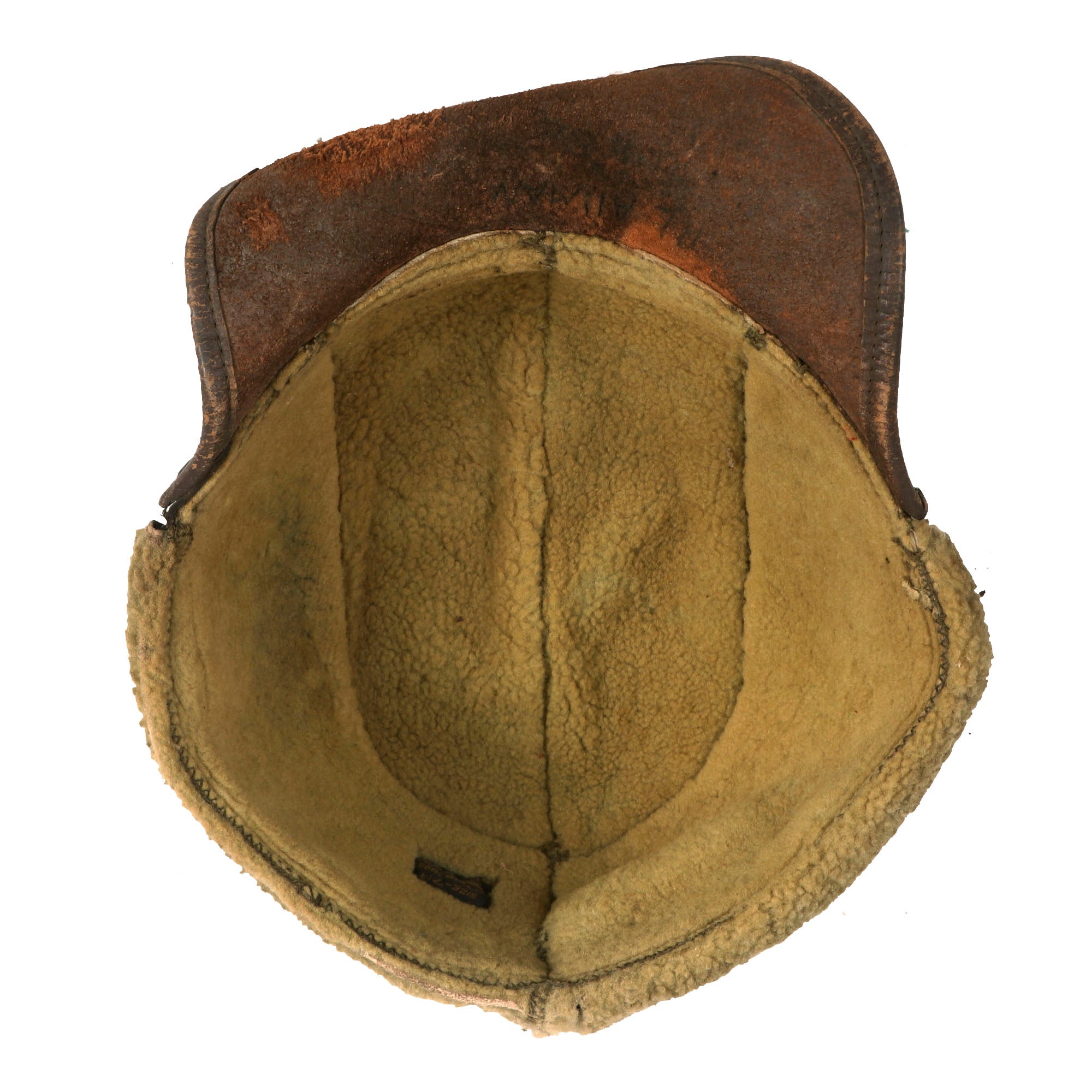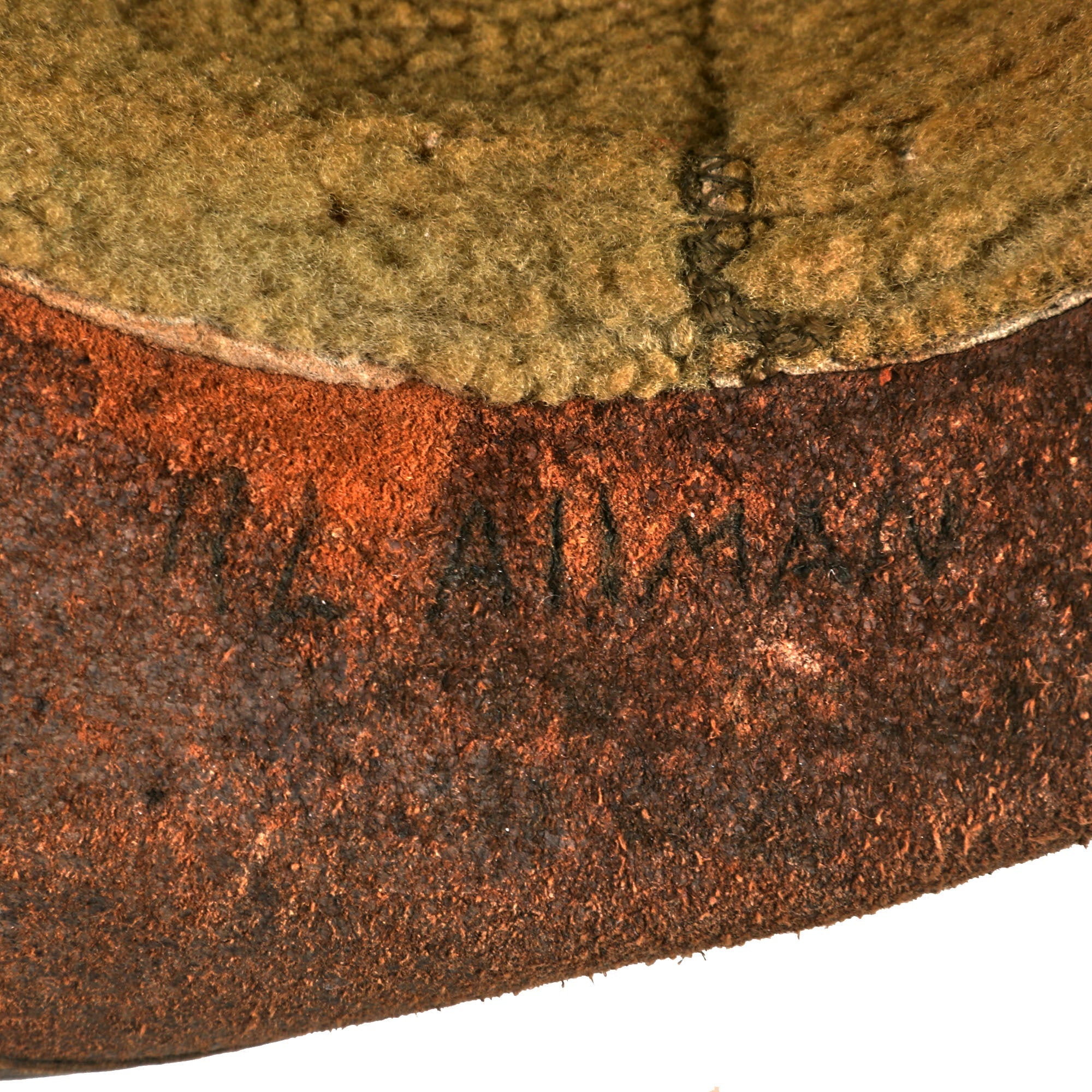- Original U.S. WWII Army Air Forces B-2 Gunner & Air Crew Shearling Leather Billed Cap with the name RL ALLMAN written in ink under the visor. The bill has been curled up and looks fantastic. Data tag is still present and it is a size 7 1/4.