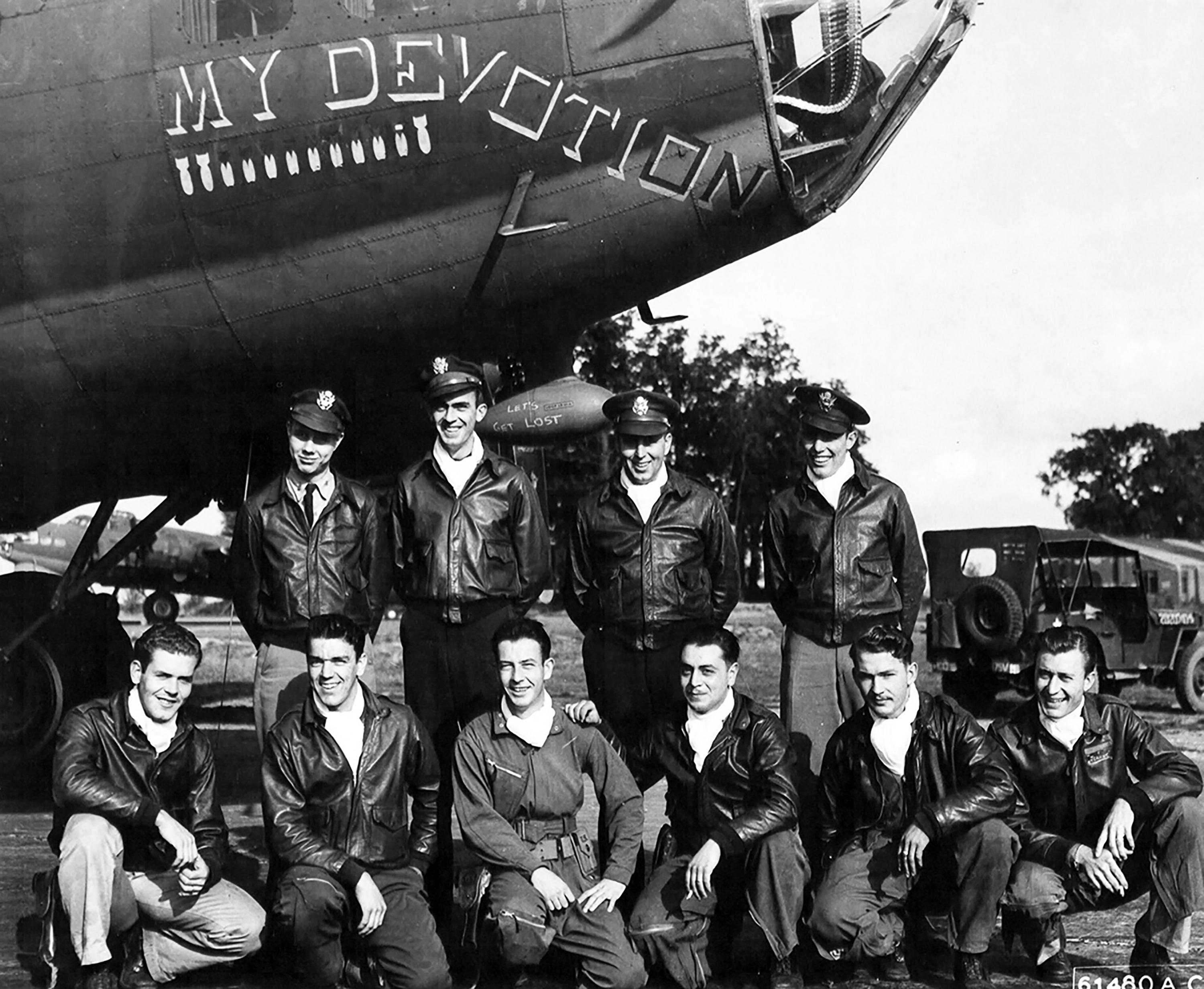 Delivered Cheyenne 11/8/43; Gr Isle 31/8/43; Assigned: 563BS/388BG Knettishall 6/9/43; battle damage Gelsenkirchen 5/11/43 Pilot: Bob Bohne, Co-Pilot: Major Bill Chamberlain, Navigator: Harry Belgium. er, Bombardier: Bill Bangum, Engineer / Top Turret Gunner: Bill Hannigan, Radio Operator: Lowell Southam, Ball Turret Gunner: Jim Auther, Waist Gunner: Bob Allman, Waist Gunner: Salvatore Cavallaro, Tail Gunner: Maurice Carlson (10RTD-all bailed over Suffolk); flak KO’d two engines, on return crashed College Farm, Elmham St Cross, Suffolk, UK; Salvaged. MY DEVOTION.