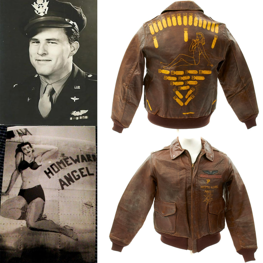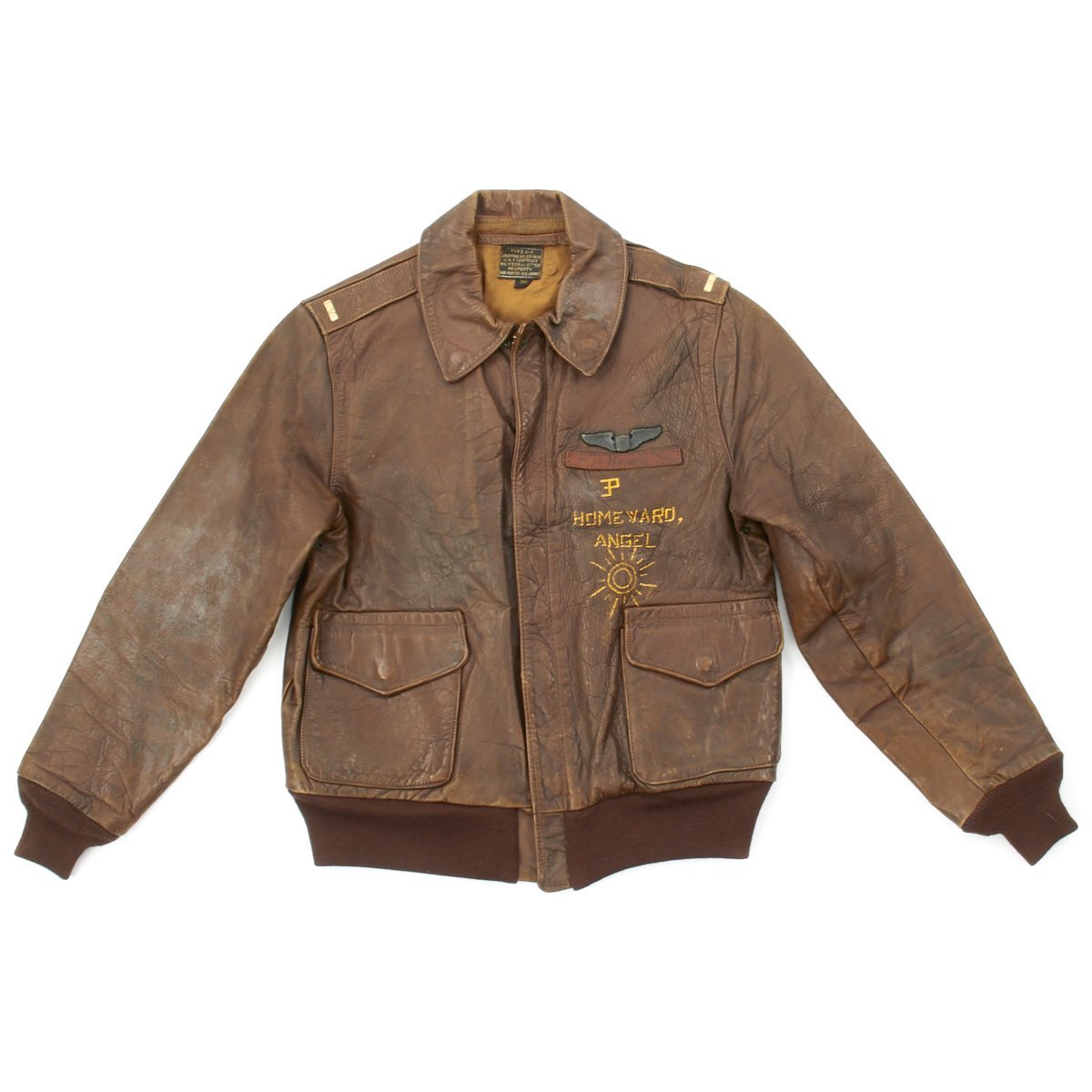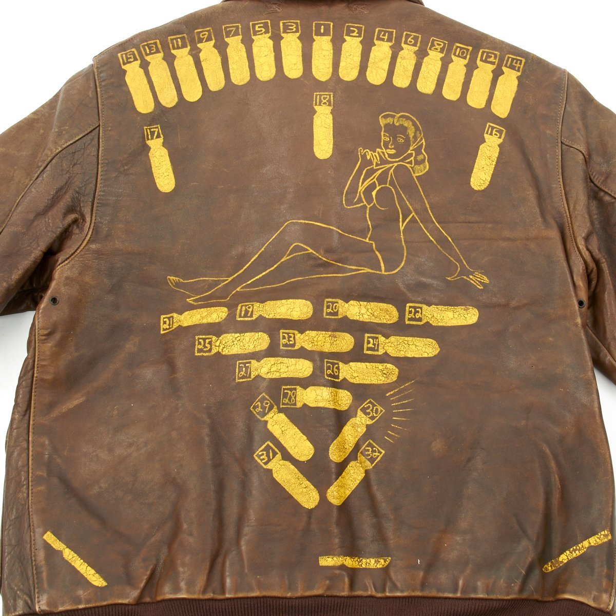 This is an incredible hand painted and named type A-2 brown leather flying jacket that belonged to Lt. Henrie. The jacket features two front flap pockets and lapels with internal brass snap buttons and a functional front zipper by Conmar. Original USAAF data label still intact showing size 38. The left front chest bears a leather name tag and serial number that reads M.W. HENRIE 0-587194 beneath a tarnished set of silver U.S. pilot's wings badge and above a hand painted yellow P / HOMEWARD ANGEL with a sun design. Epaulets feature painted white lieutenant bars. The reverses of the jacket is painted with a yellow line picture of a Alberto Vargas-style seated pinup girl surrounded by yellow bombs representing missions flown - numbered from 1 to 32. Yellow paint was the most prevalent color to appear on flight jackets, followed by white, as paint in both colors was readily available on most airbase runways. the jacket leather is in fine supple condition. Knit waist band and cuffs appear to be period correct modern replacements.