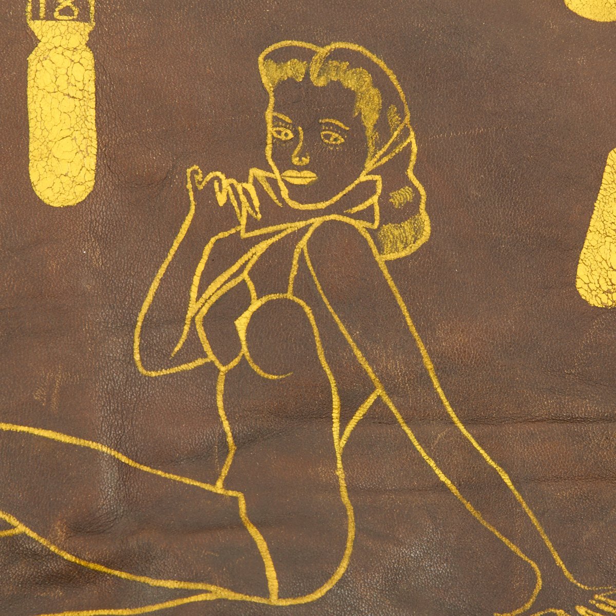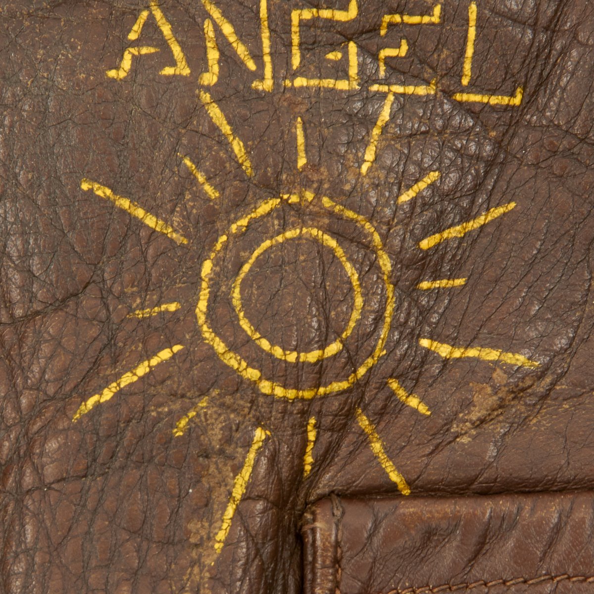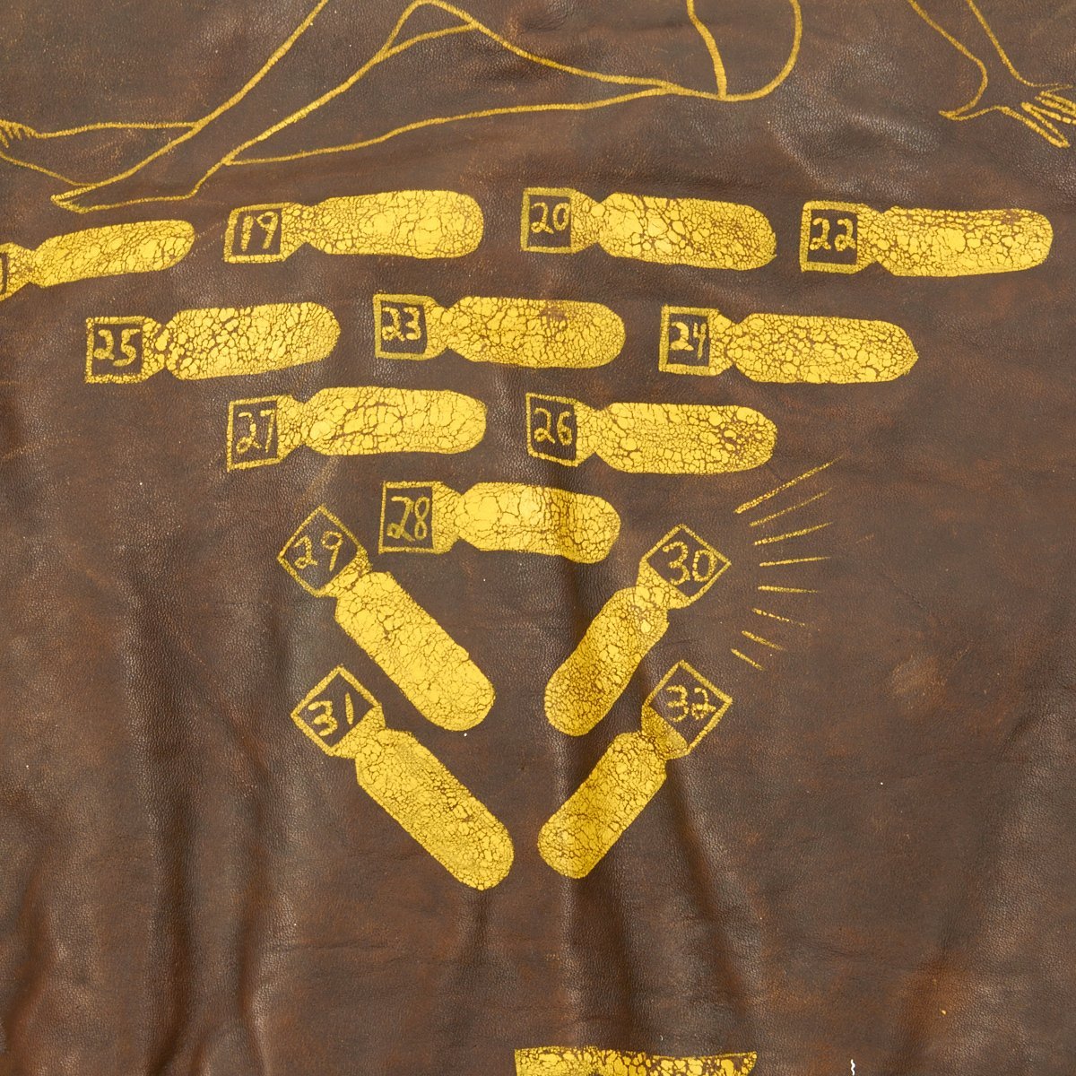 This is an incredible hand painted and named type A-2 brown leather flying jacket that belonged to Lt. Henrie. The jacket features two front flap pockets and lapels with internal brass snap buttons and a functional front zipper by Conmar. Original USAAF data label still intact showing size 38. The left front chest bears a leather name tag and serial number that reads M.W. HENRIE 0-587194 beneath a tarnished set of silver U.S. pilot's wings badge and above a hand painted yellow P / HOMEWARD ANGEL with a sun design. Epaulets feature painted white lieutenant bars. The reverses of the jacket is painted with a yellow line picture of a Alberto Vargas-style seated pinup girl surrounded by yellow bombs representing missions flown - numbered from 1 to 32. Yellow paint was the most prevalent color to appear on flight jackets, followed by white, as paint in both colors was readily available on most airbase runways. the jacket leather is in fine supple condition. Knit waist band and cuffs appear to be period correct modern replacements.