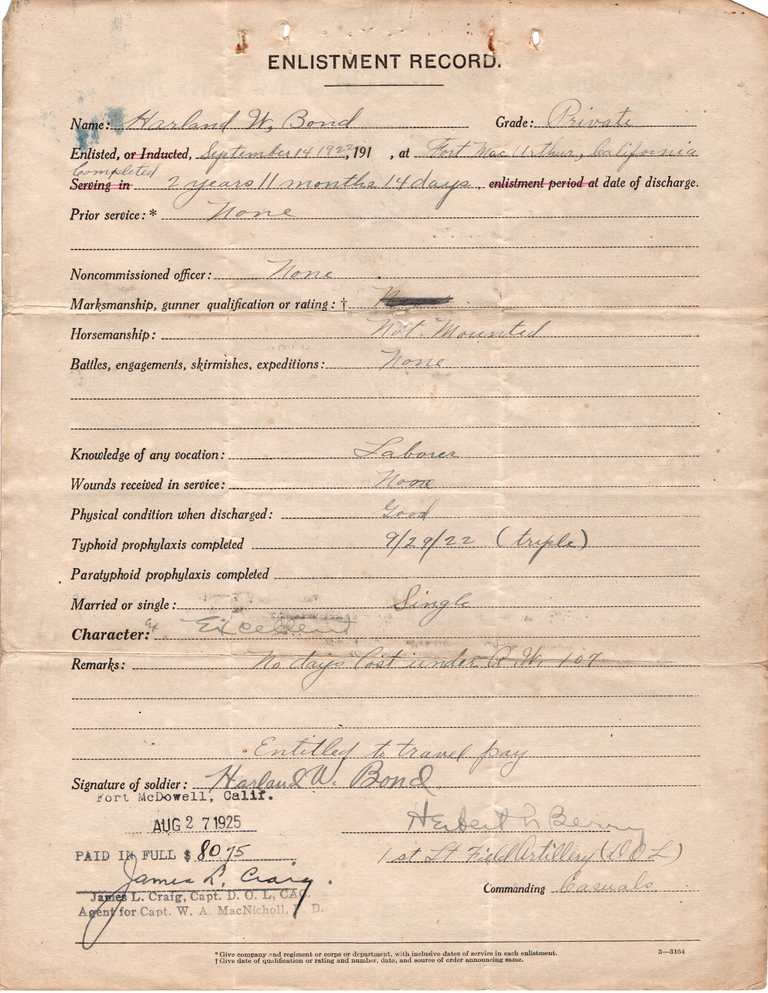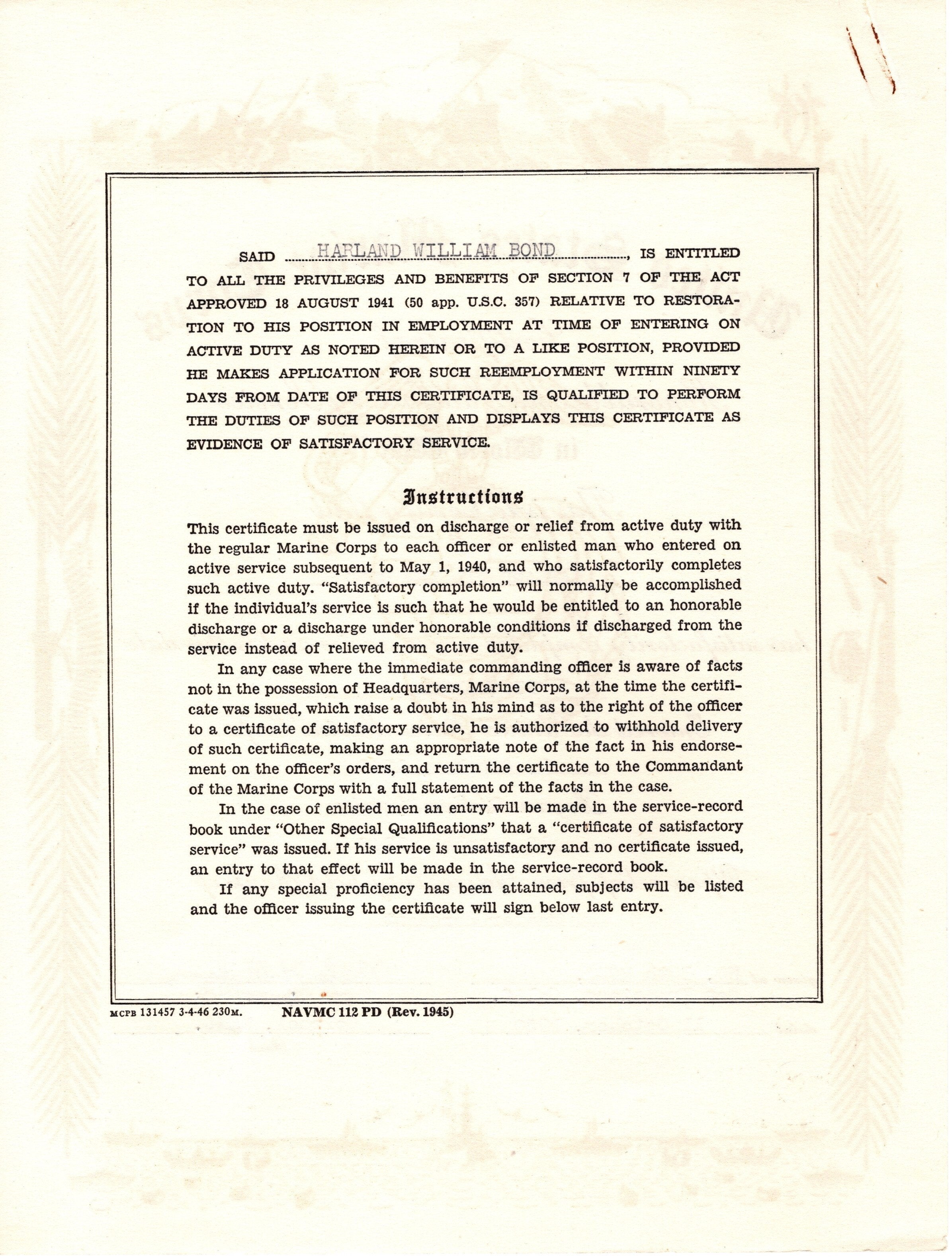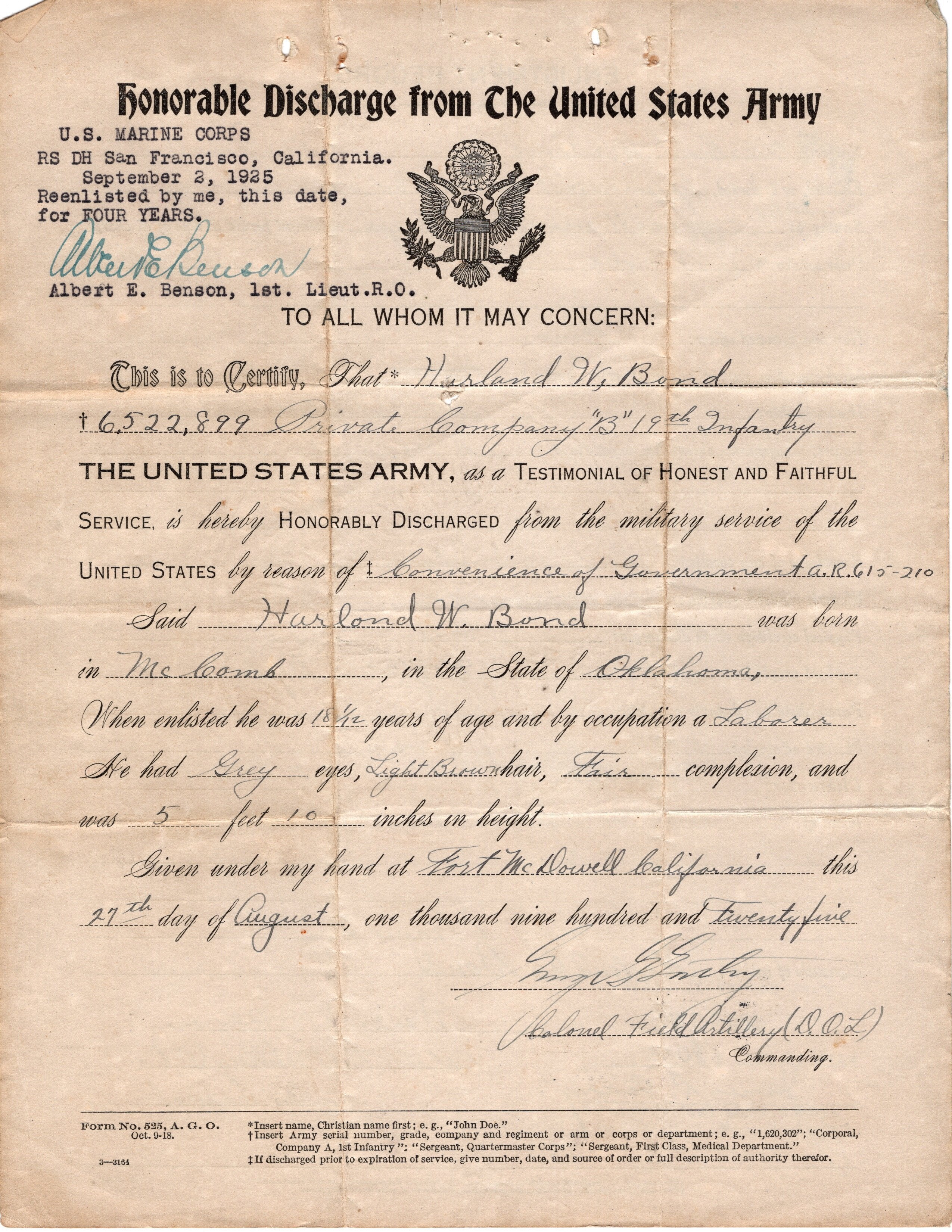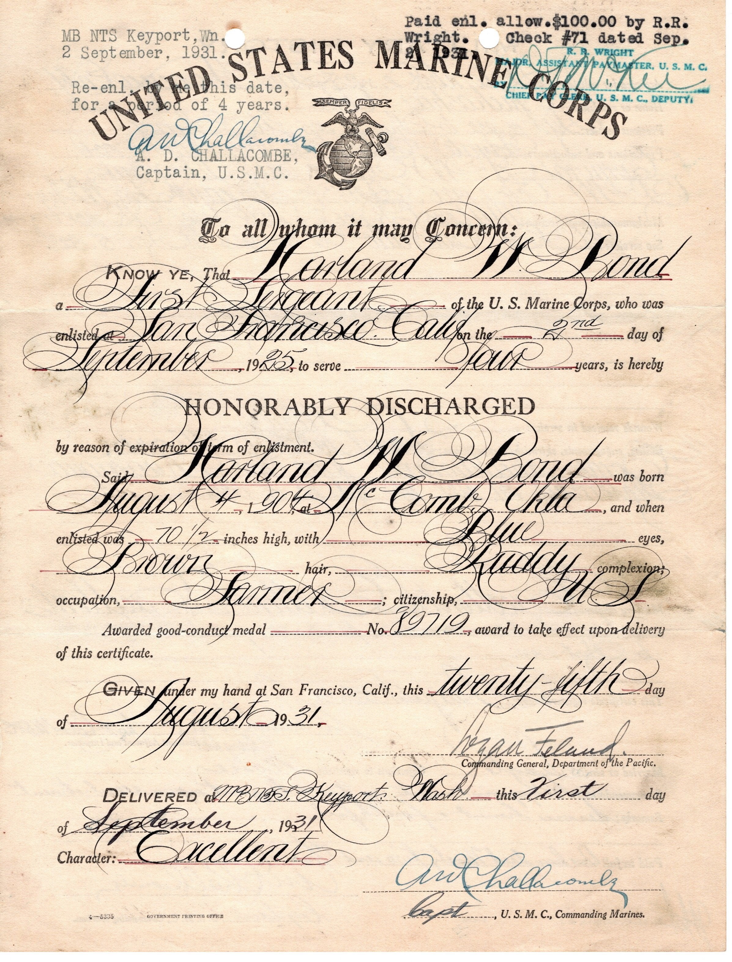 - SIX Original Honorable discharges - 1925, 1931, 1937, 1941, 1946.