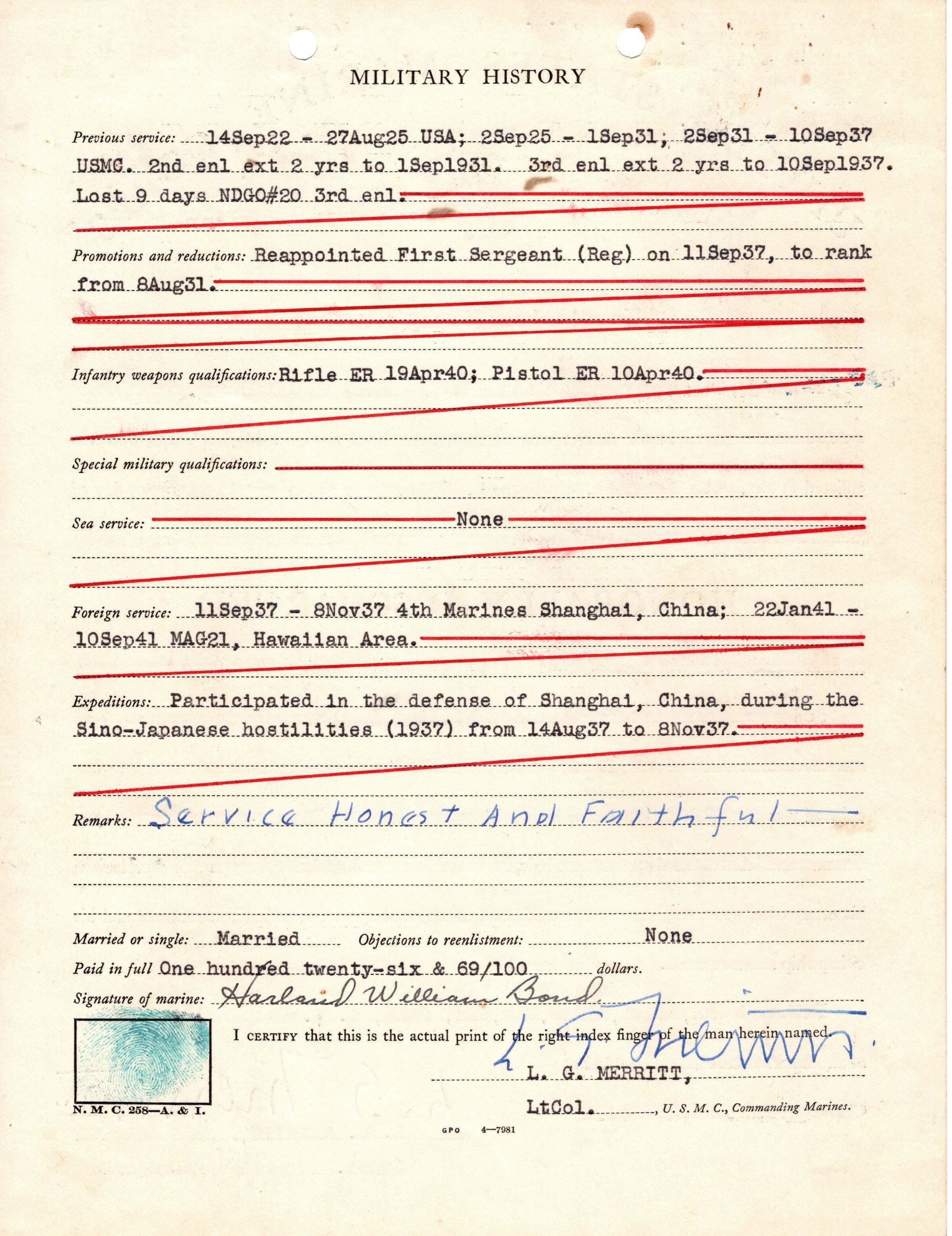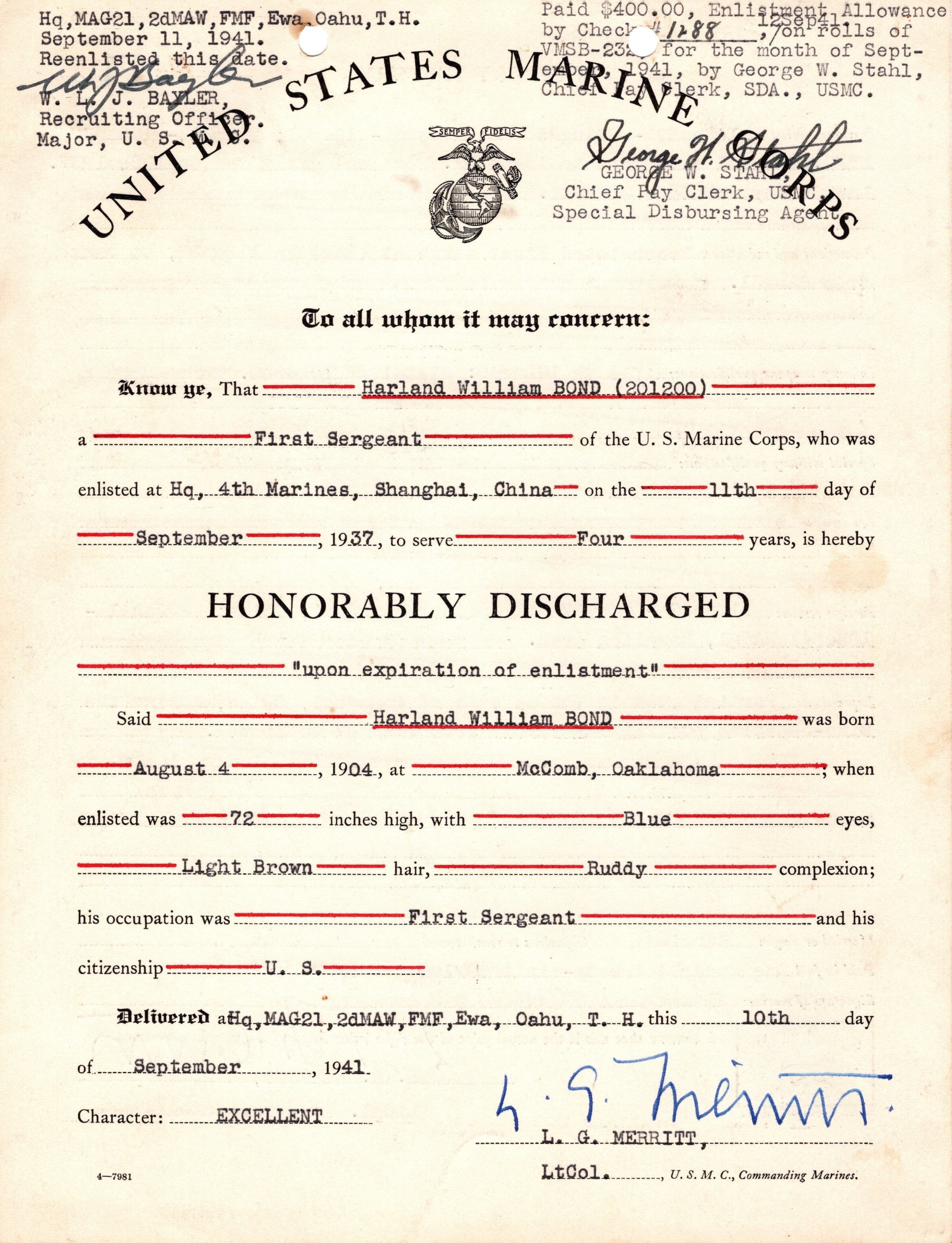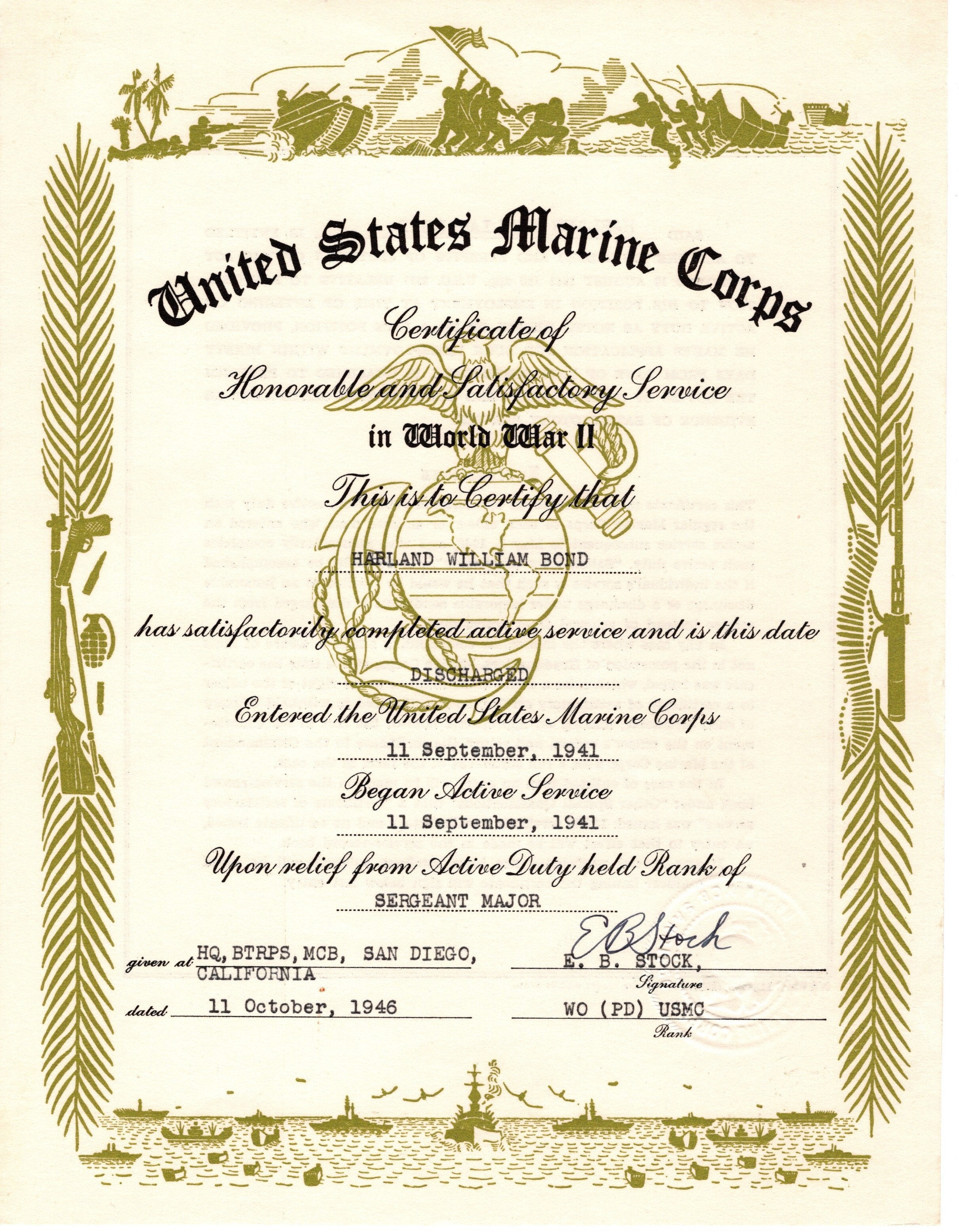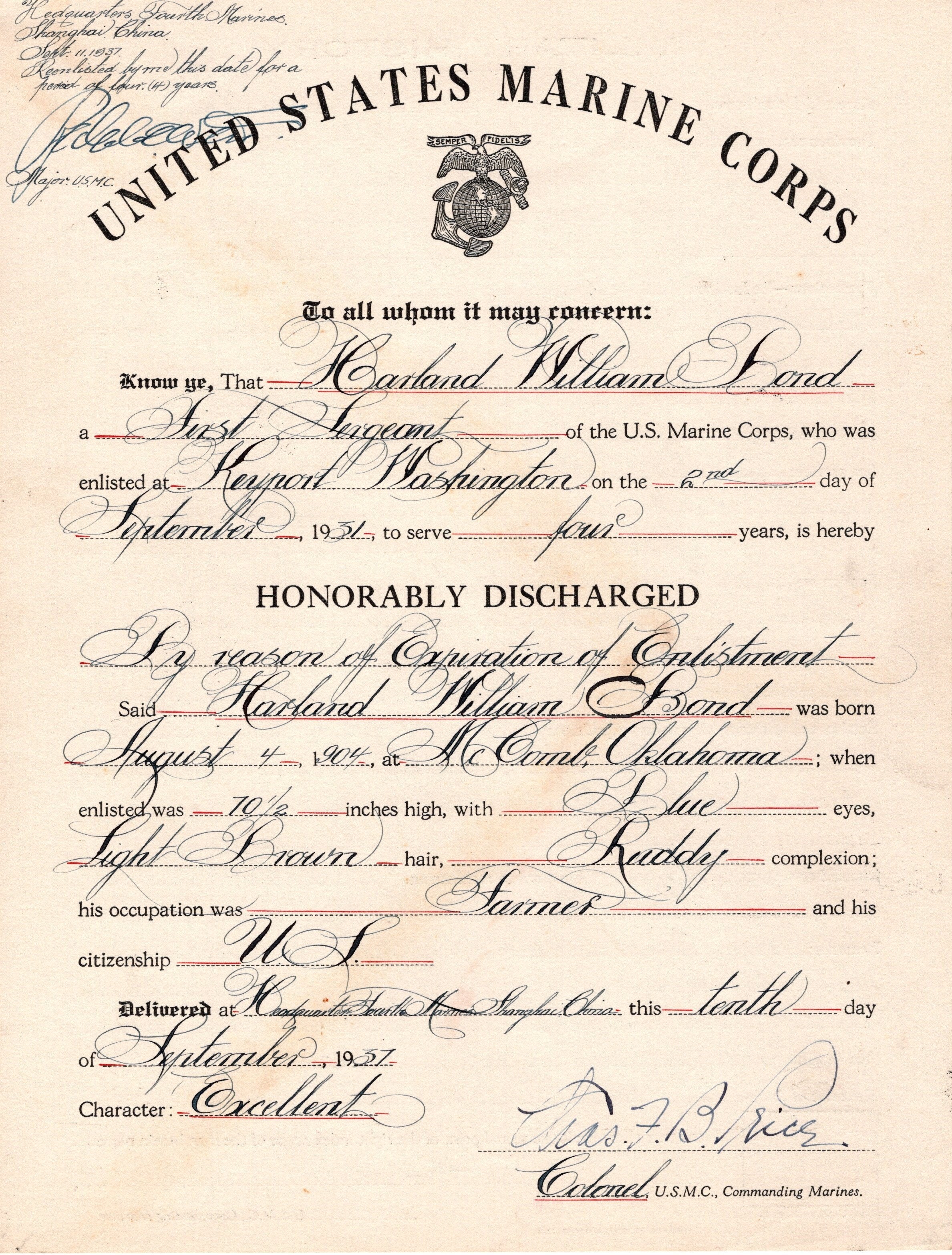 Original Items: One-of-a-kind set. This collection belonged to USMC Lieutenant (by battlefield commission) Harland W. Bond serial number 201200. Bond, first enlisted in the Marine Corps in the early 1920s and served through the duration of World War Two and after, a true career marine. Research shows that he spent time in Nicaragua, Hawaii, and China. This collection belonged to him and consists of the following items: