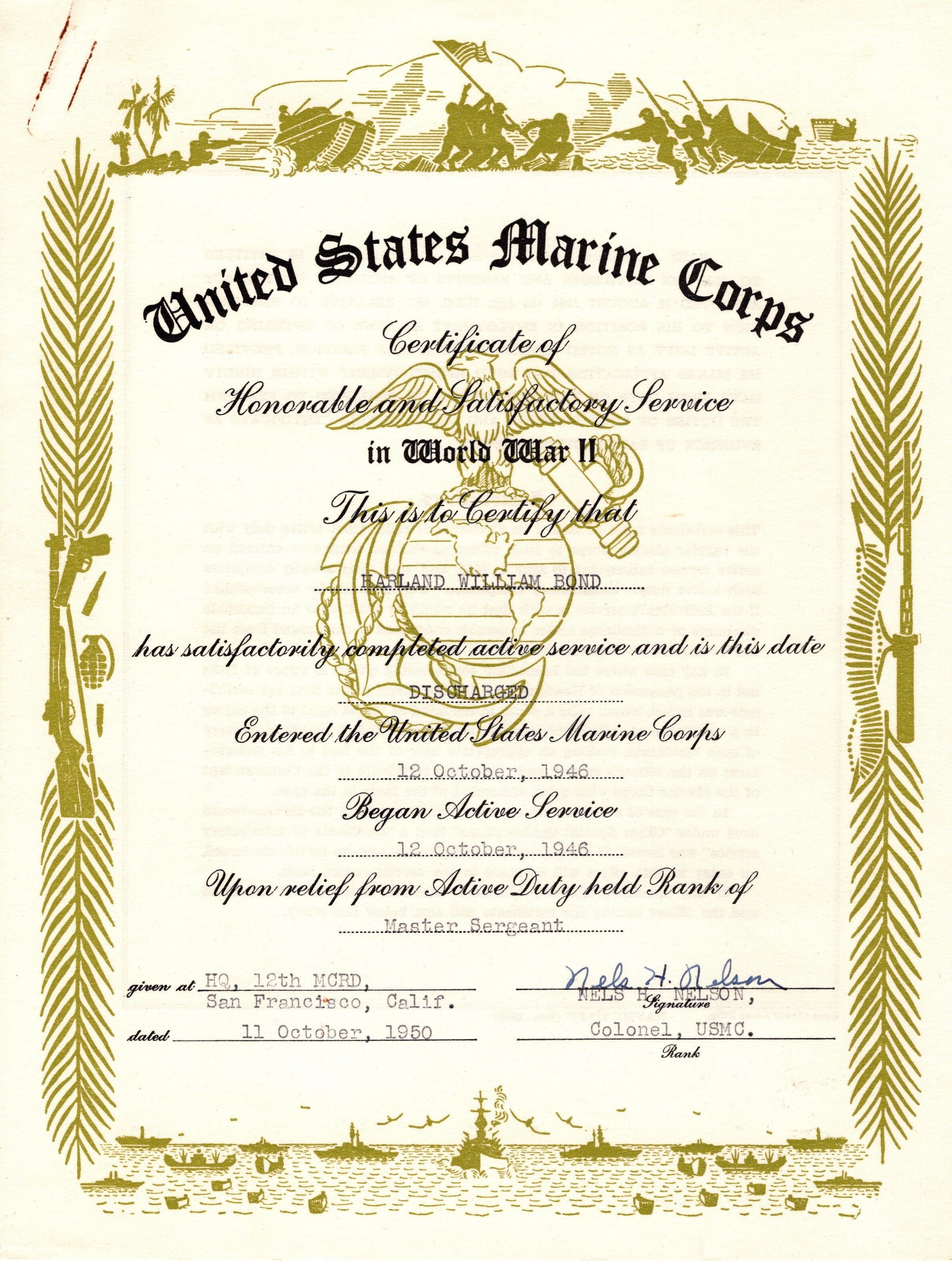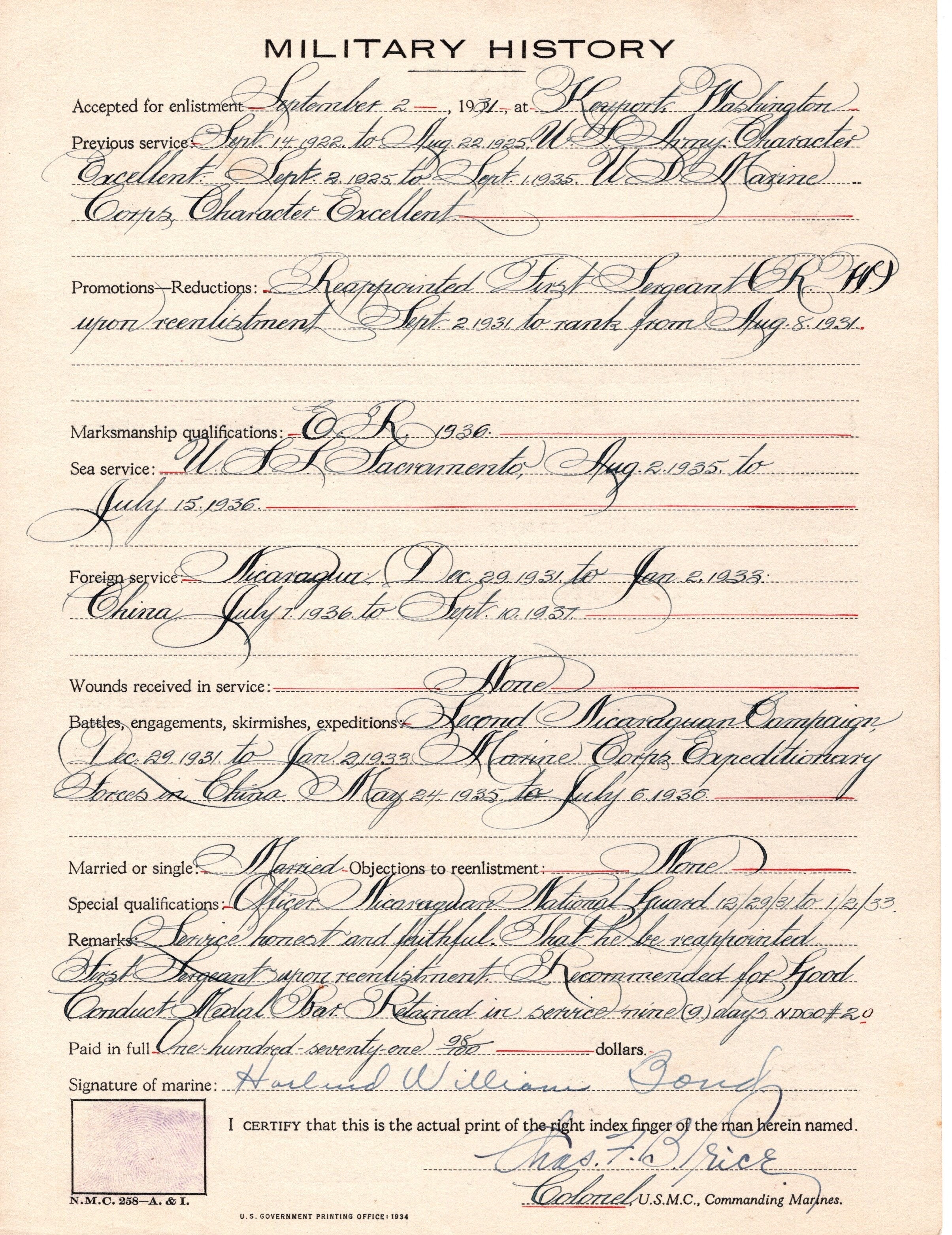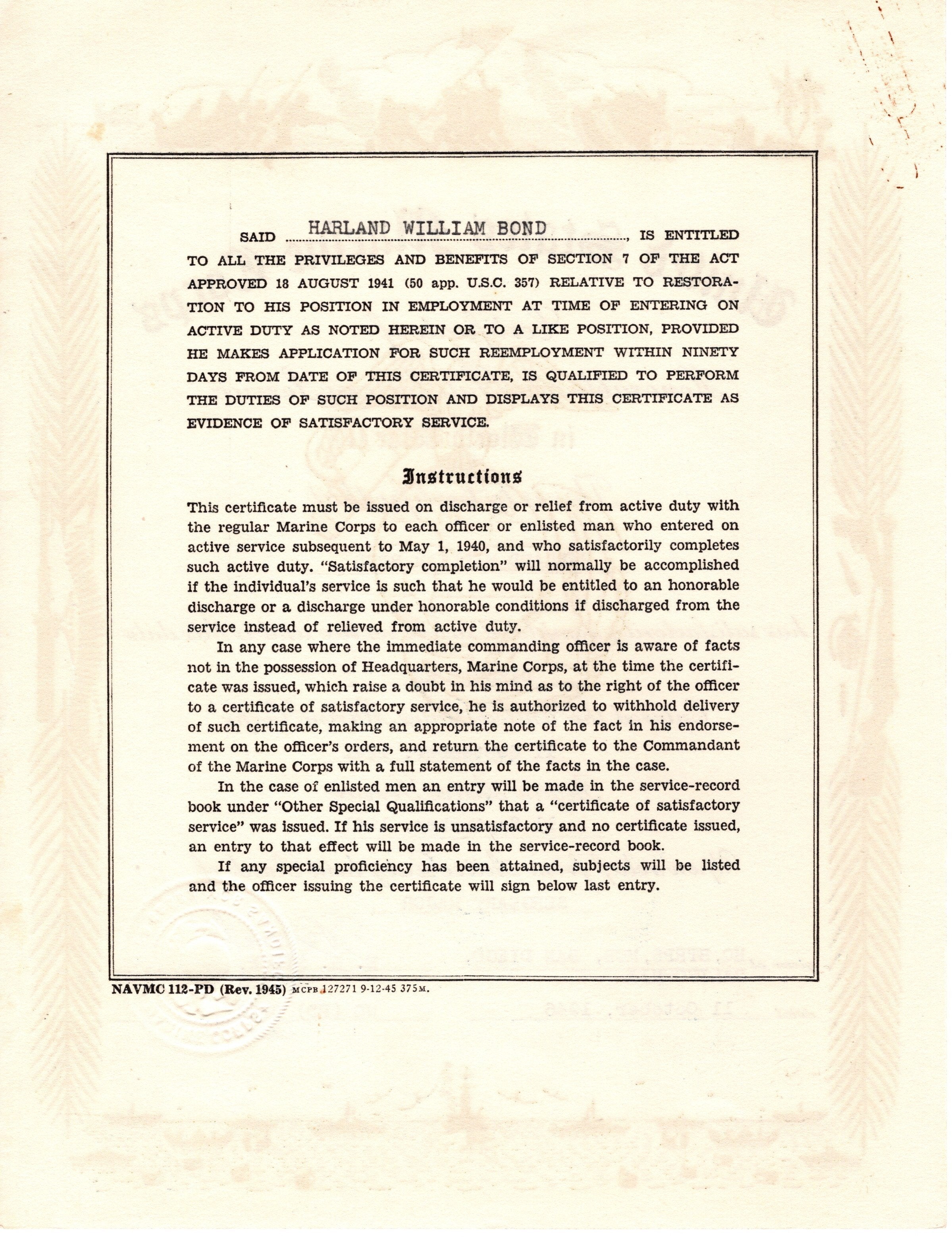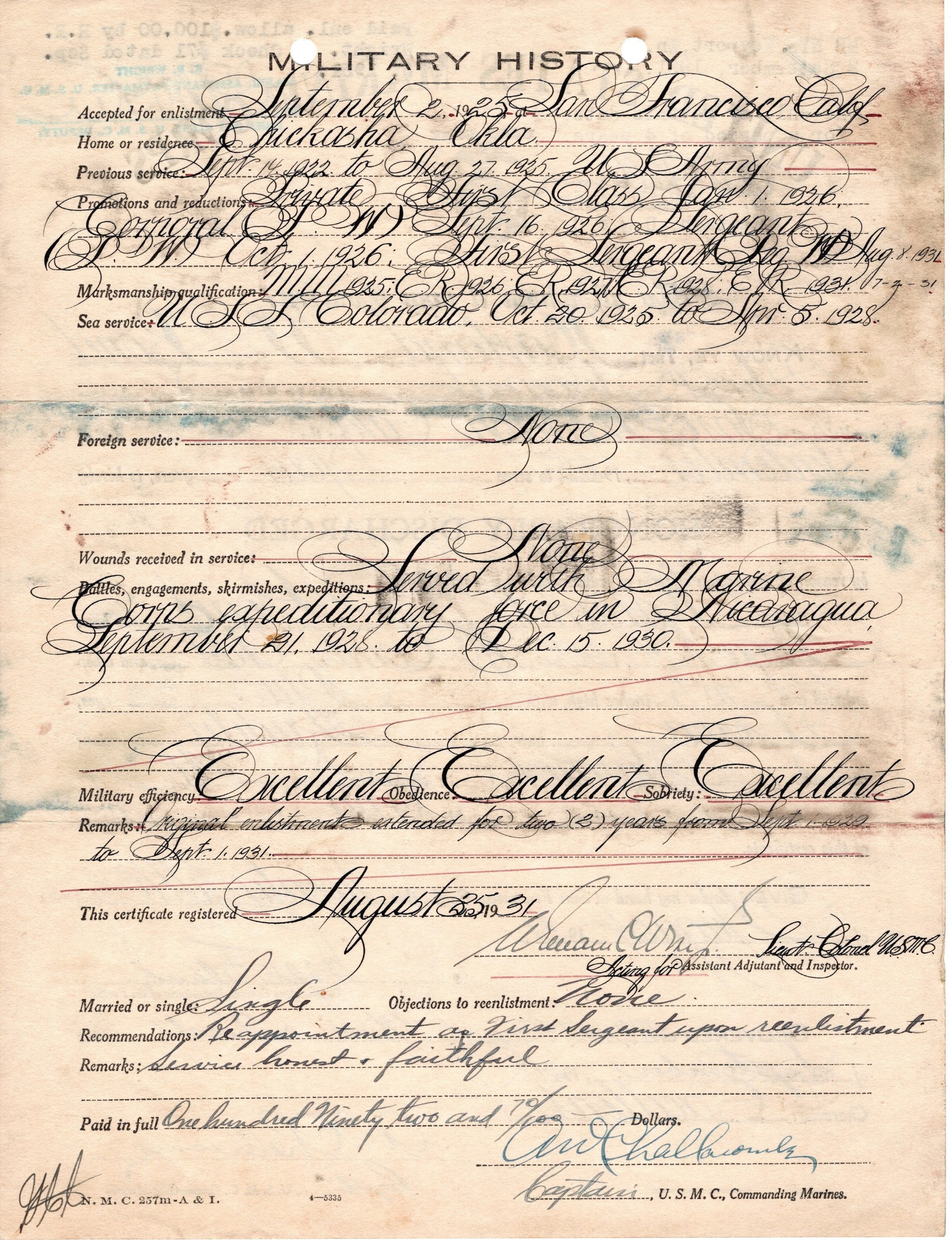 Original Items: One-of-a-kind set. This collection belonged to USMC Lieutenant (by battlefield commission) Harland W. Bond serial number 201200. Bond, first enlisted in the Marine Corps in the early 1920s and served through the duration of World War Two and after, a true career marine. Research shows that he spent time in Nicaragua, Hawaii, and China. This collection belonged to him and consists of the following items: