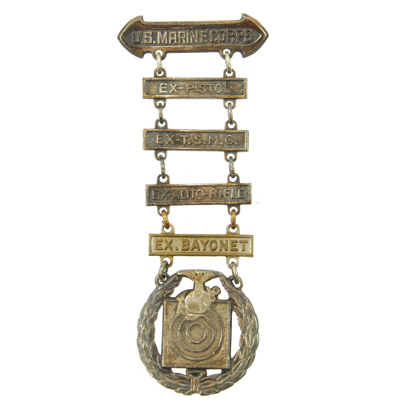 - U.S. Marine Corps Expert Badge with Pistol, T.S.M.G. (Thompson SMG), Auto-rifle, and Bayonet bars.