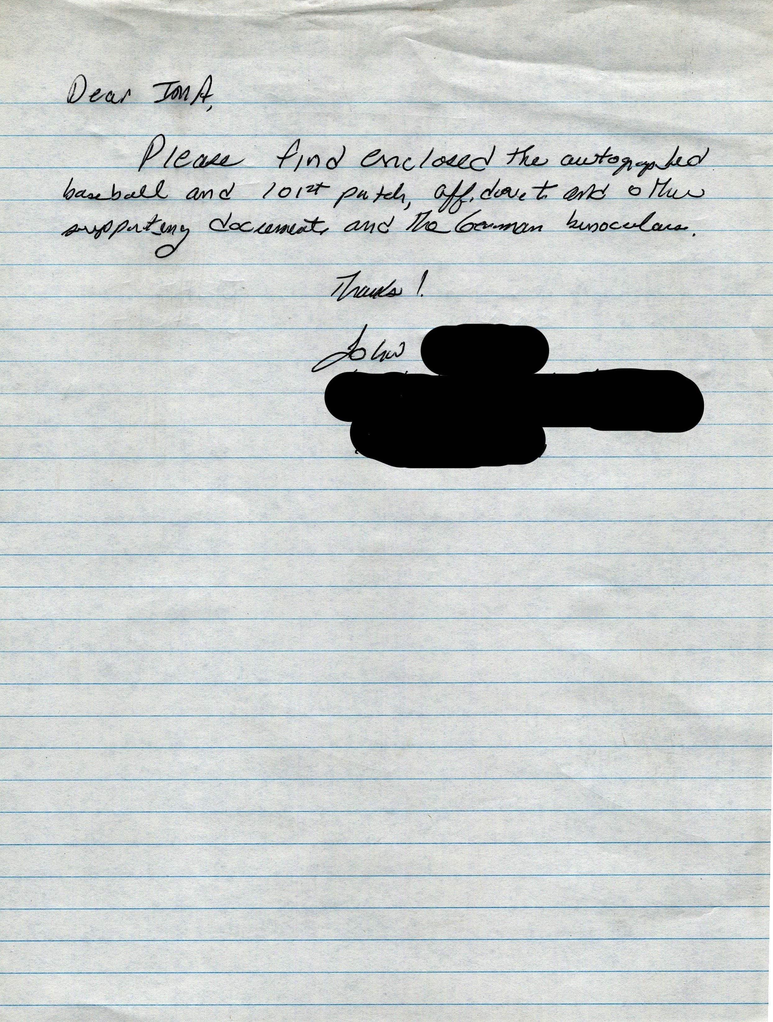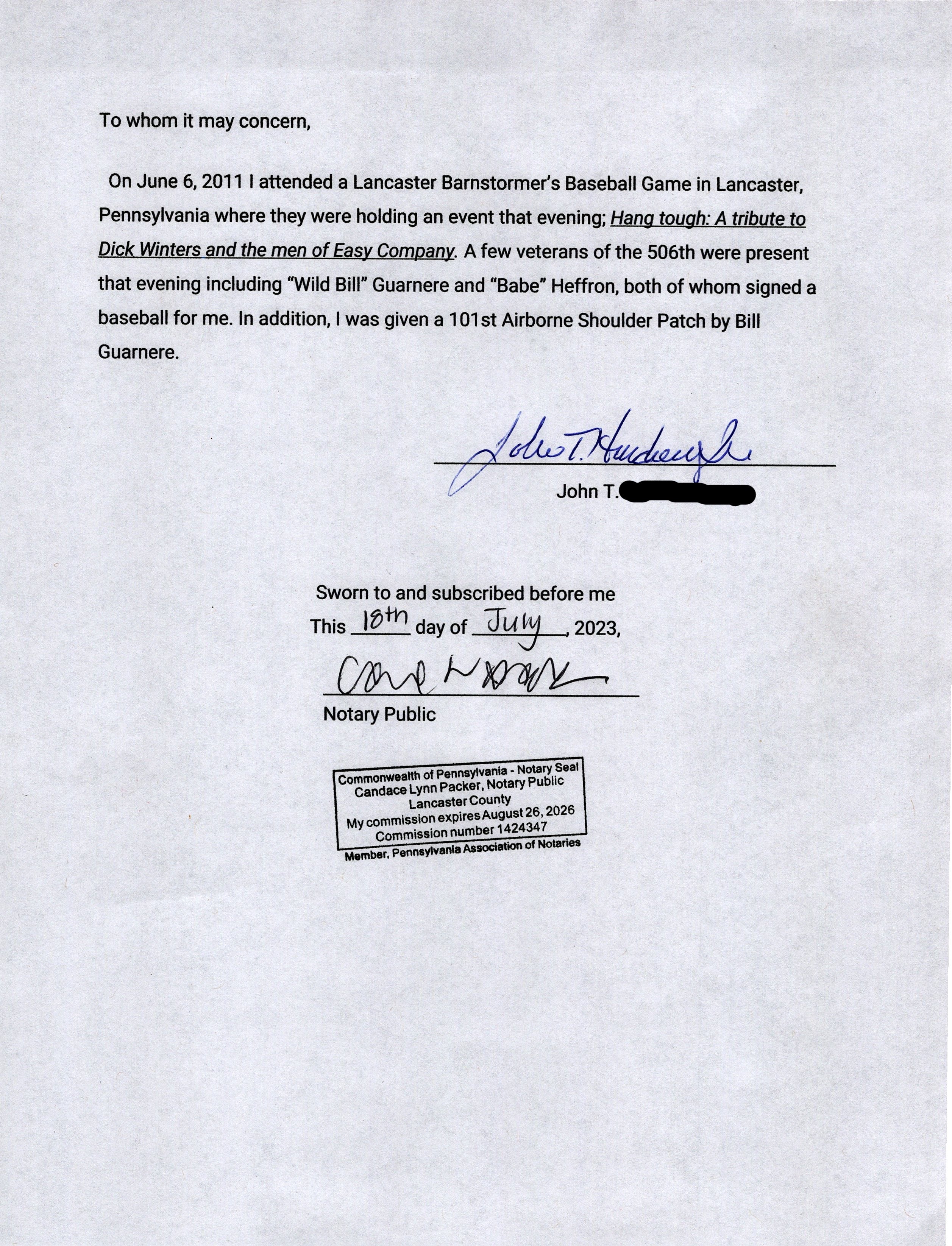 Accompanying both the baseball, patch and other documents is a signed and notarized letter attesting to the authenticity of all the pieces and that the patch was given to the collector by Guarnere himself.