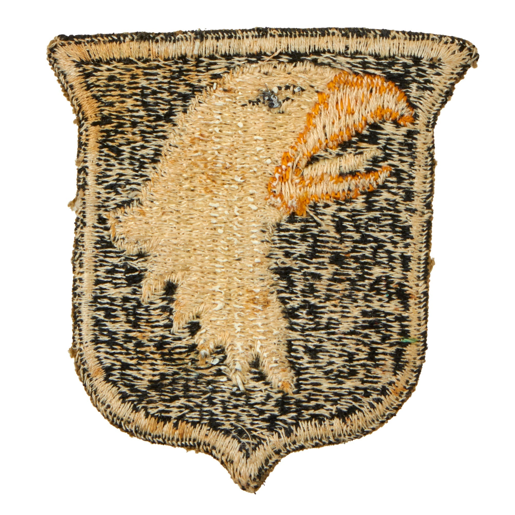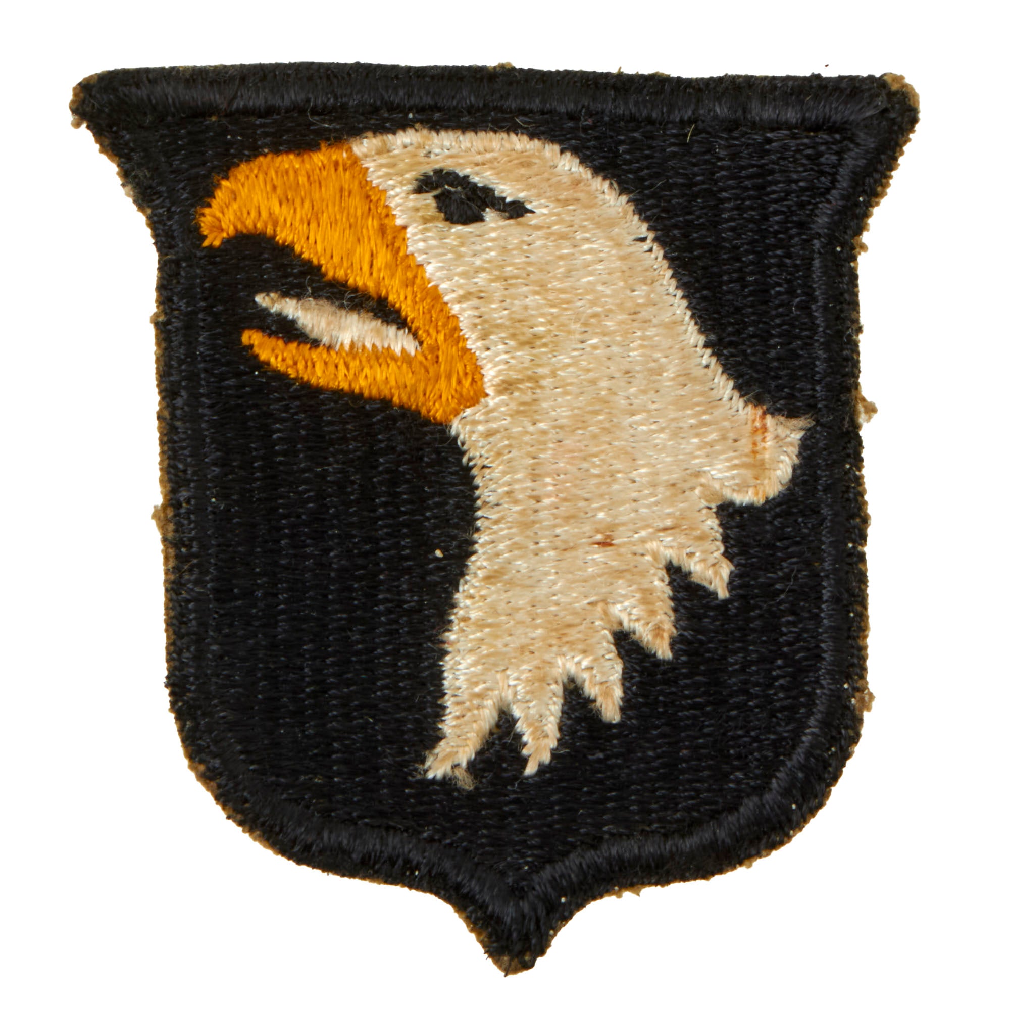 The shoulder sleeve insignia is a rare and unique white tongue variant of the famous "Screaming Eagle" patch. This highly sought-after patch features a black twill background, making it quite distinct from other variations. It is in excellent condition, which adds to its desirability, but it is extremely difficult to find. One of the most intriguing aspects of this patch is that it does not glow under a black-light. This fact indicates that it was produced before 1945, which makes it a true collector's item. In an attempt to provide visual evidence of its authenticity, we tried to take a picture of the patch on a white backdrop with a black-light, but the difficulty of the task made it impossible to get usable images. Nonetheless, we can assure you that this is an authentic patch that was owned by none other than "Wild Bill" himself.