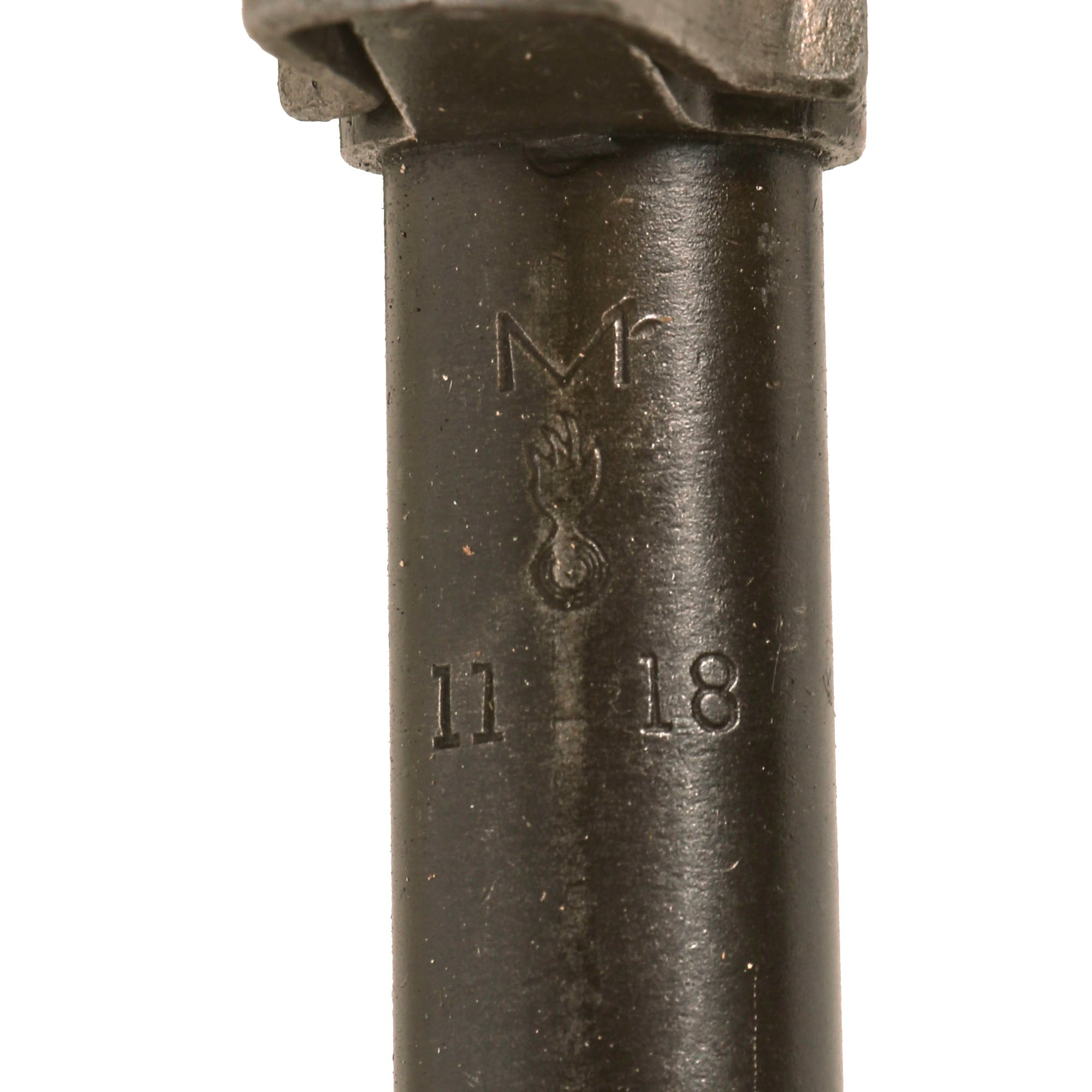 It also has a fantastic LIVE WWI issue barrel marked M / (Flaming Bomb) 11 - 18, for October 1918 manufacture by Marlin-Rockwell Corporation, one of the known WWI producers of the BAR. The chamber is intact, and the bore is in very good condition, with lands and grooves showing light wear and some oxidation. All parts aside from the receiver and cocking handle are genuine U.S. issue parts, many of which have issue markings and part numbers.