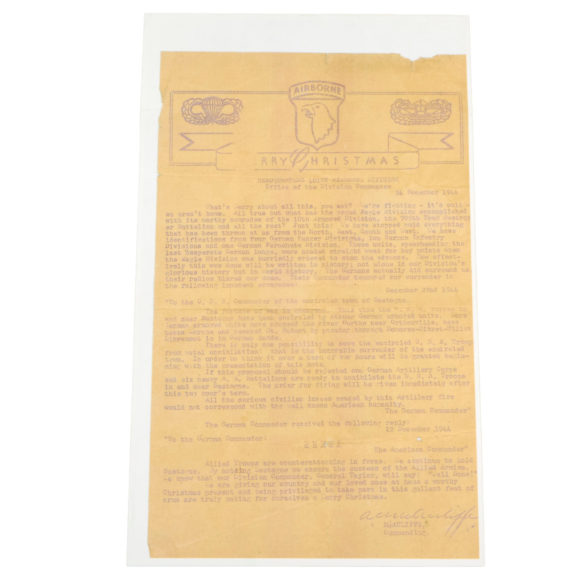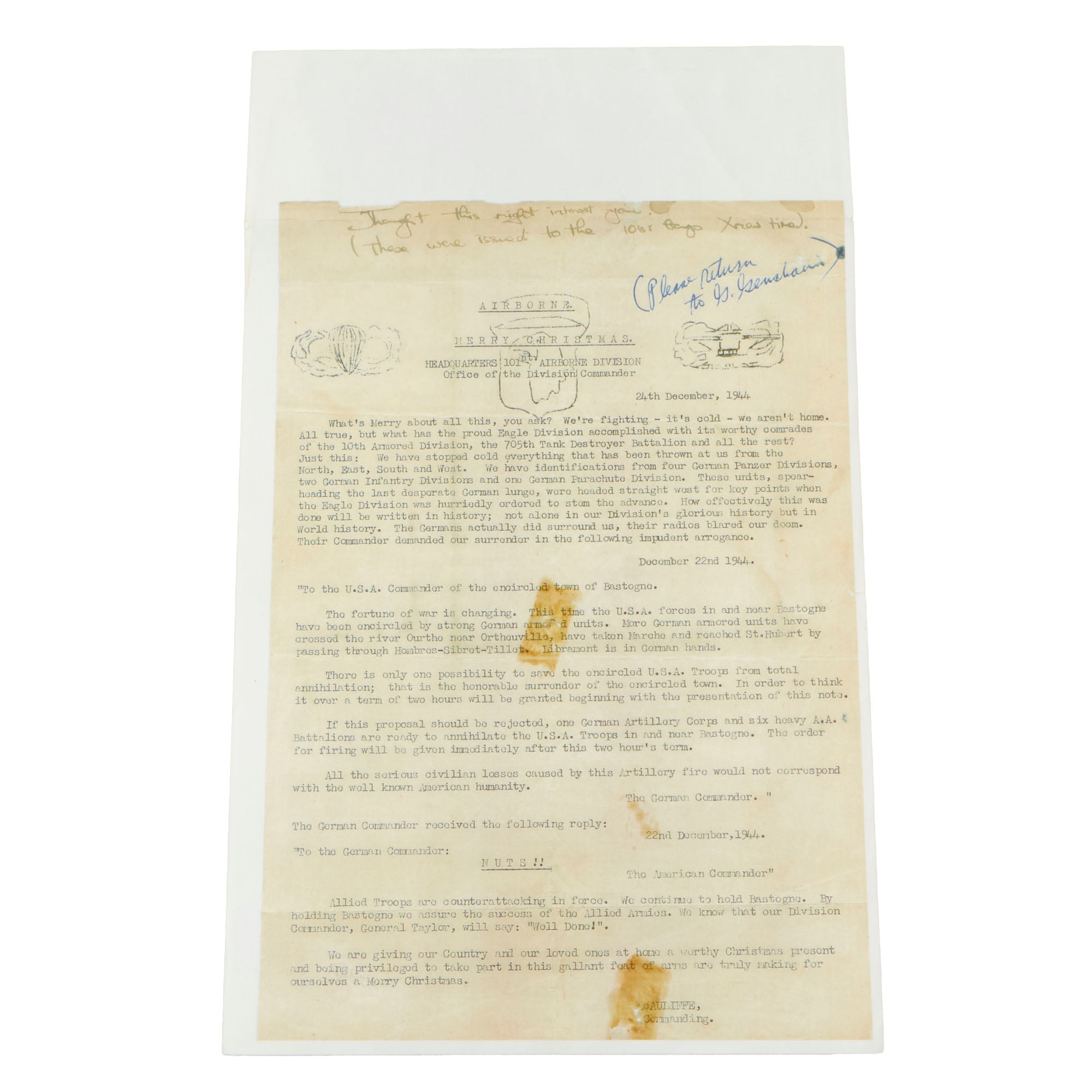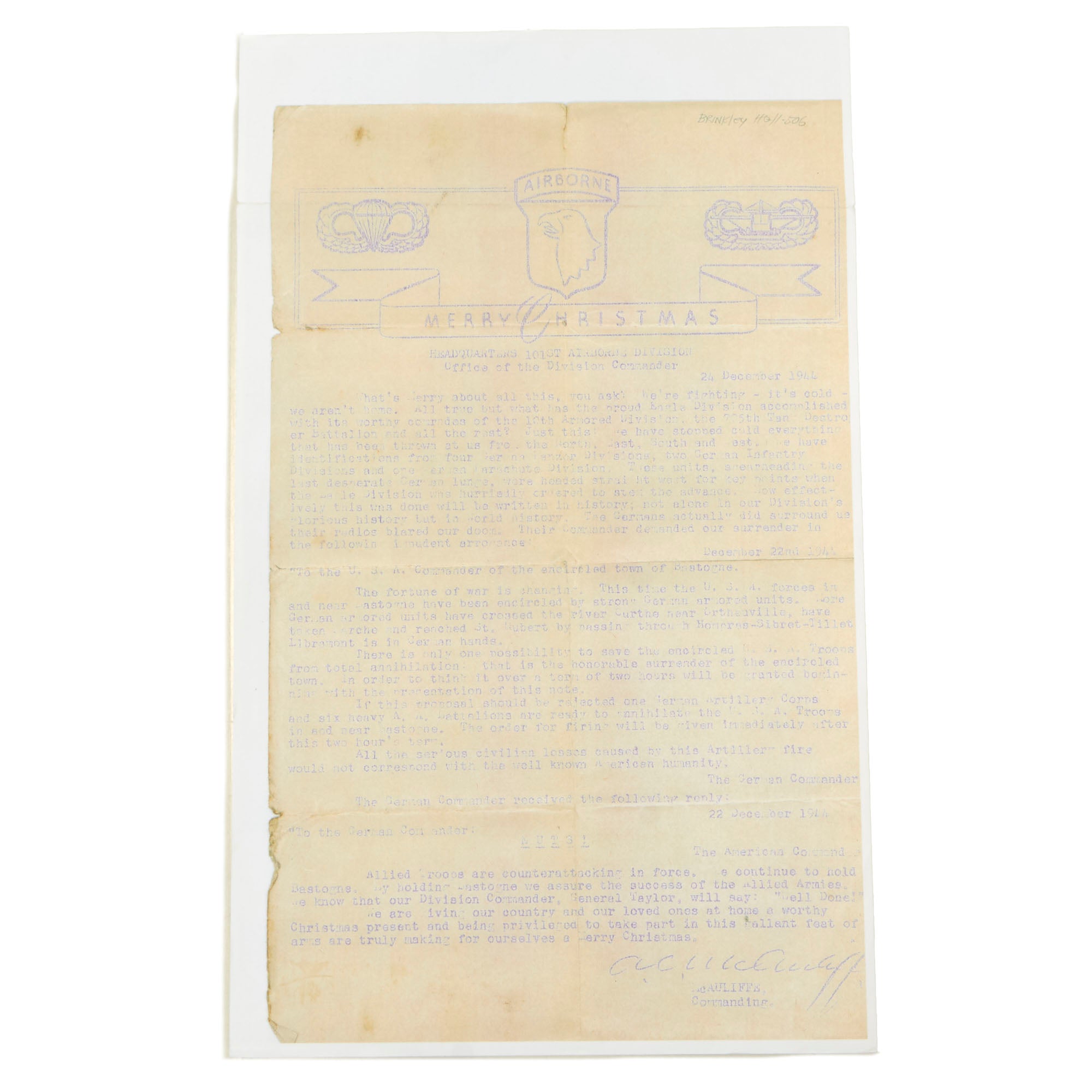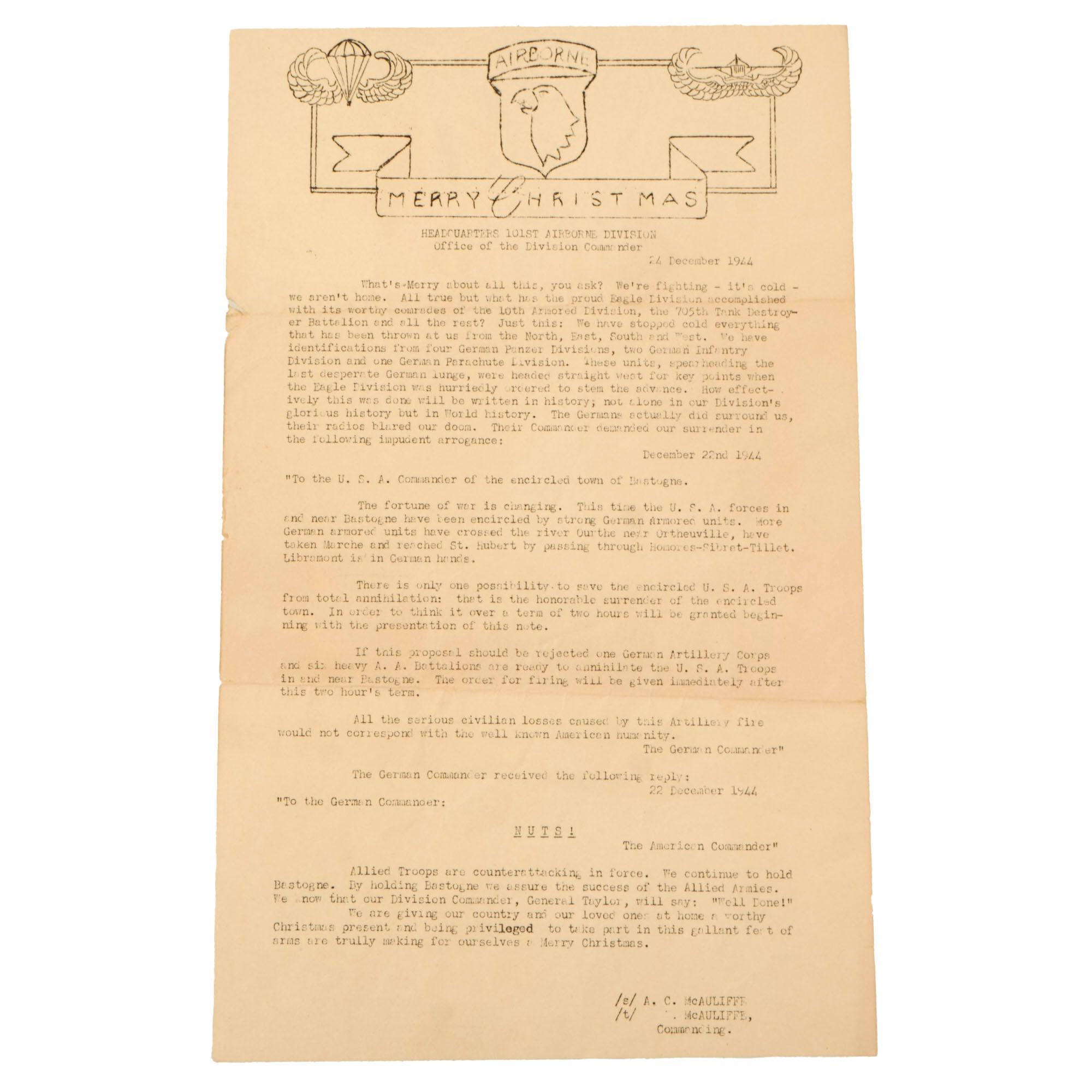Original Item. Only One Available. In December of 1944, Allied forces were surprised by a massive German offensive through the Ardennes Forrest that created a "bulge" in the Allied lines in what would become known as the "Battle of the Bulge." The 101st Airborne Division of the United States Armed Forces was holed up in Bastogne while German armored divisions encircled the town. Outnumbered, outgunned, and running out of food, ammunition, and medical supplies, the embattled assistant division commander, Brigadier General Anthony McAuliffe, faced bleak prospects.