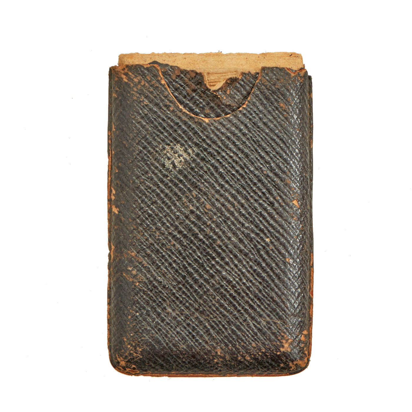 The last two items in this grouping are the wallet and cribbage board he mentioned in his notes. The leather wallet measures 7” x 3 ½” while folded. There are pockets on both sides of the wallet and in one of the pockets is a small mirror. The cribbage board is in a leather sleeve and measures 3 ½” x 2”. The board is in worn condition but is undamaged. The best part of this cribbage board is that all 4 tiny pegs are still inside the leather storage pockets inside of the board!