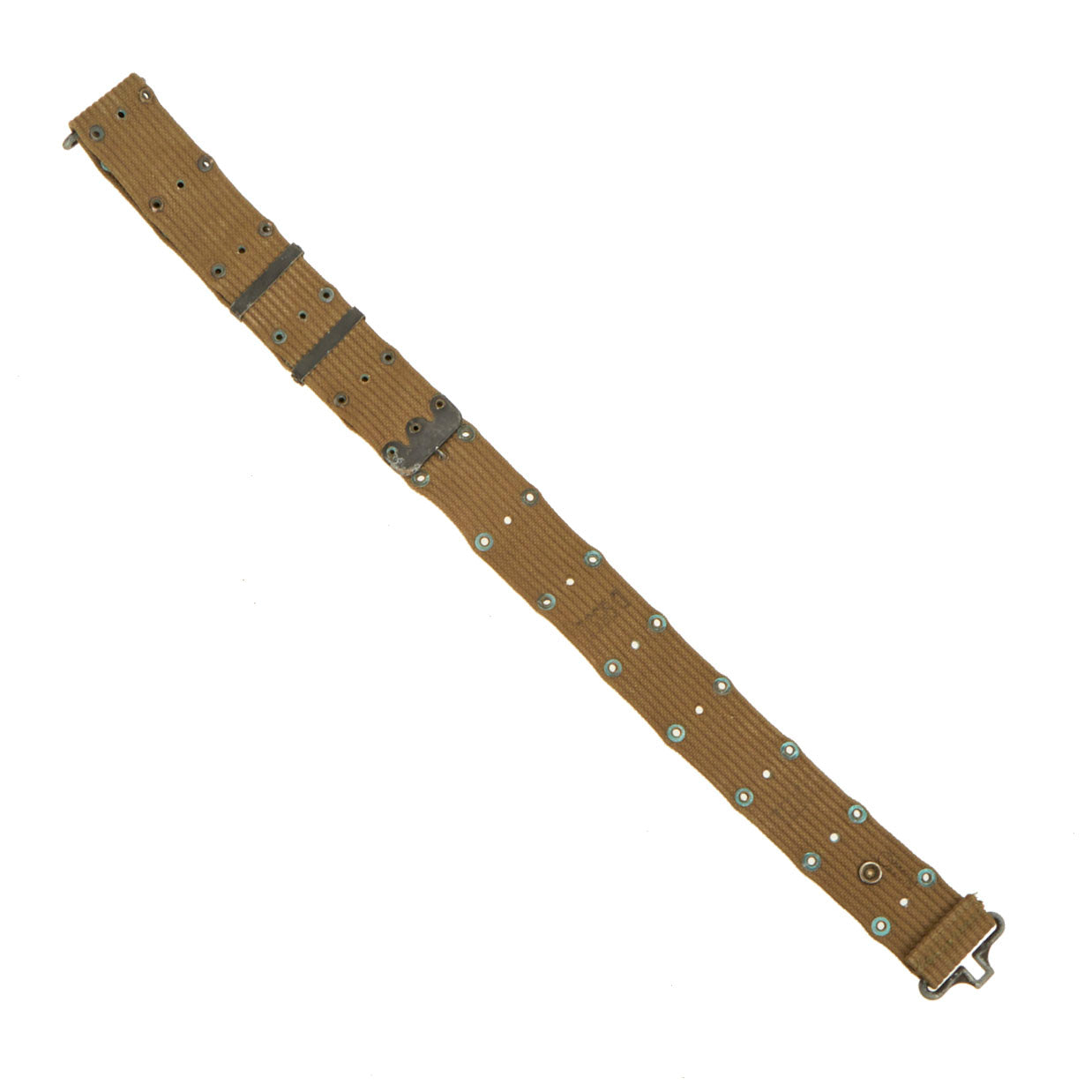 M1936 Pistol Belt: The belt is faintly stamped US on the front and there are other markings still faintly visible on the inside. The brass grommets and buckles do have some verdigris present. There is no extensive damage to the belt, but it is faded and shows signs of heavy use and wear.