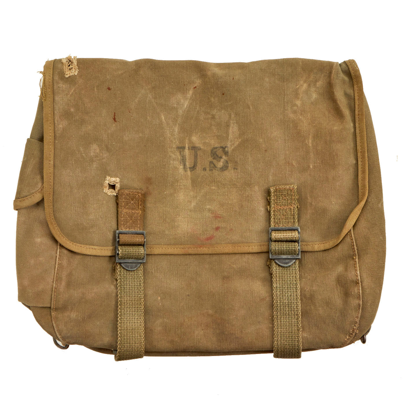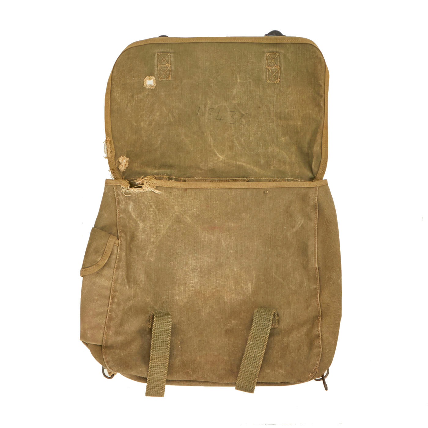 Battle Damaged Musette Bag: The bag has a small hole caused by shrapnel from German artillery just above the left buckle (as you’re looking at it). All buckles and straps appear to be present and are in functioning condition. The bag has heavy fading and the look of “being there” and shows signs of heavy use. Besides the shrapnel holes there is no other extensive damage visible.