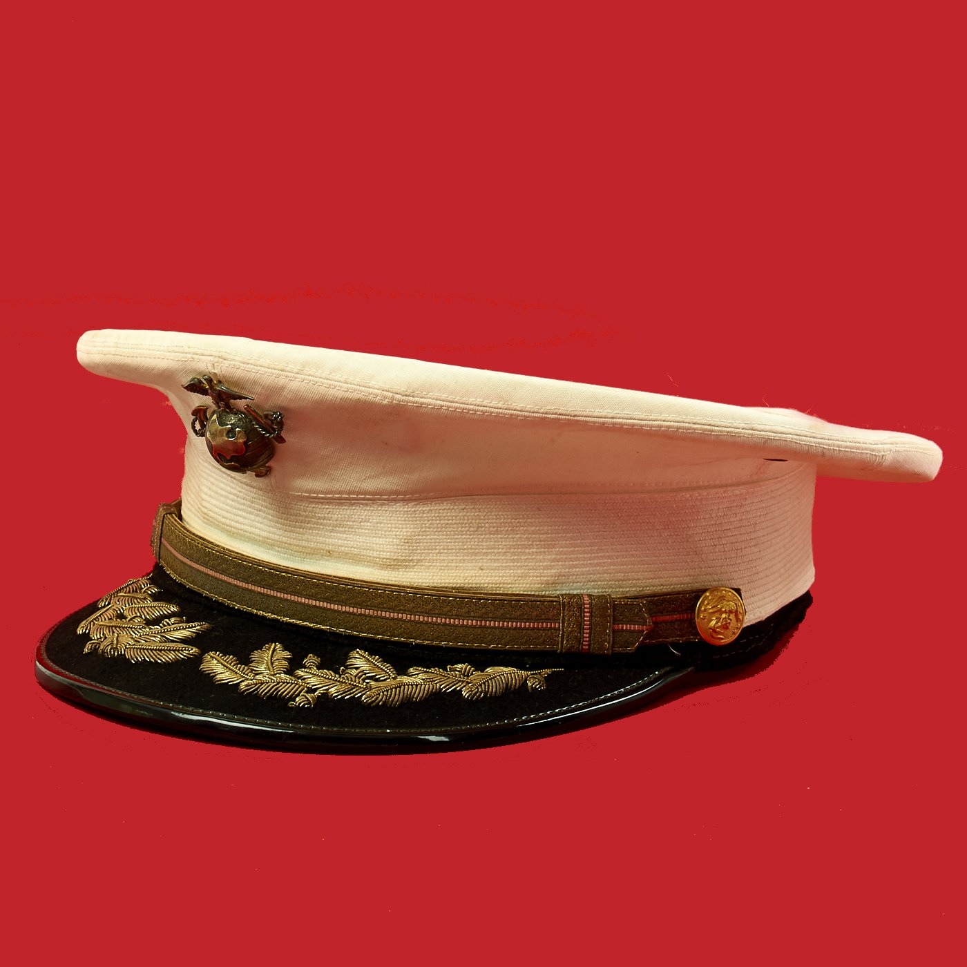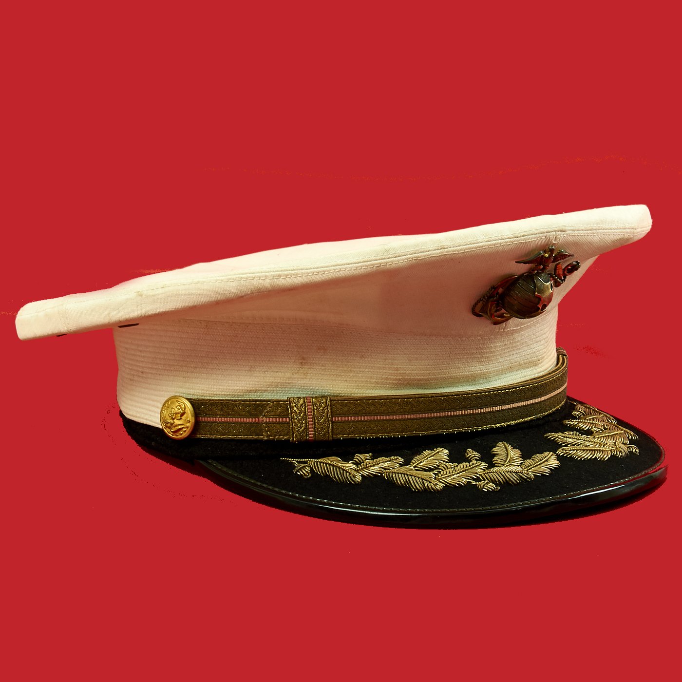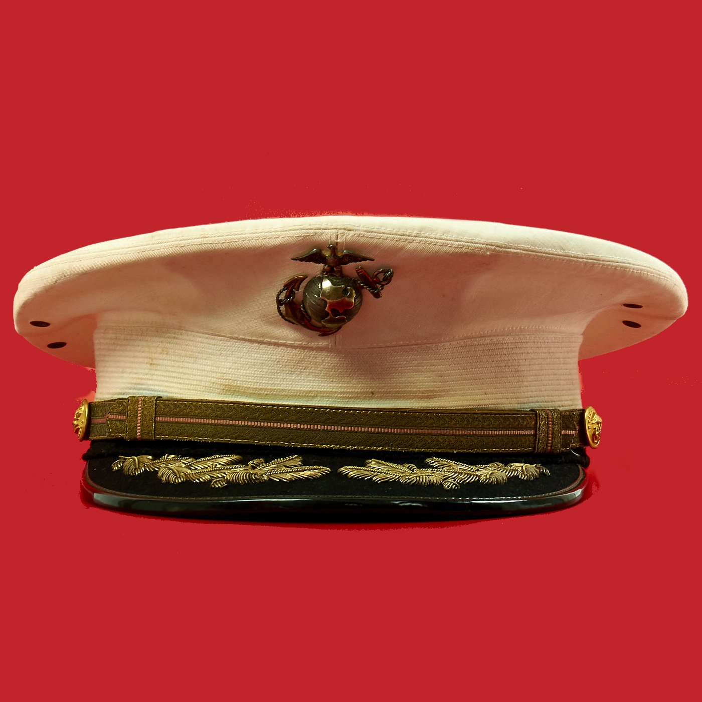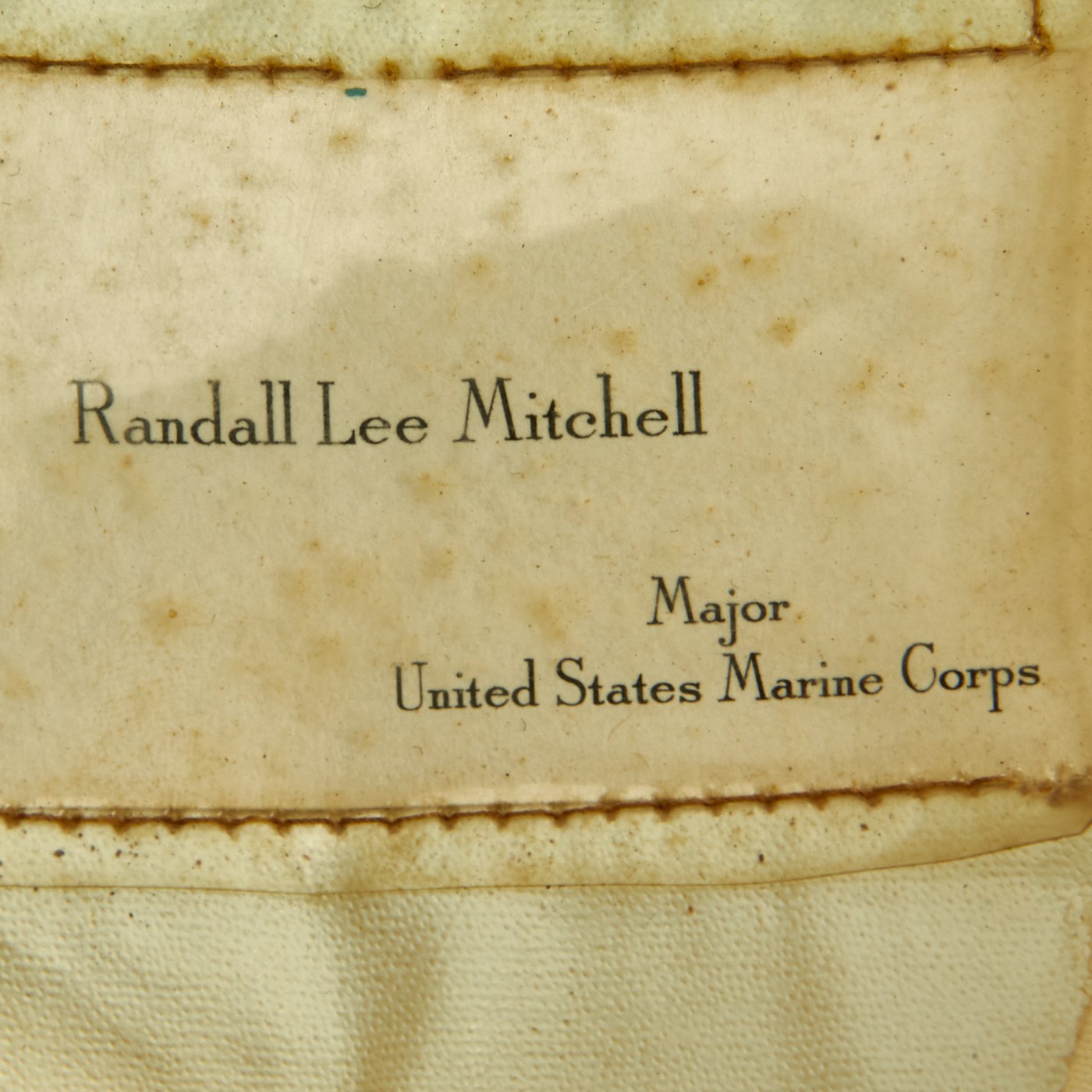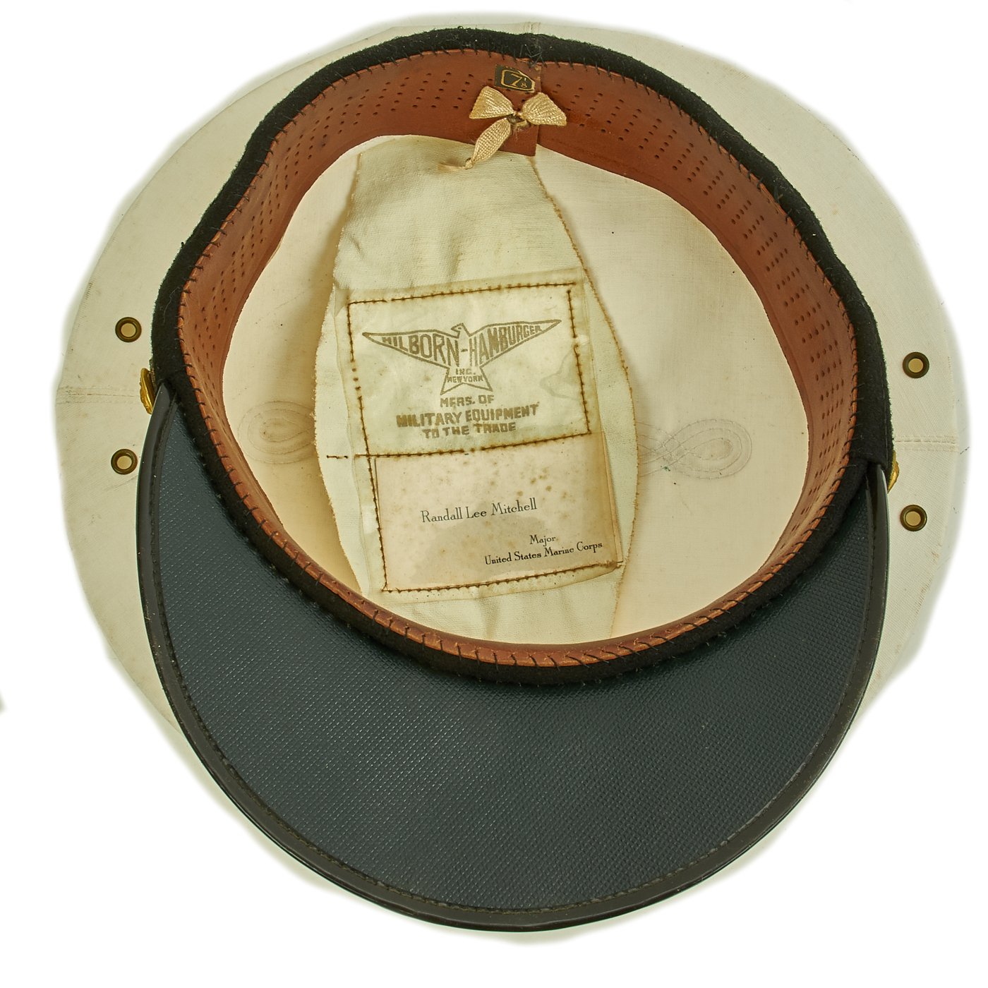 Original Item: One-of-a-kind. This is a fanatic World War Two United States Marine Corps officer white visor hat named to Major Randall Lee Mitchell (Serial# 014070). Major Mitchell was assigned to Battery K, 4th Battalion, 11th Marines, 1st Marine Division, and was WIA wounded in Action on September 16th, 1944 which was the second day of the Battle of Peleliu on the Palau Islands. The hat bear his card and an ink stamp of his name on the interior of the leather sweatband. Hat was made by Hilborn Hamburger (HH) and is offered in excellent condition. Features and officers EGA hat badge, bullion wire laurel leaf felt topped leather visor, quatrefoil and wicker frame construction. Size is US 7 1/8 (57cm). Overall condition is very good to excellent. Major Mitchell's memorial page can be seen at this link.