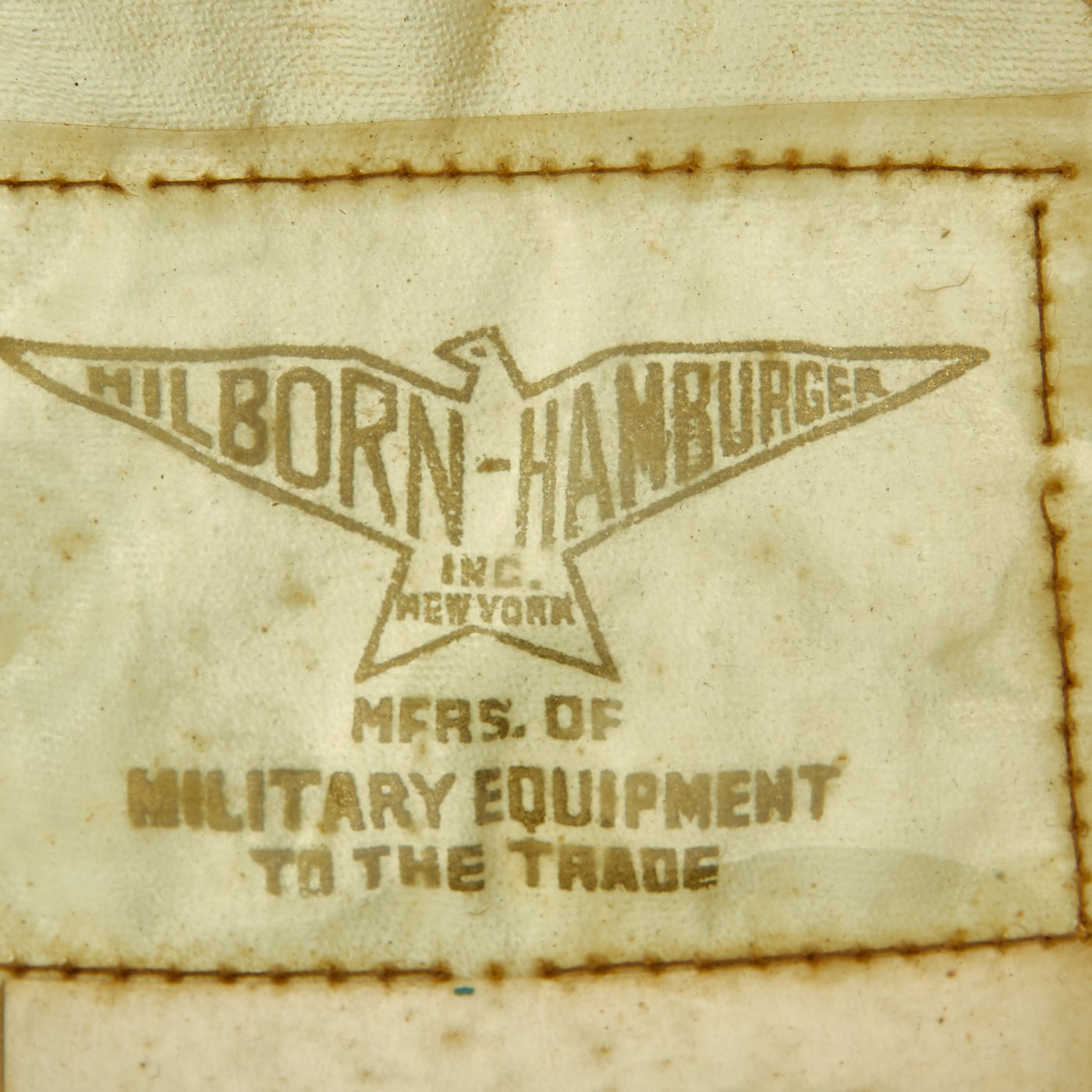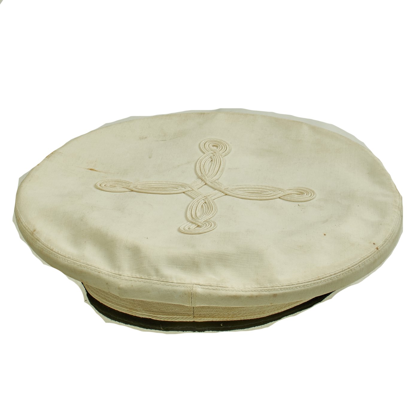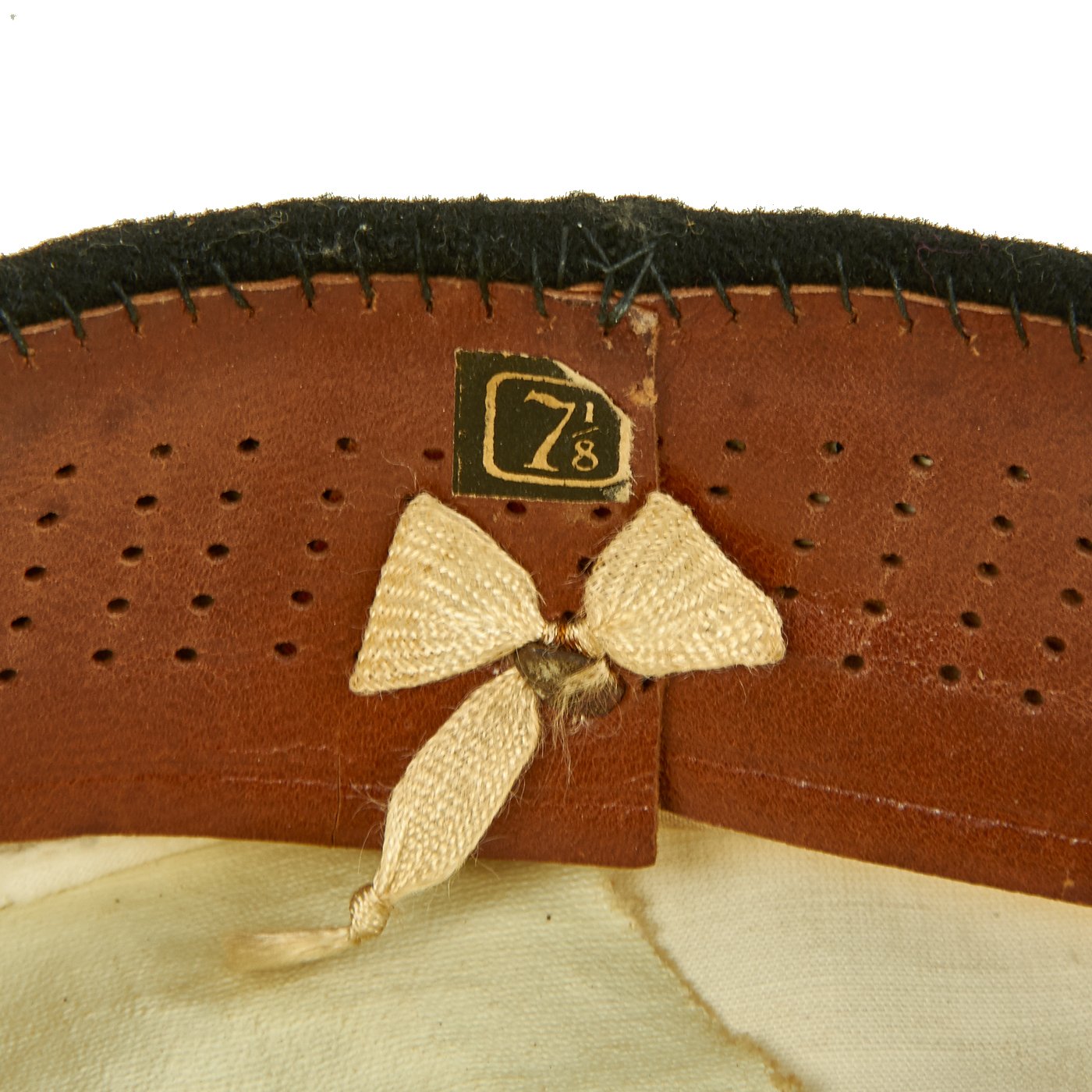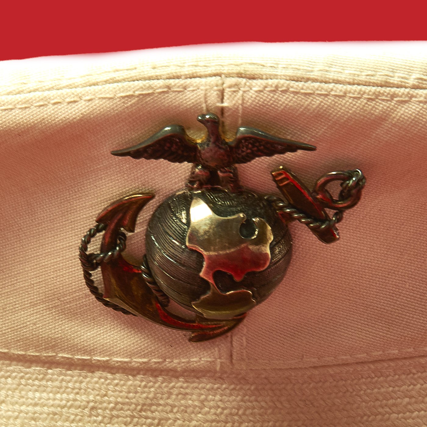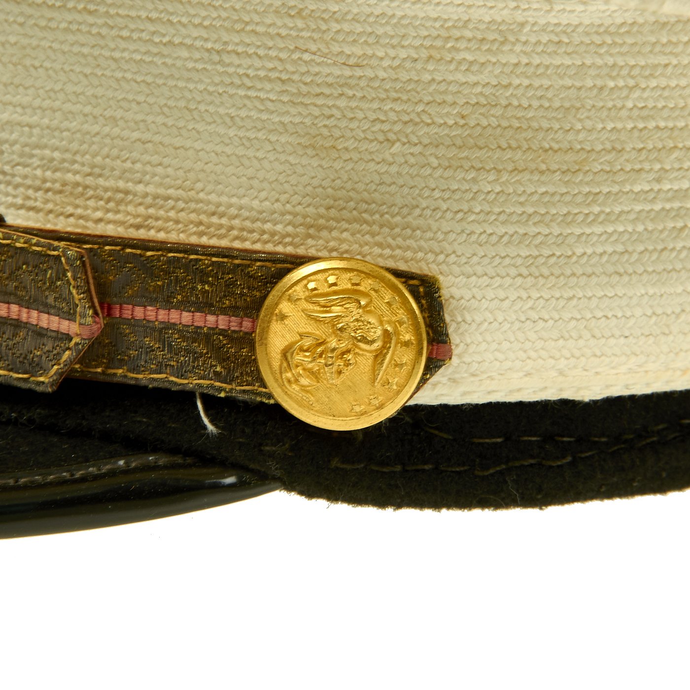 Original Item: One-of-a-kind. This is a fanatic World War Two United States Marine Corps officer white visor hat named to Major Randall Lee Mitchell (Serial# 014070). Major Mitchell was assigned to Battery K, 4th Battalion, 11th Marines, 1st Marine Division, and was WIA wounded in Action on September 16th, 1944 which was the second day of the Battle of Peleliu on the Palau Islands. The hat bear his card and an ink stamp of his name on the interior of the leather sweatband. Hat was made by Hilborn Hamburger (HH) and is offered in excellent condition. Features and officers EGA hat badge, bullion wire laurel leaf felt topped leather visor, quatrefoil and wicker frame construction. Size is US 7 1/8 (57cm). Overall condition is very good to excellent. Major Mitchell's memorial page can be seen at this link.