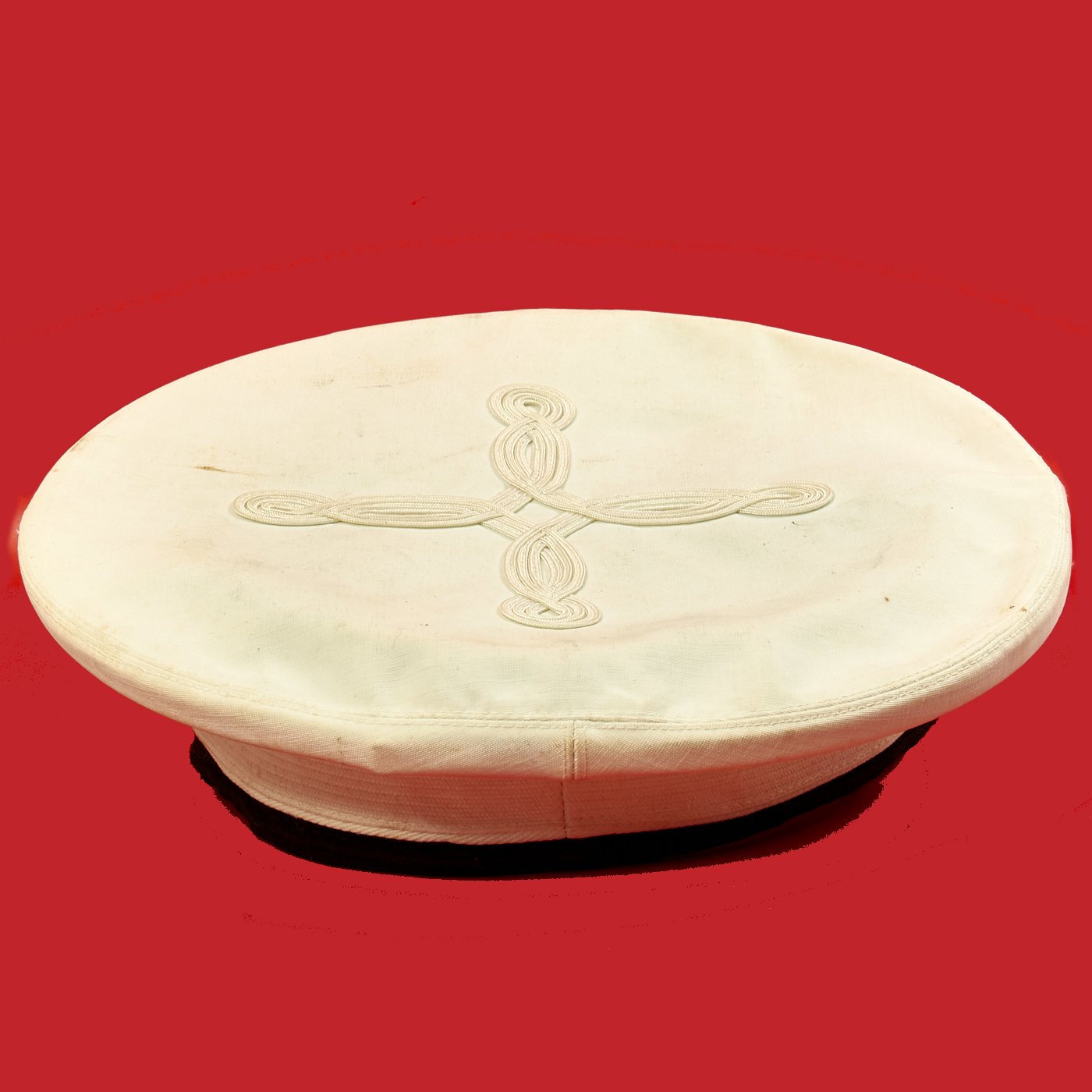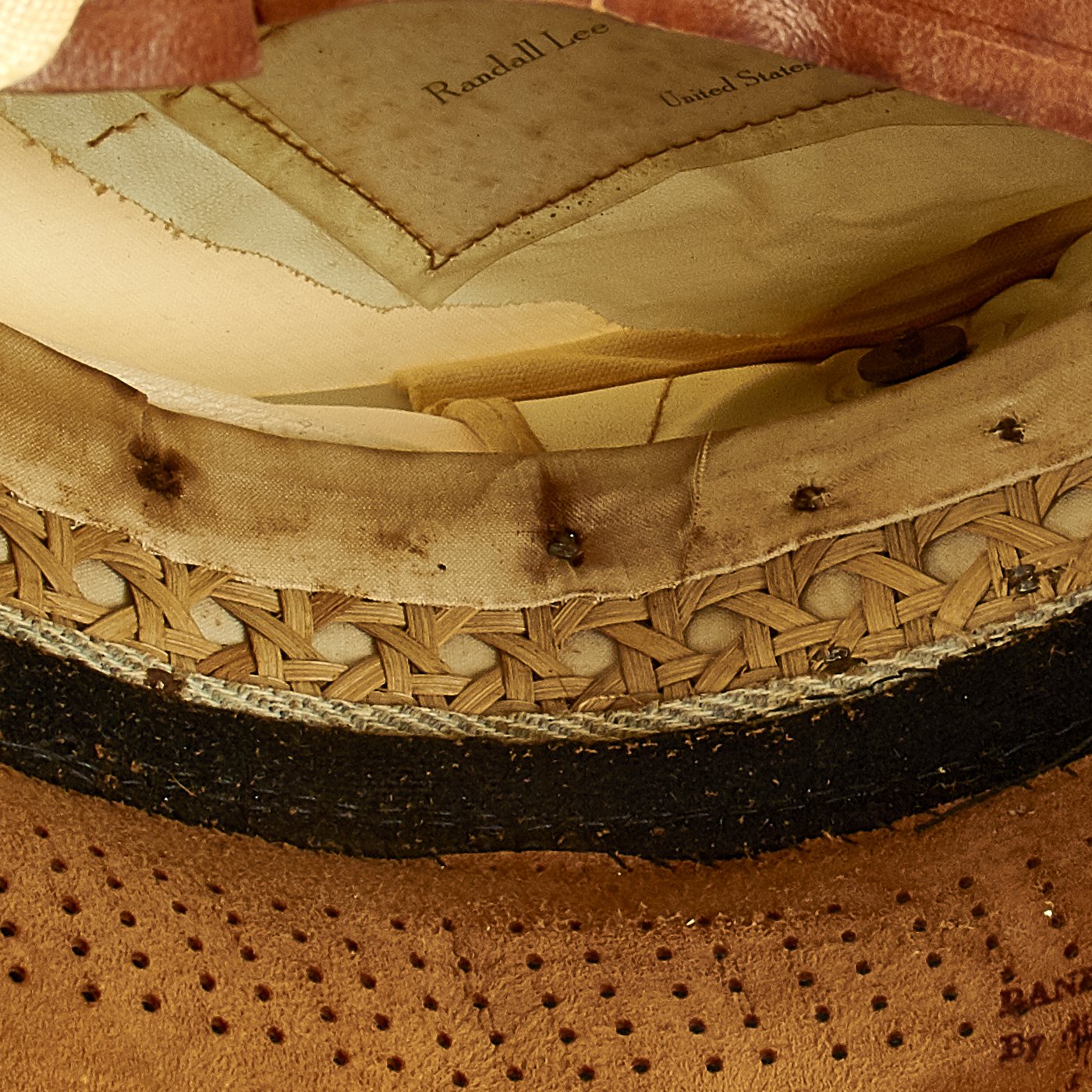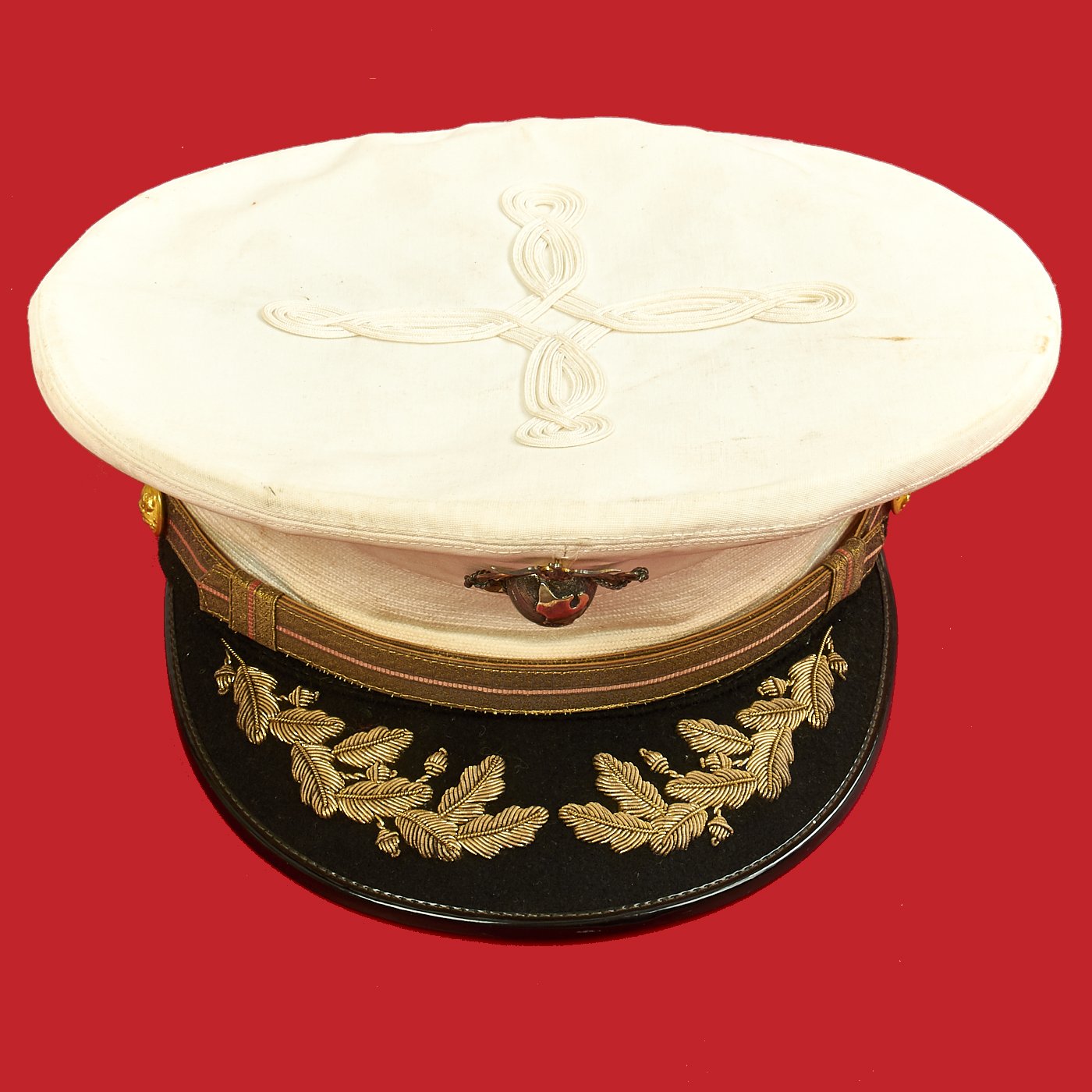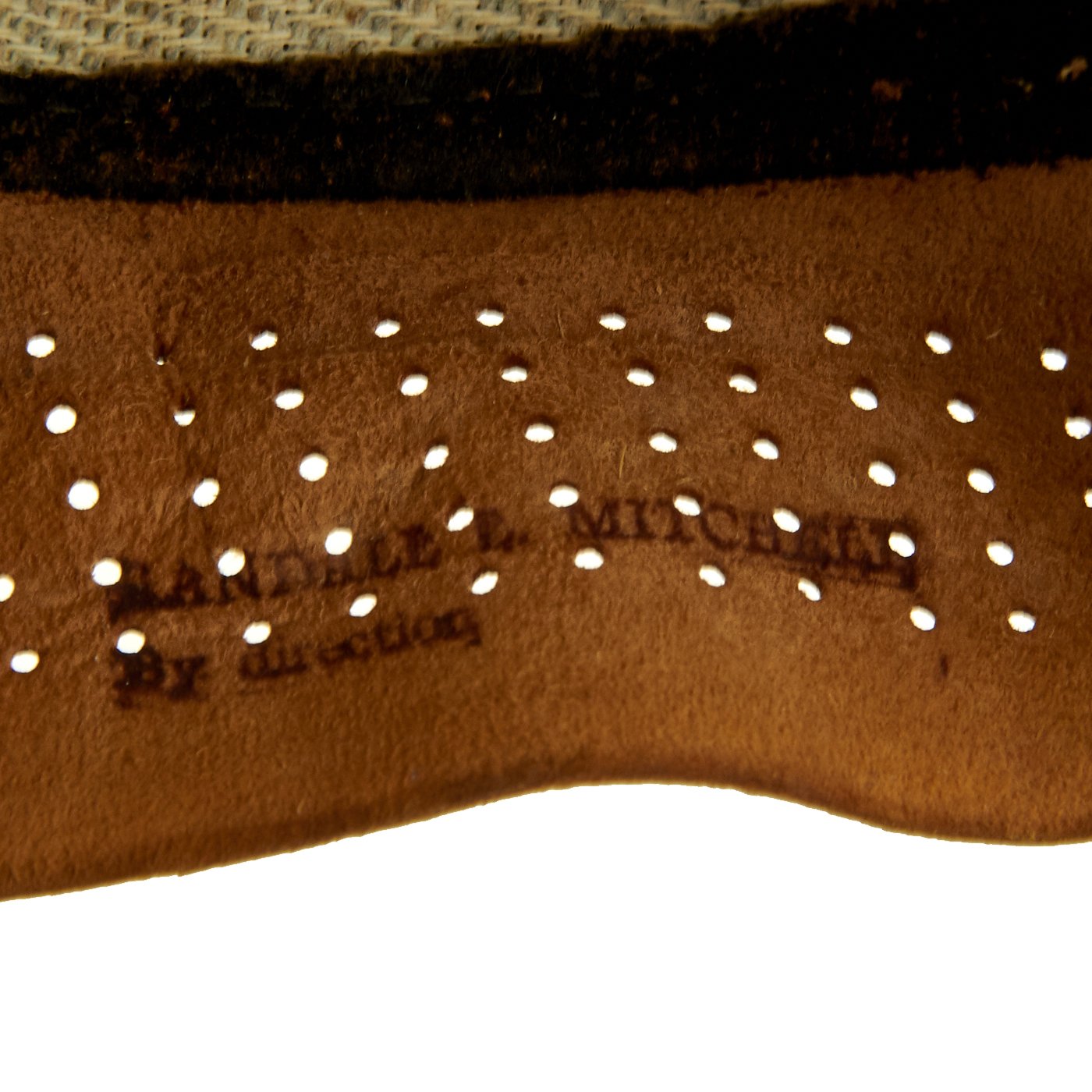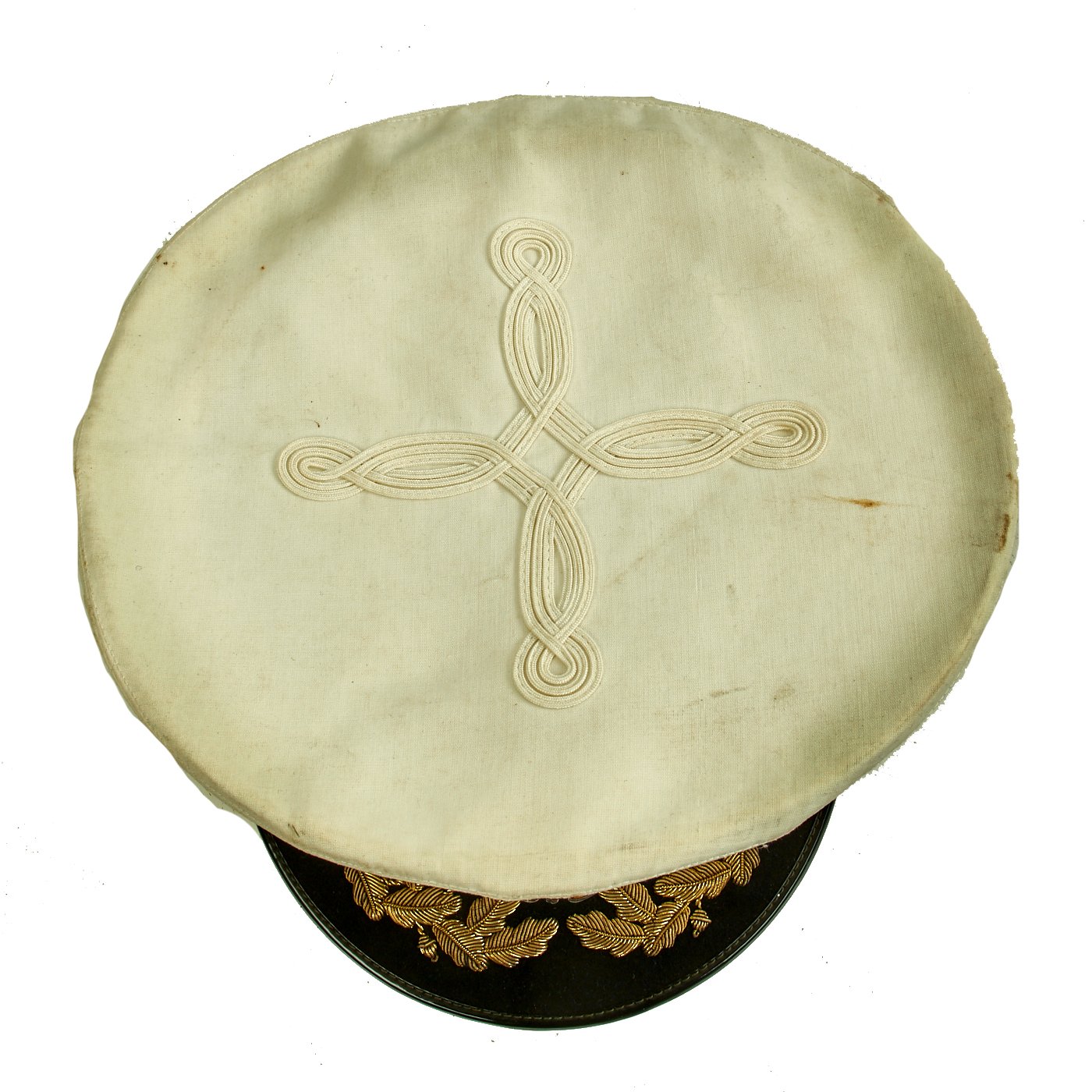 Original Item: One-of-a-kind. This is a fanatic World War Two United States Marine Corps officer white visor hat named to Major Randall Lee Mitchell (Serial# 014070). Major Mitchell was assigned to Battery K, 4th Battalion, 11th Marines, 1st Marine Division, and was WIA wounded in Action on September 16th, 1944 which was the second day of the Battle of Peleliu on the Palau Islands. The hat bear his card and an ink stamp of his name on the interior of the leather sweatband. Hat was made by Hilborn Hamburger (HH) and is offered in excellent condition. Features and officers EGA hat badge, bullion wire laurel leaf felt topped leather visor, quatrefoil and wicker frame construction. Size is US 7 1/8 (57cm). Overall condition is very good to excellent. Major Mitchell's memorial page can be seen at this link.